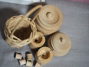 wool bale2点、カゴ、蓋付き木製壺2点、桶2点、糸巻5点のセット