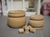 ・蓋付き木製壺は幅約6㎝・5㎝、高さ約5.8㎝・5.5㎝