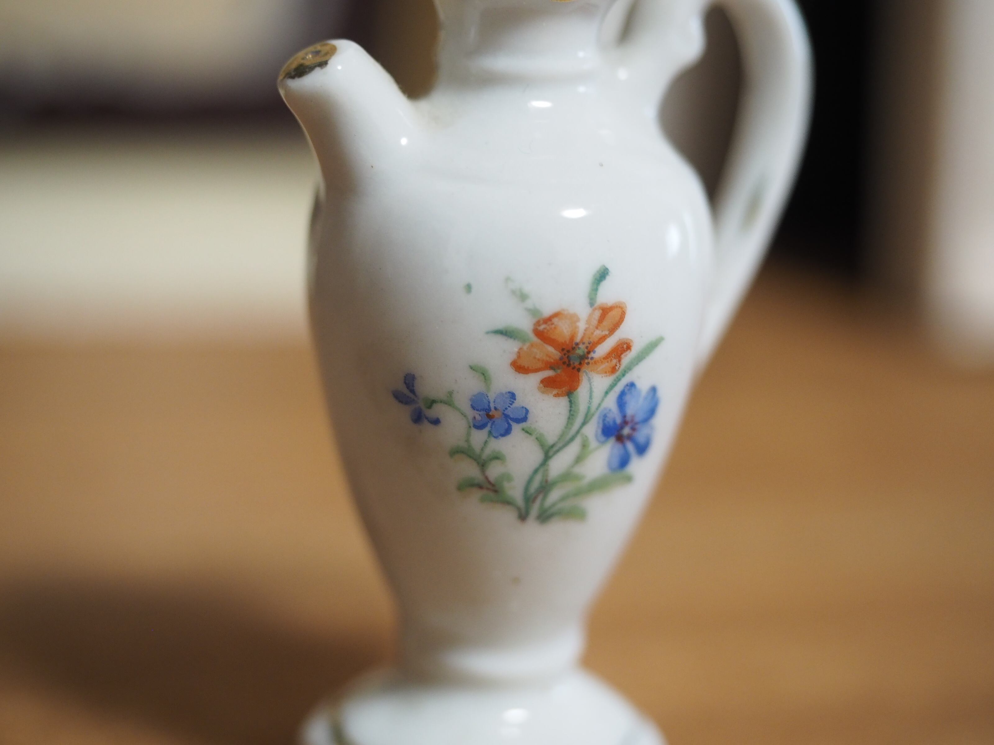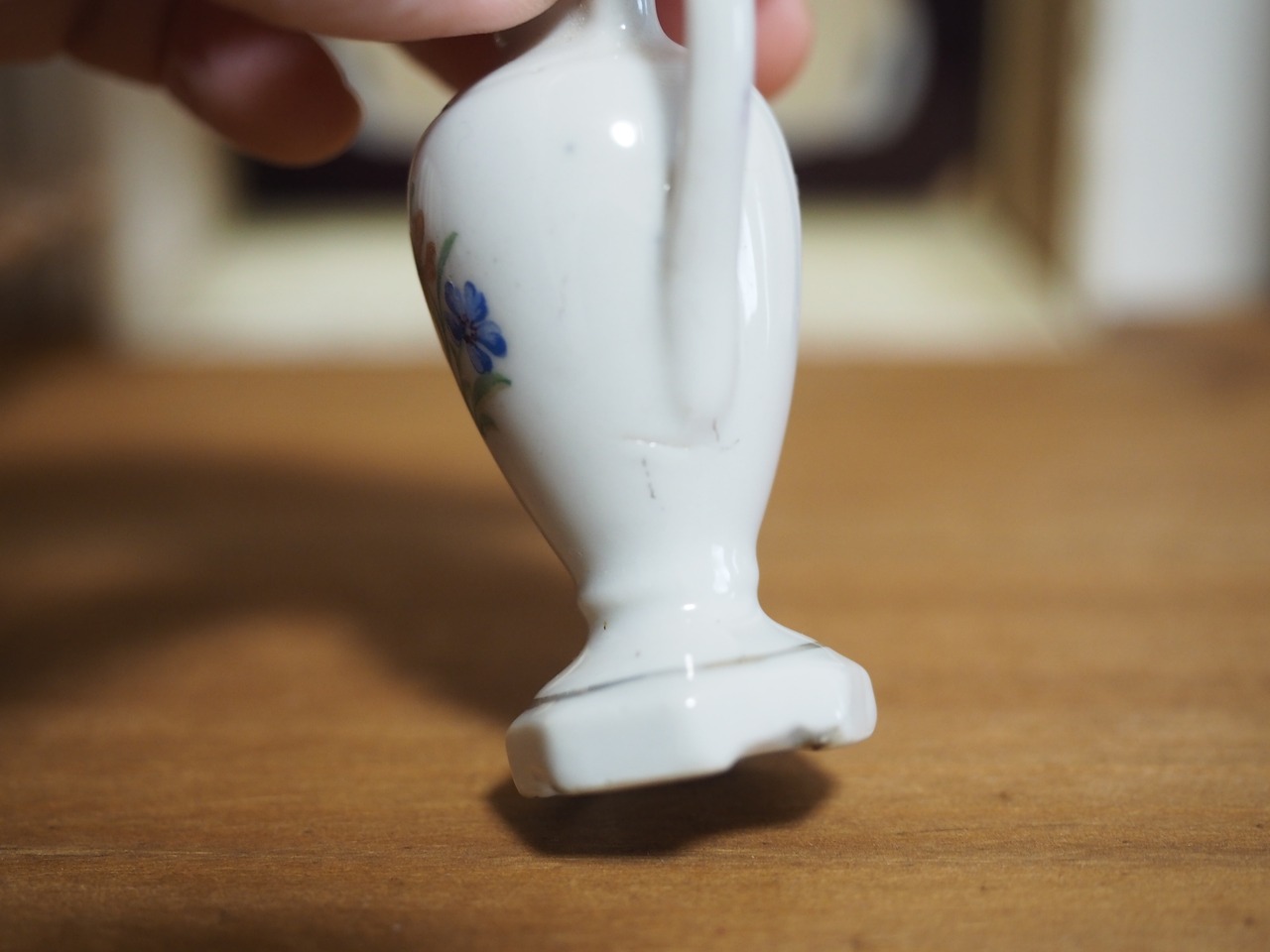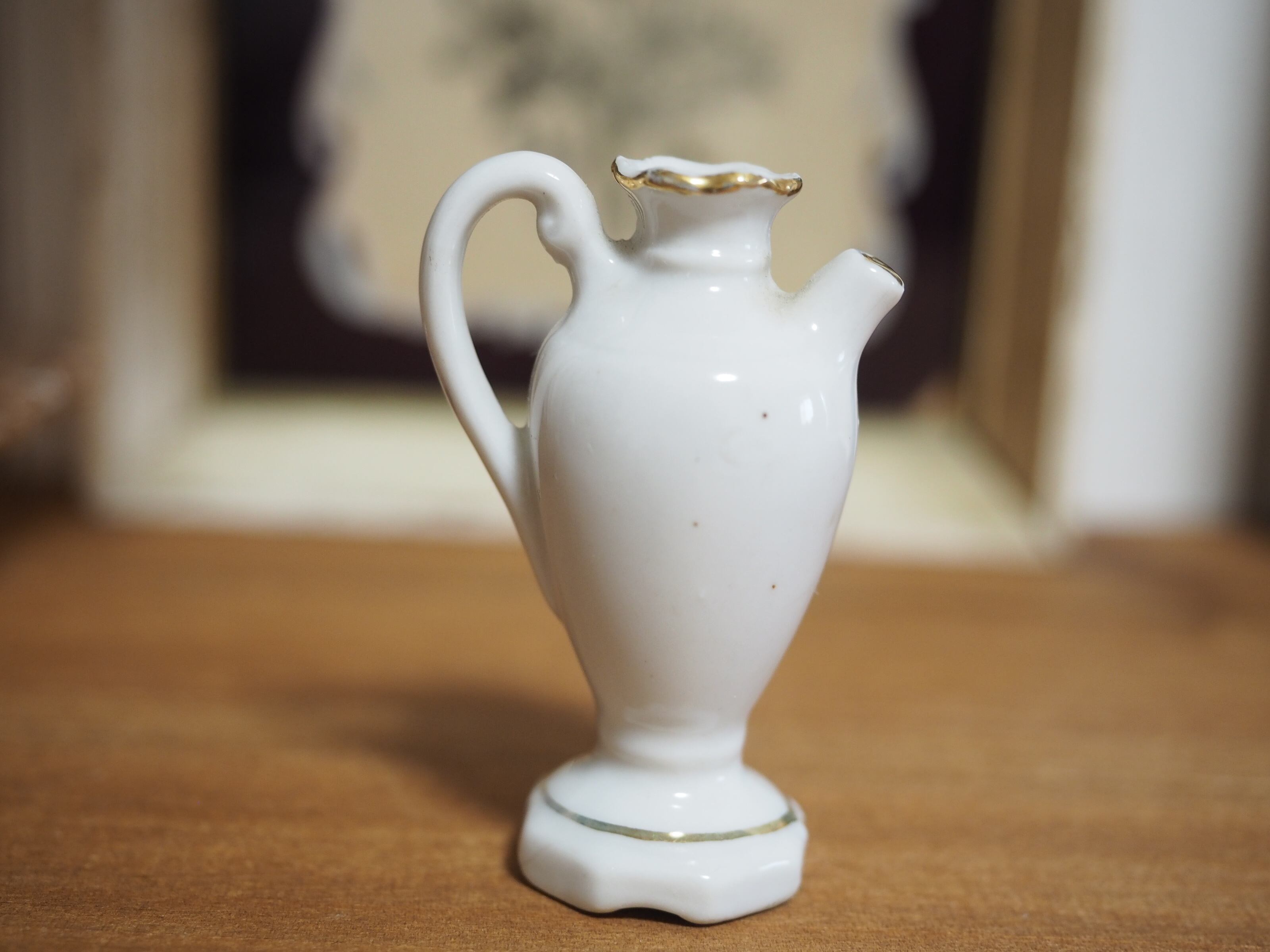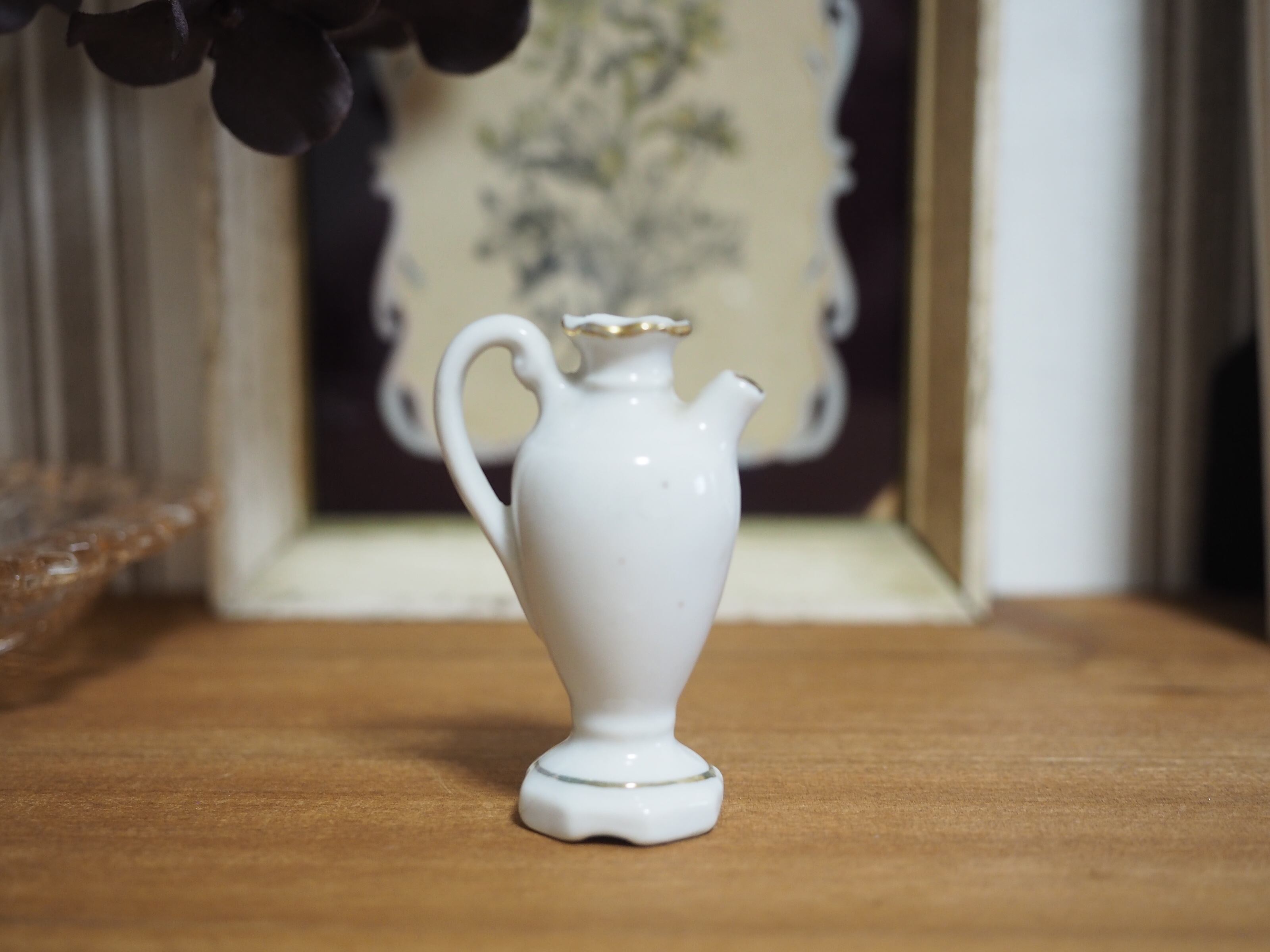 丸い形にすっと下に伸びた持ち手、ちょこんと付いた注ぎ口がかわいらしい、小さな水差し型花瓶です。