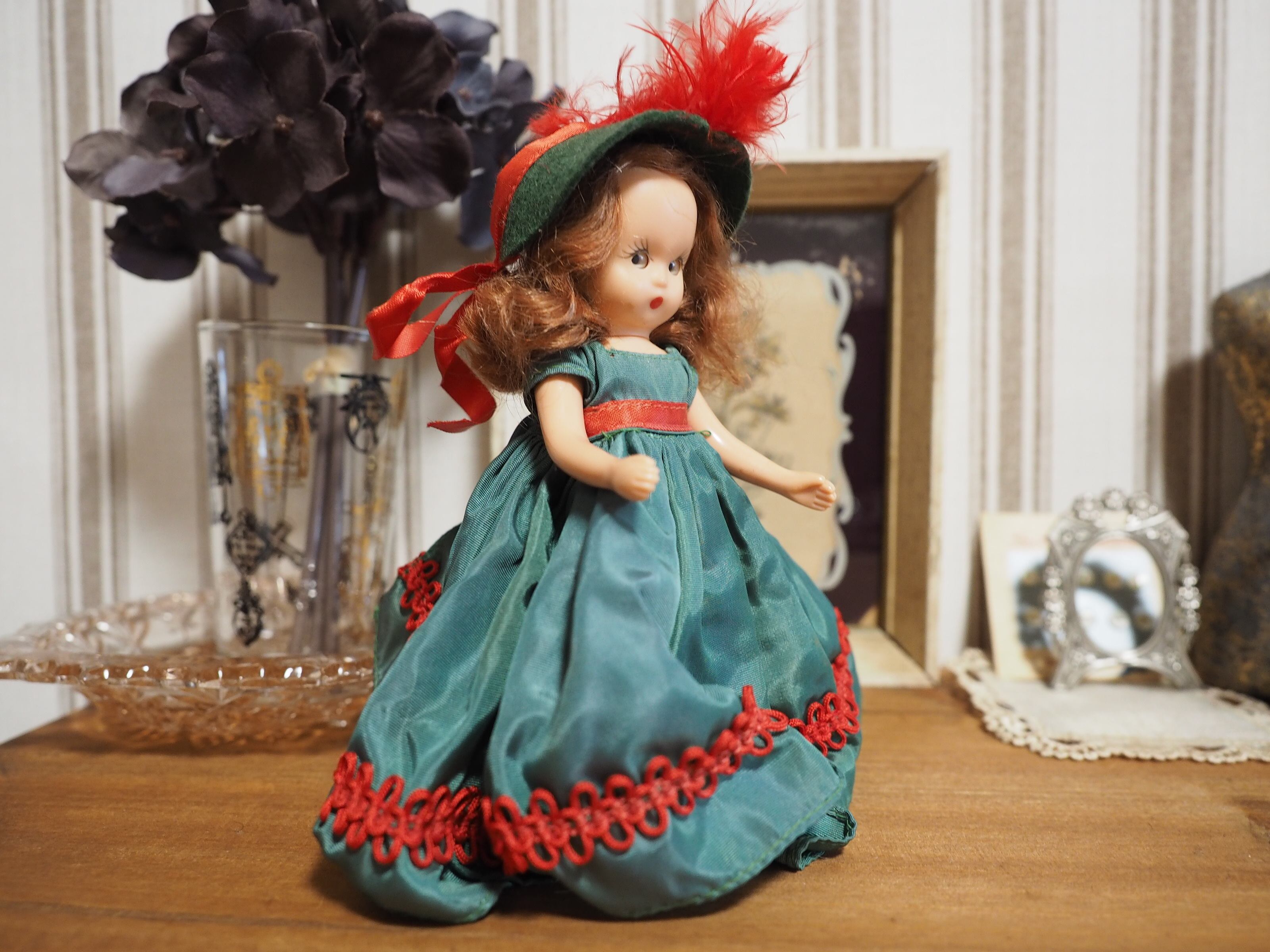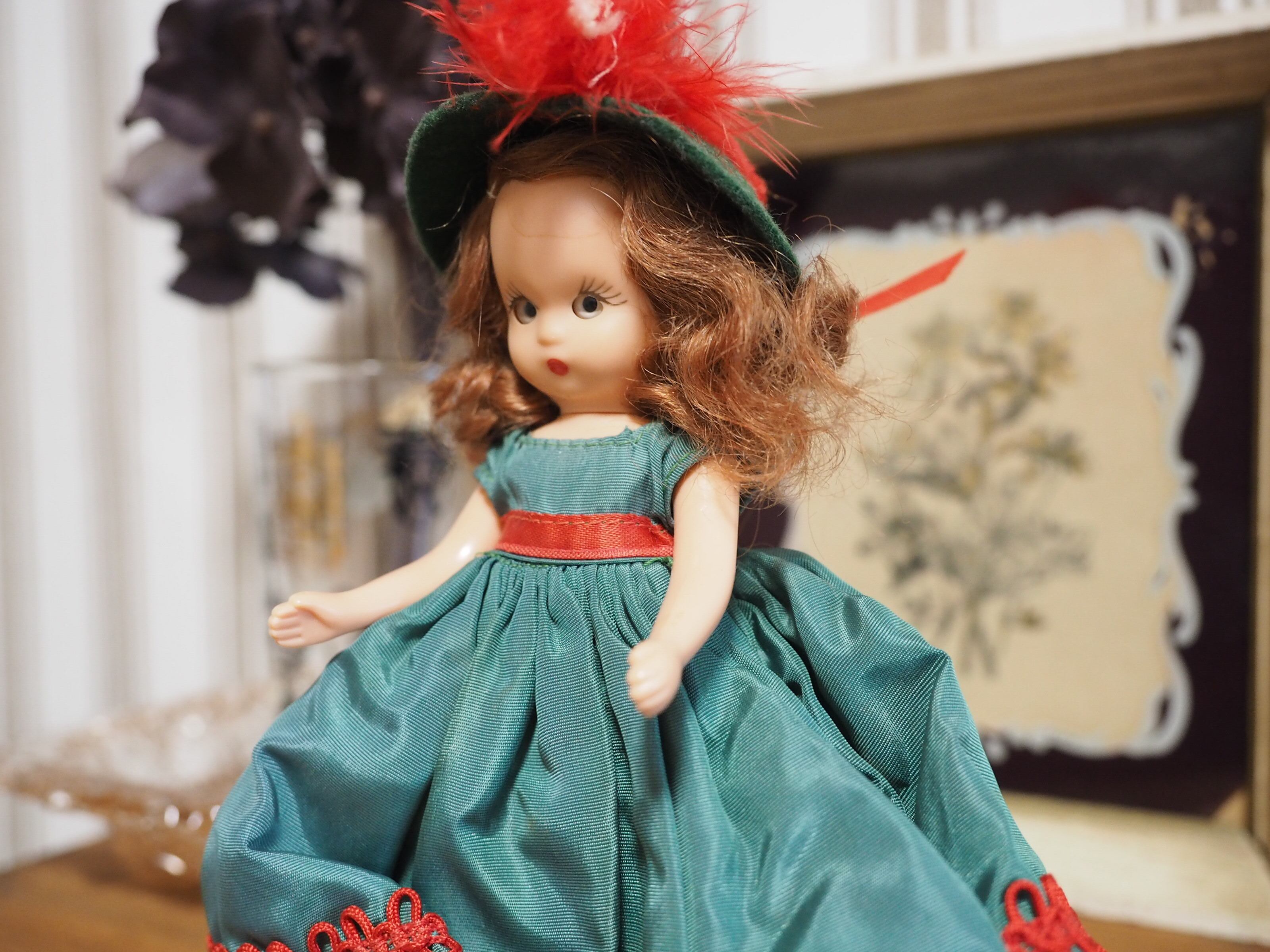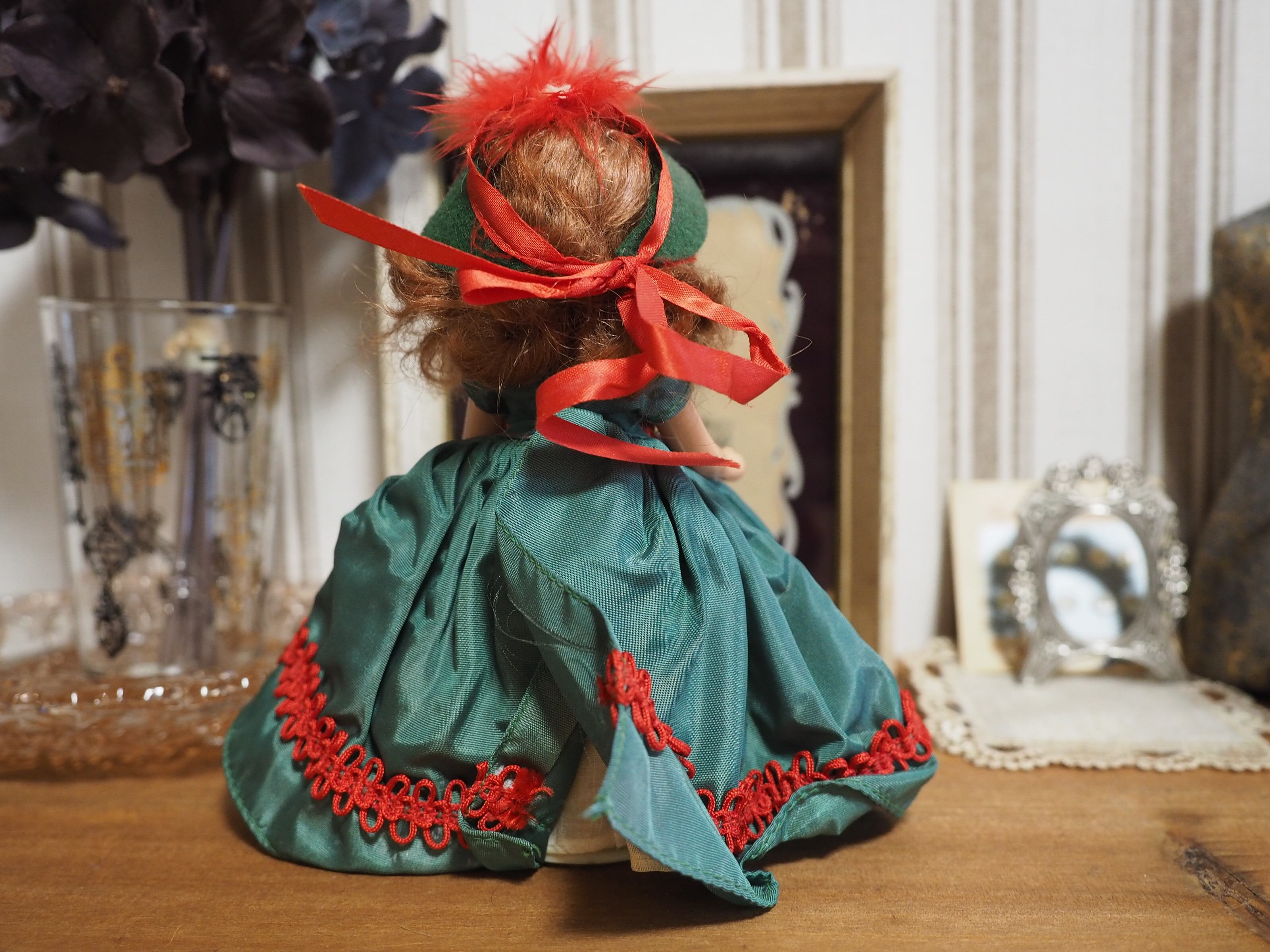 グリーンと赤ブレード羽ボネ 「Nancy Ann Story Book Doll」スタンド付き(おでこ変色あり)