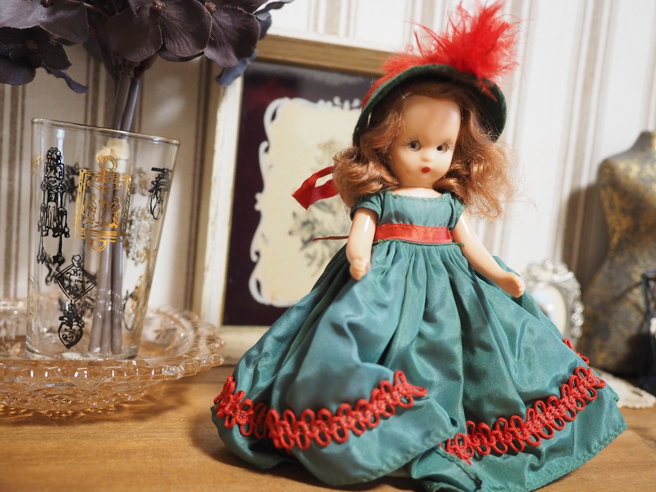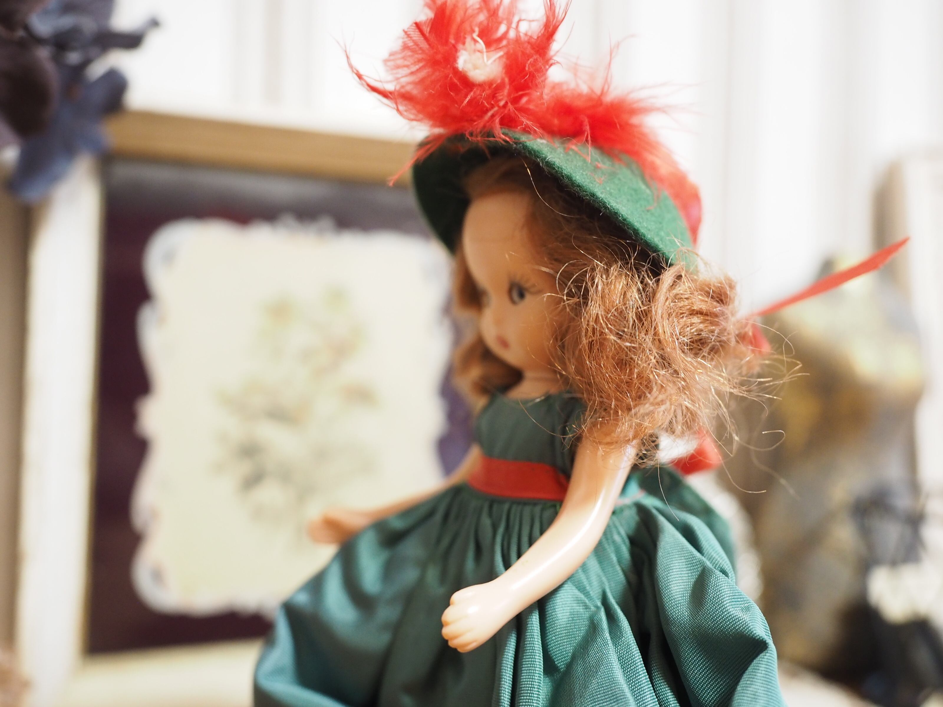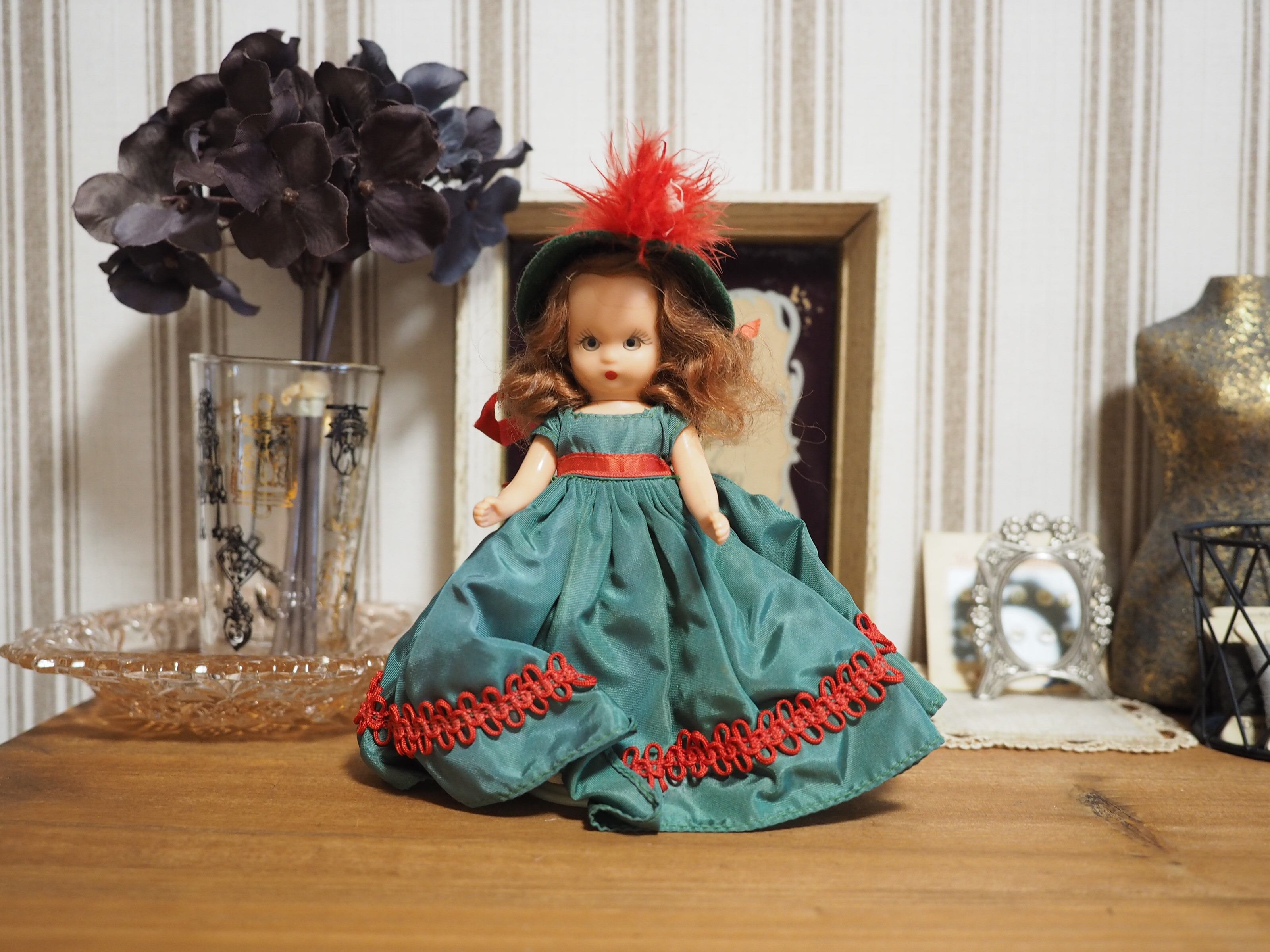 グリーンと赤ブレード羽ボネ 「Nancy Ann Story Book Doll」スタンド付き(おでこ変色あり)