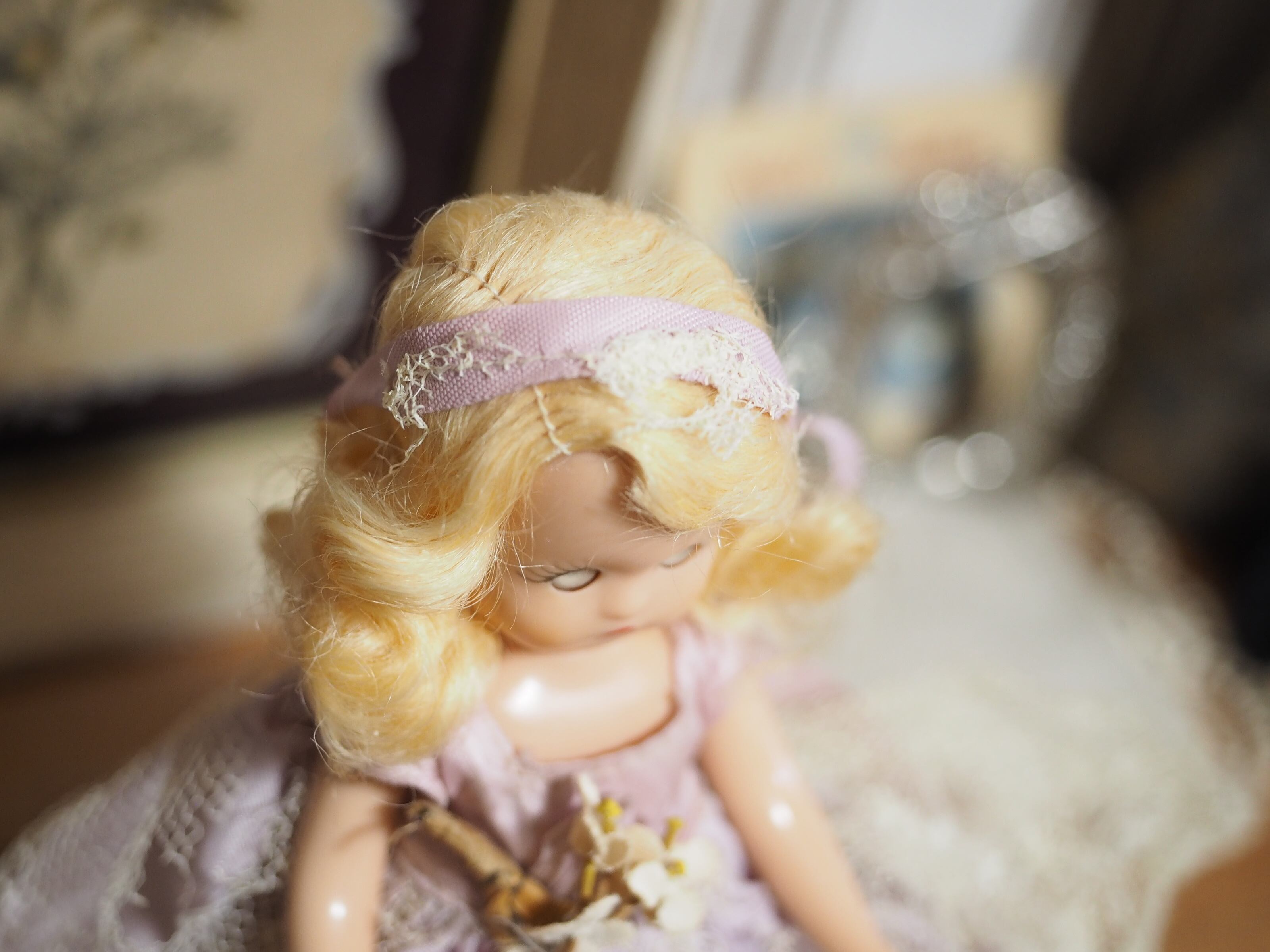 薄パープル布花ドレス 「Nancy Ann Story Book Doll」(プリント崩れあり)スタンド付き