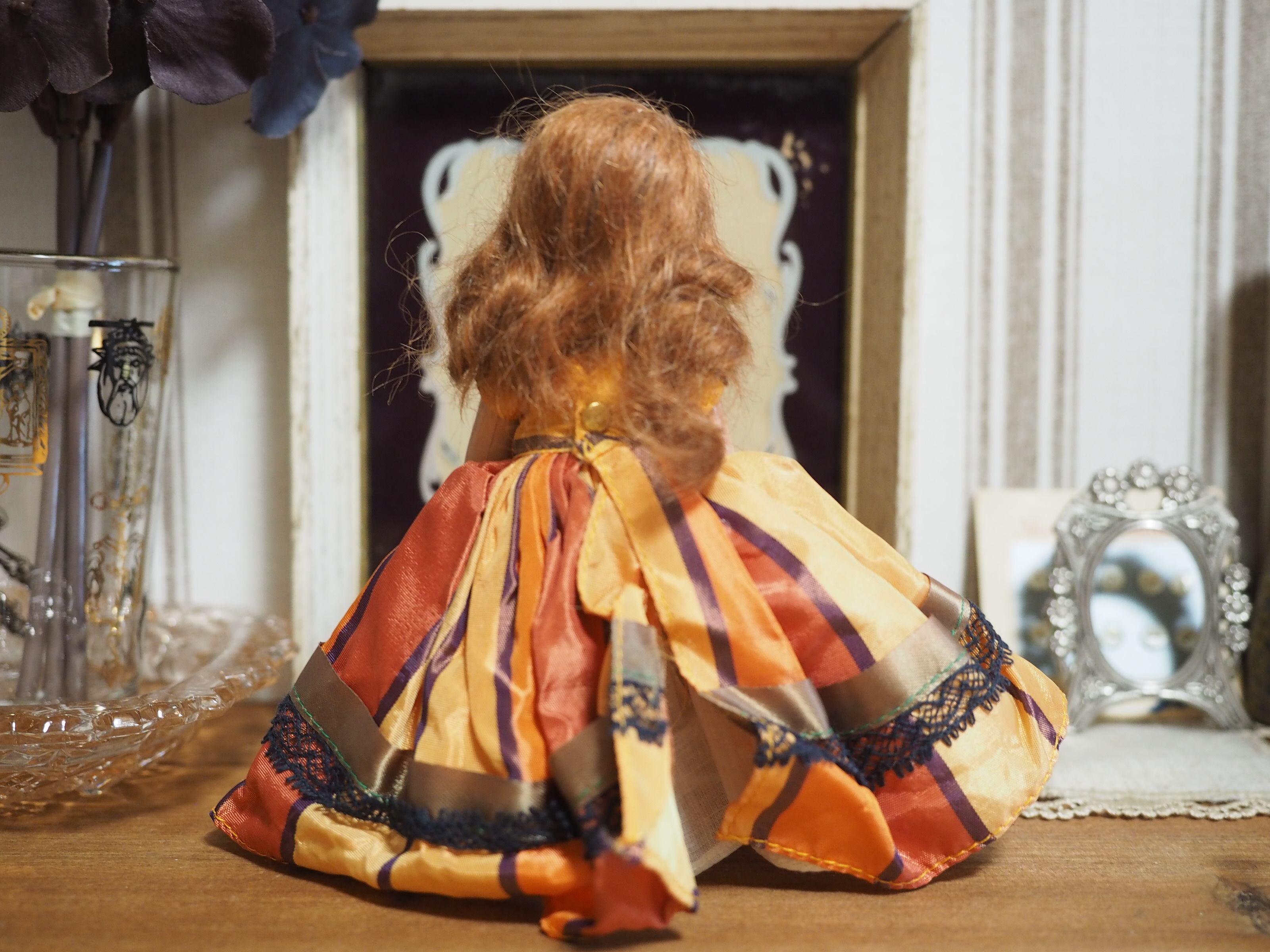 オレンジの濃淡ストライプと淡いグリーンとブラックのレースが素敵なドレス、グリーンのフェルトボネのナンシー・アンです。