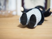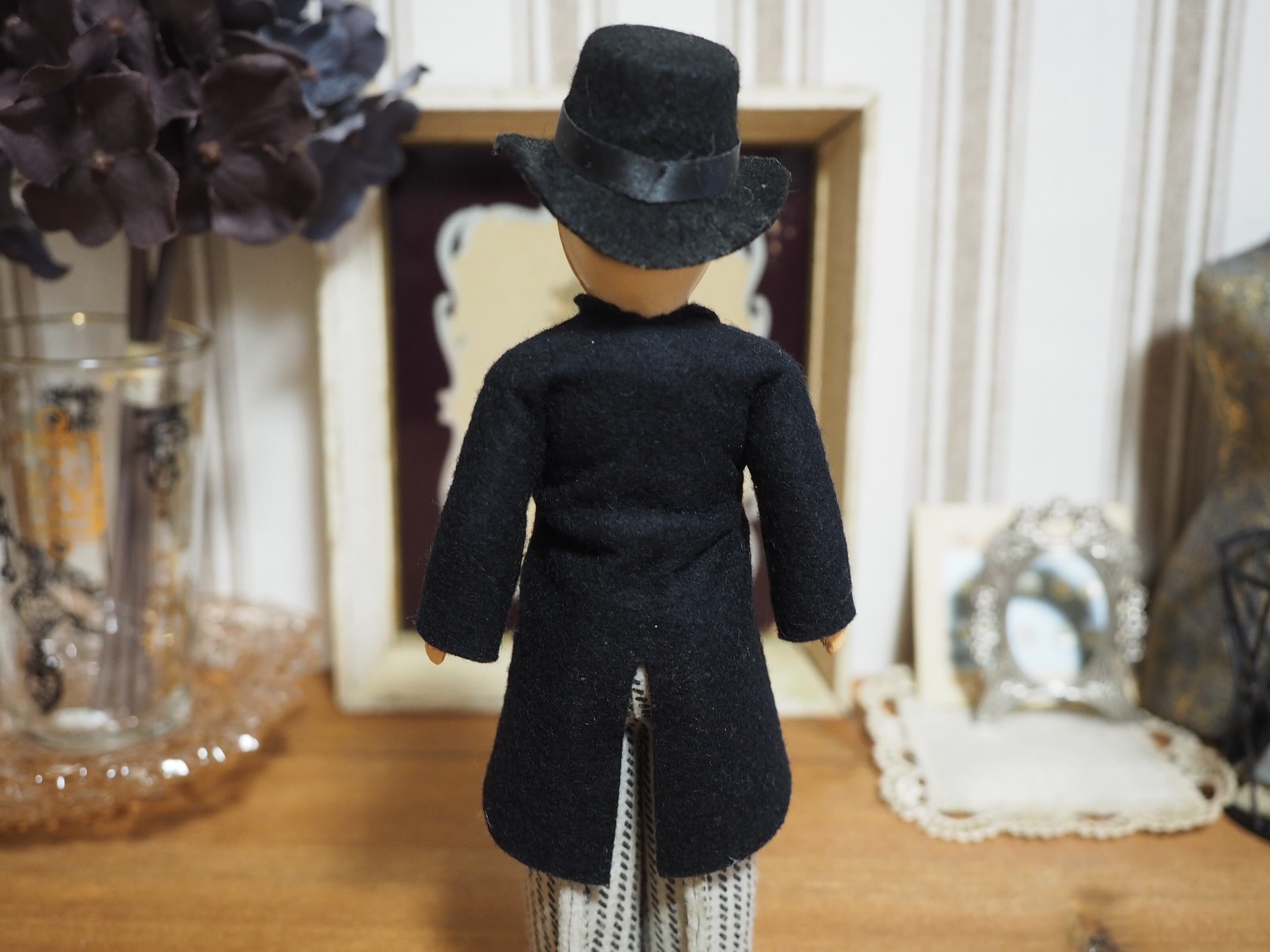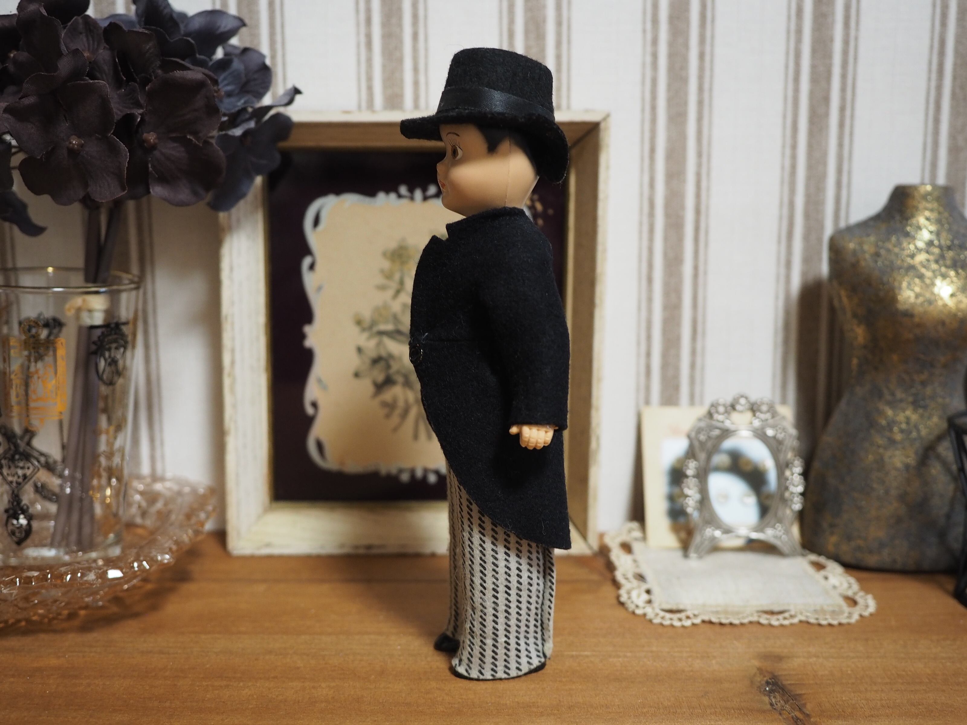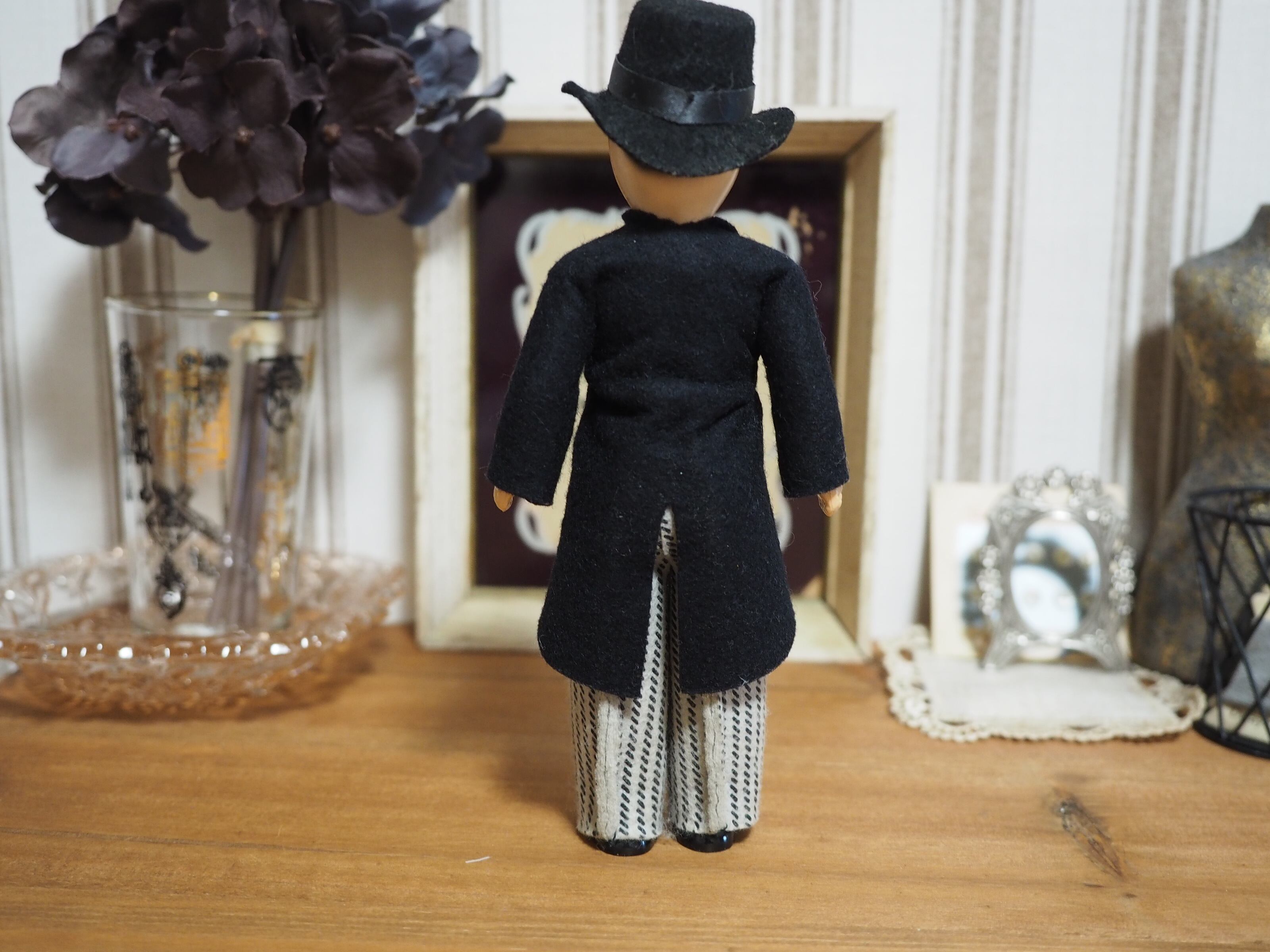 グレーのパンツとタイ、ちらりと白いベストも見えています。お腹部分は金属ピンで留められていて脱ぐことは出来ません。