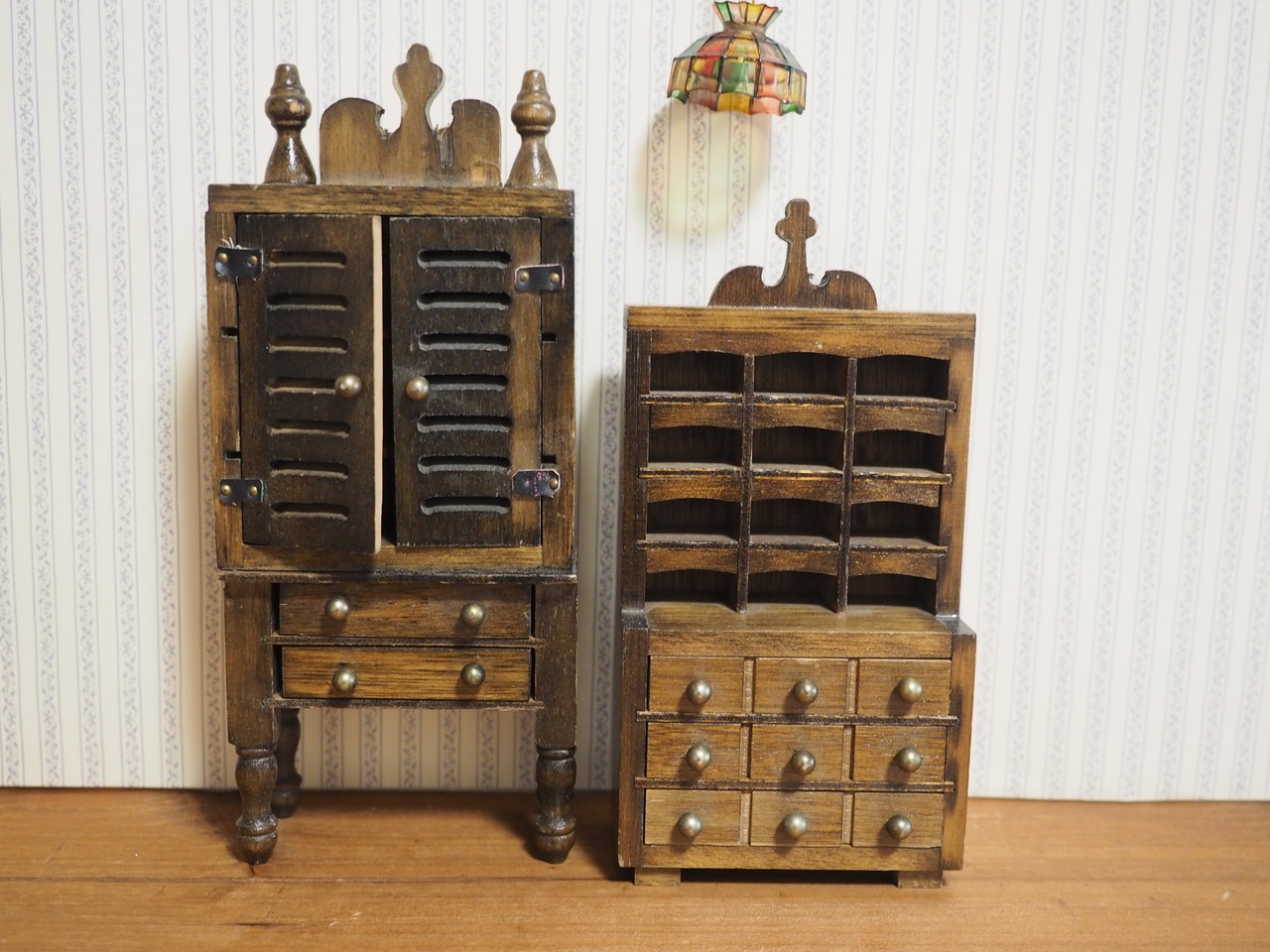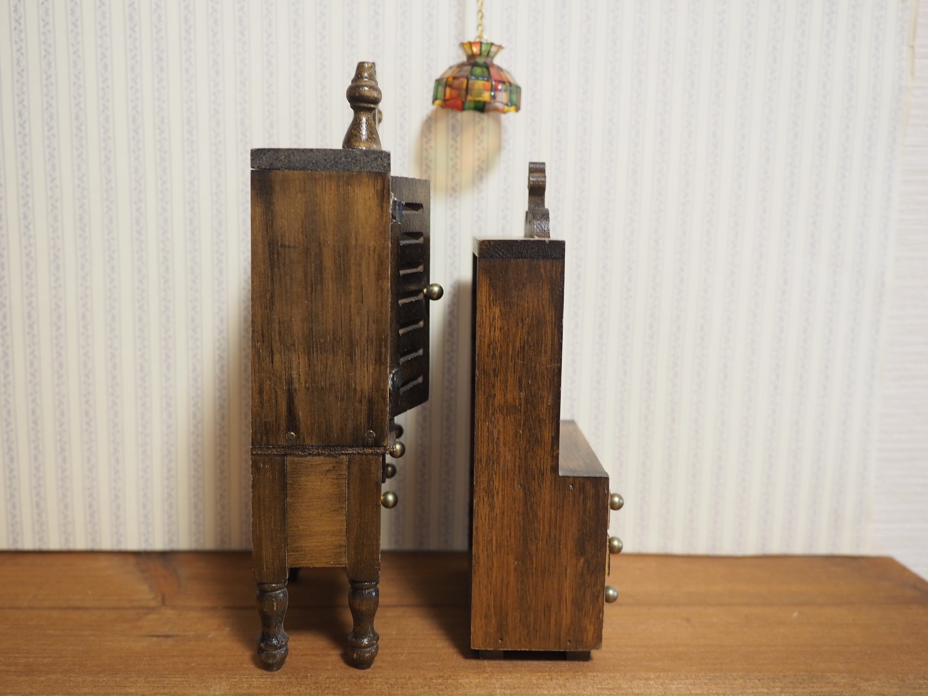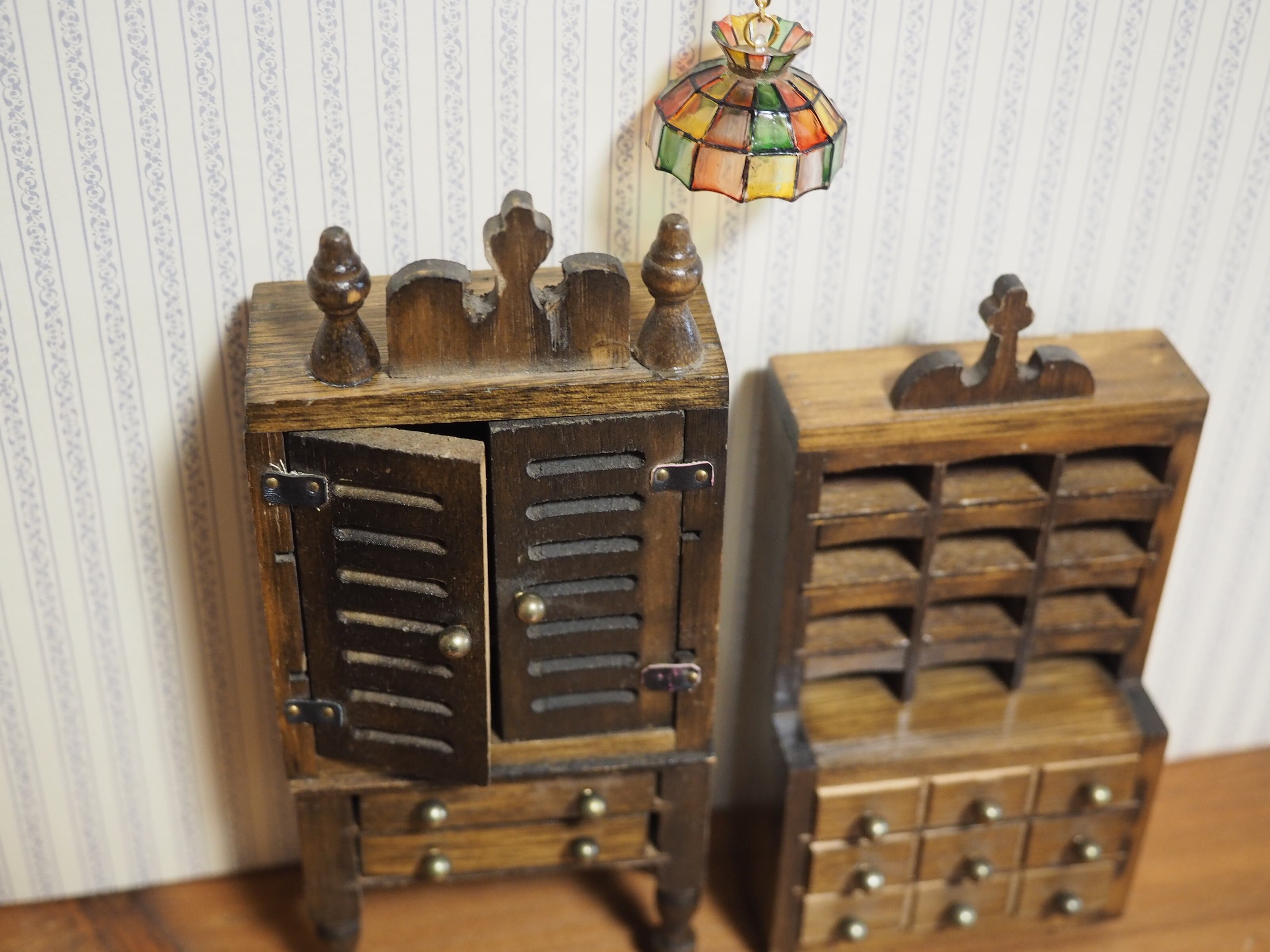 ビンテージなデザインに焦がしたような色合い、メルスリーショップのような小物付きの木製家具セットです。画像1枚目のランプシェード・小物付き