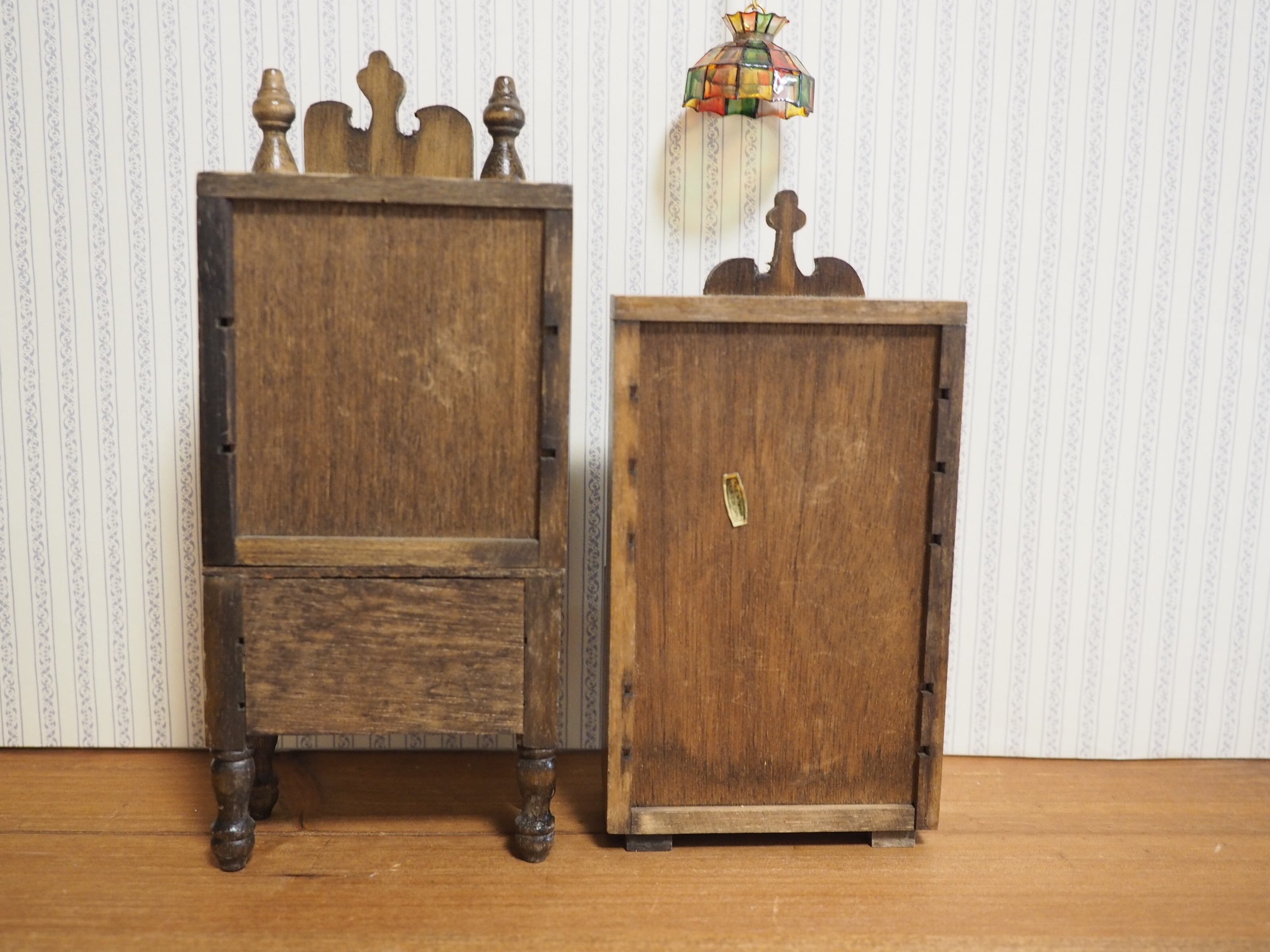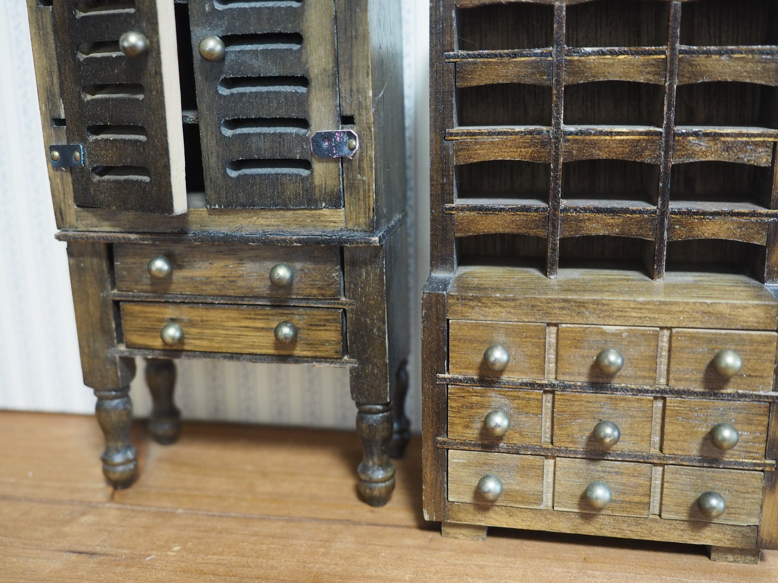 扉付きチェスト約8.8×5×21㎝、3段引き出しチェスト約9×5.5×18㎝、机約15.5×5.3×6.3㎝、チェア約7.5×6.5×8㎝