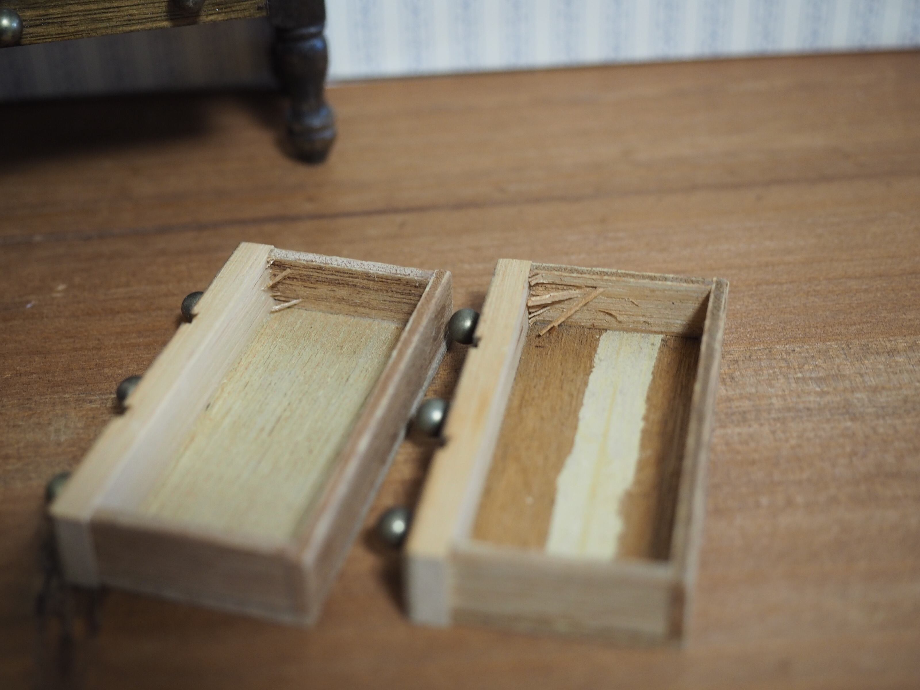3個並んだ引き出しは1段ずつになっています。引き出し内部に割れた木のささくれがありますのでご注意ください。