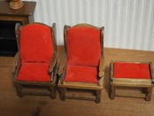 落ち着いた木の色とブラックの暖炉と、椅子の赤い起毛素材とで温かみのある雰囲気の木製家具セットです。