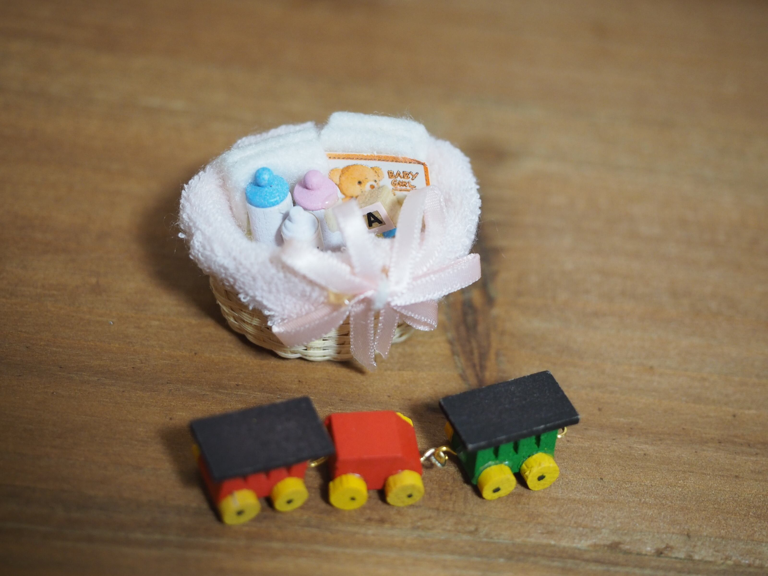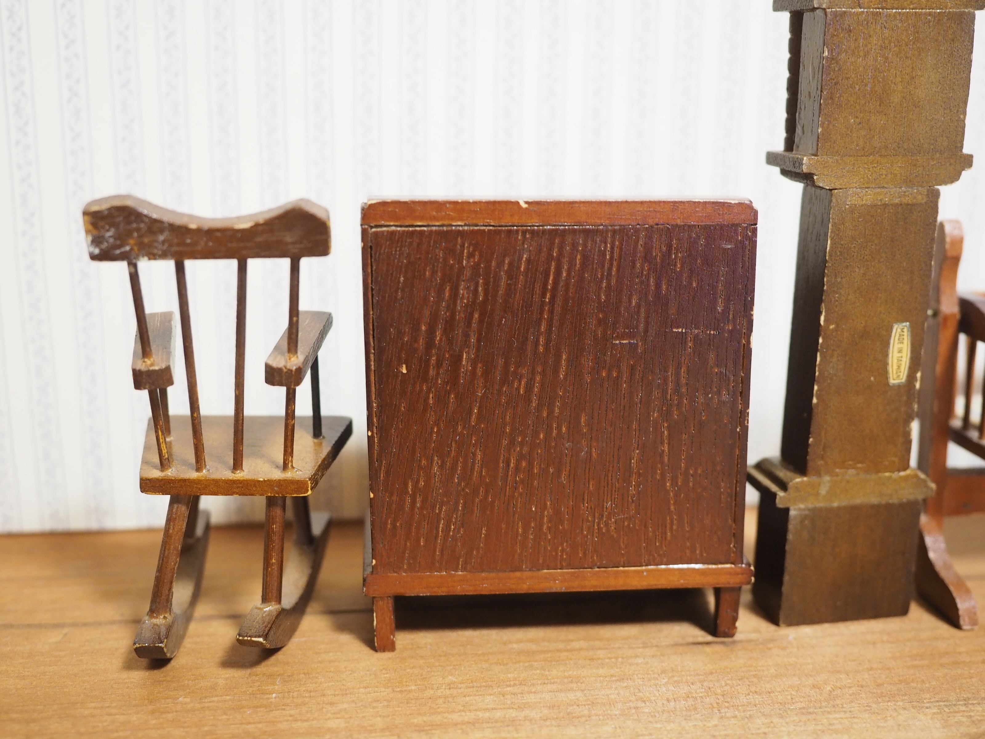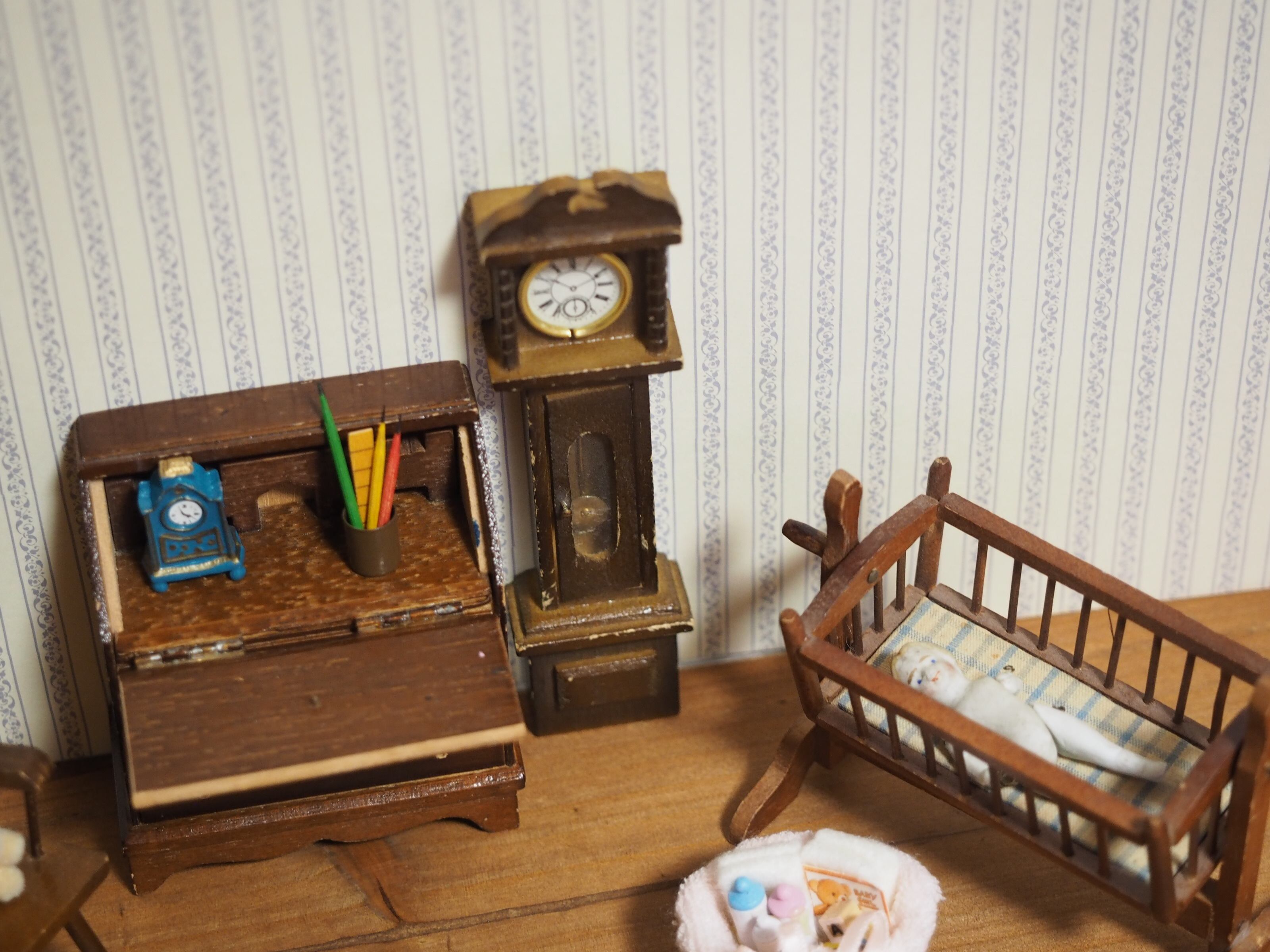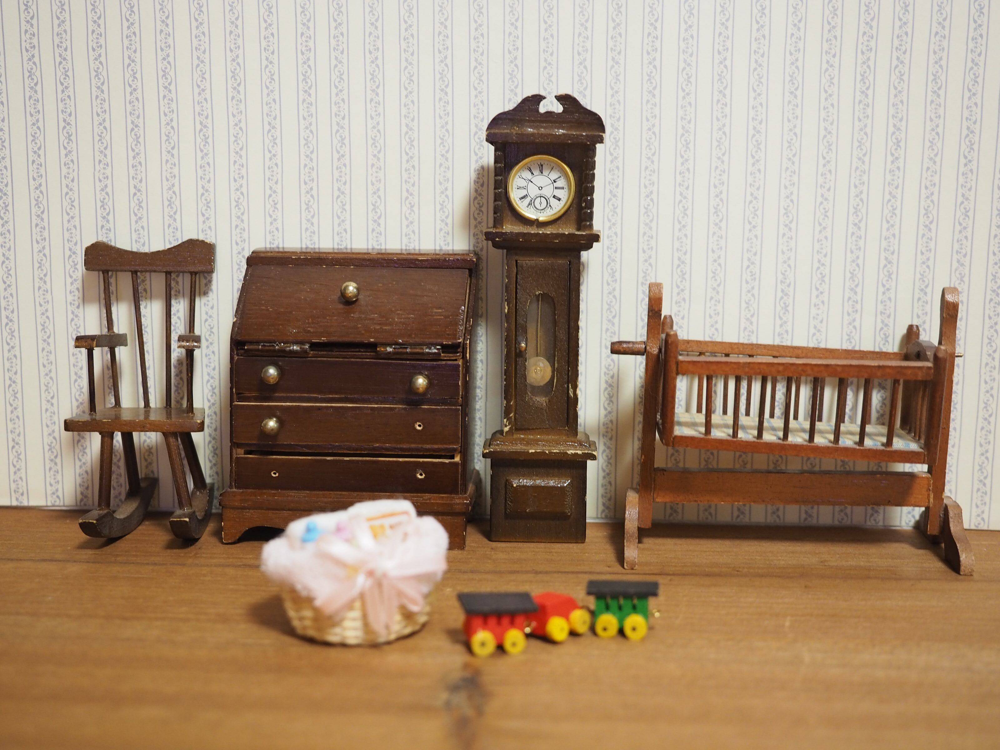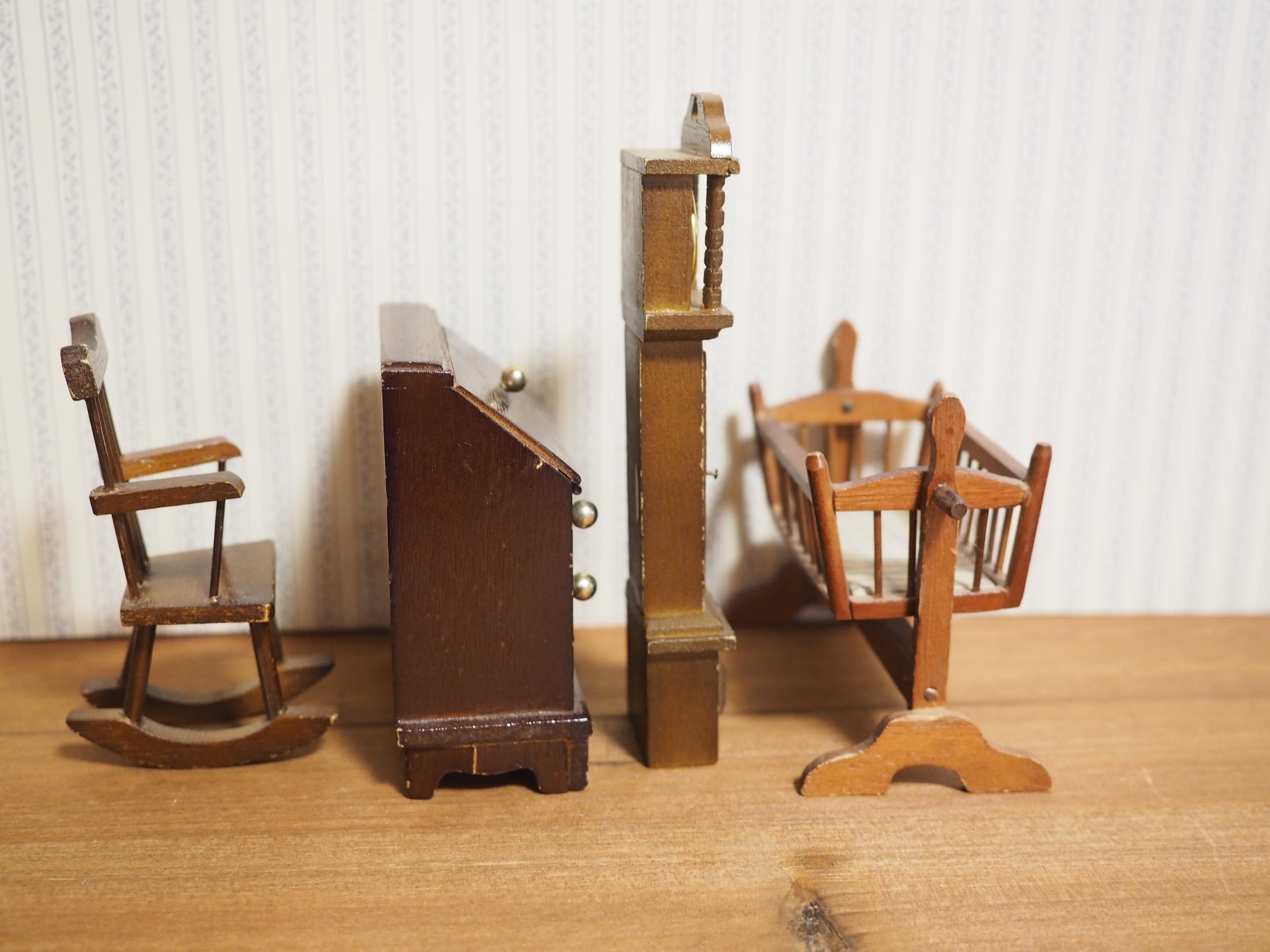 揺りかご約10.5×5.5×8.6㎝、ビューロー約8.2×4.5×9.5㎝、揺り椅子約4.5×6×10㎝、時計約3.8×2×14.5㎝