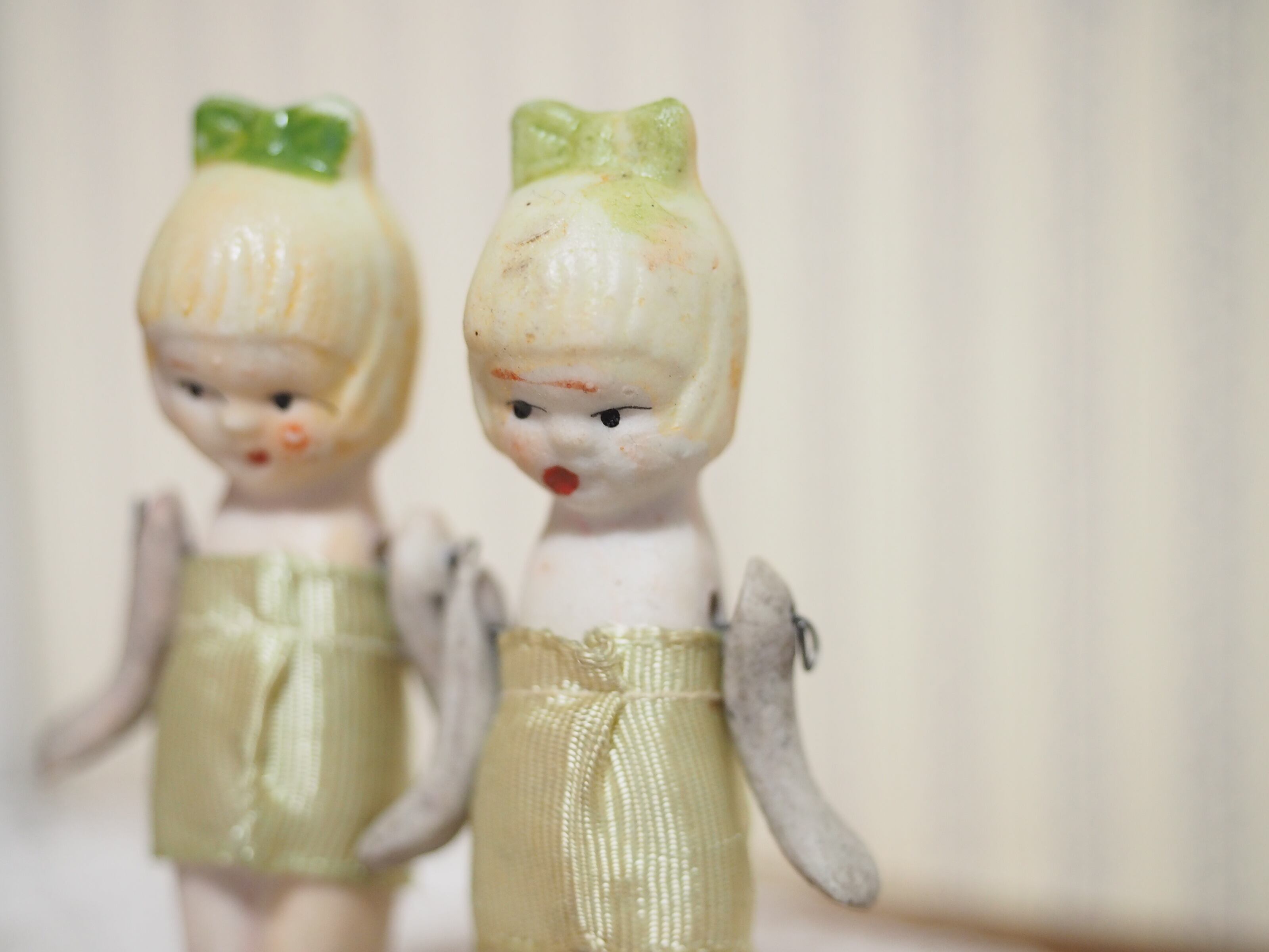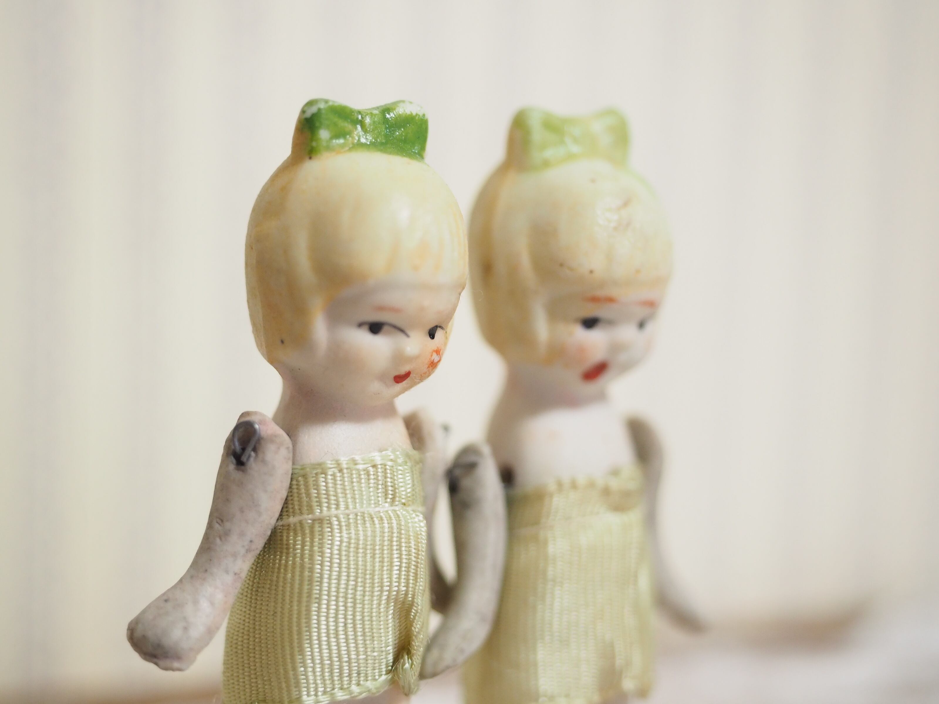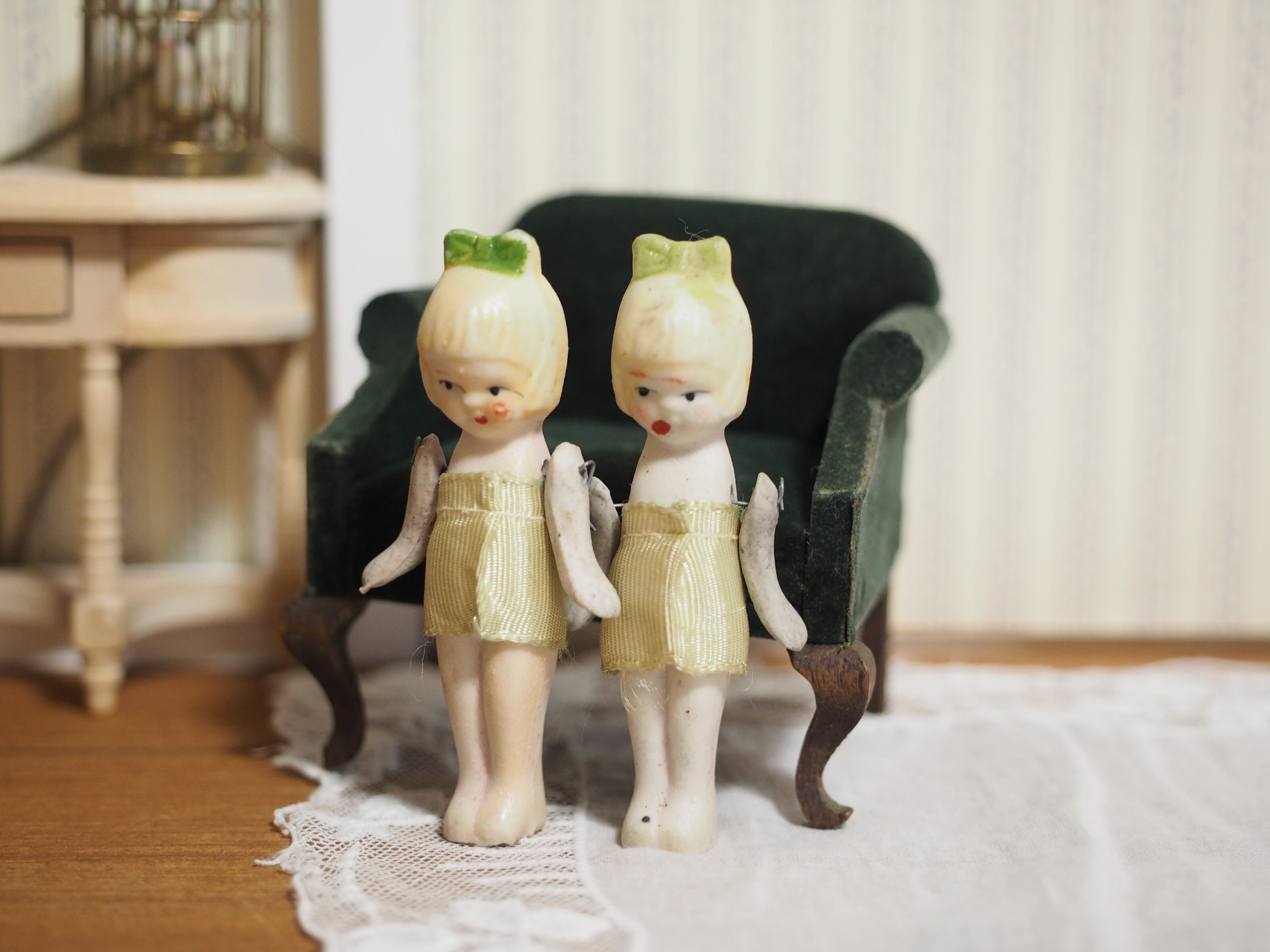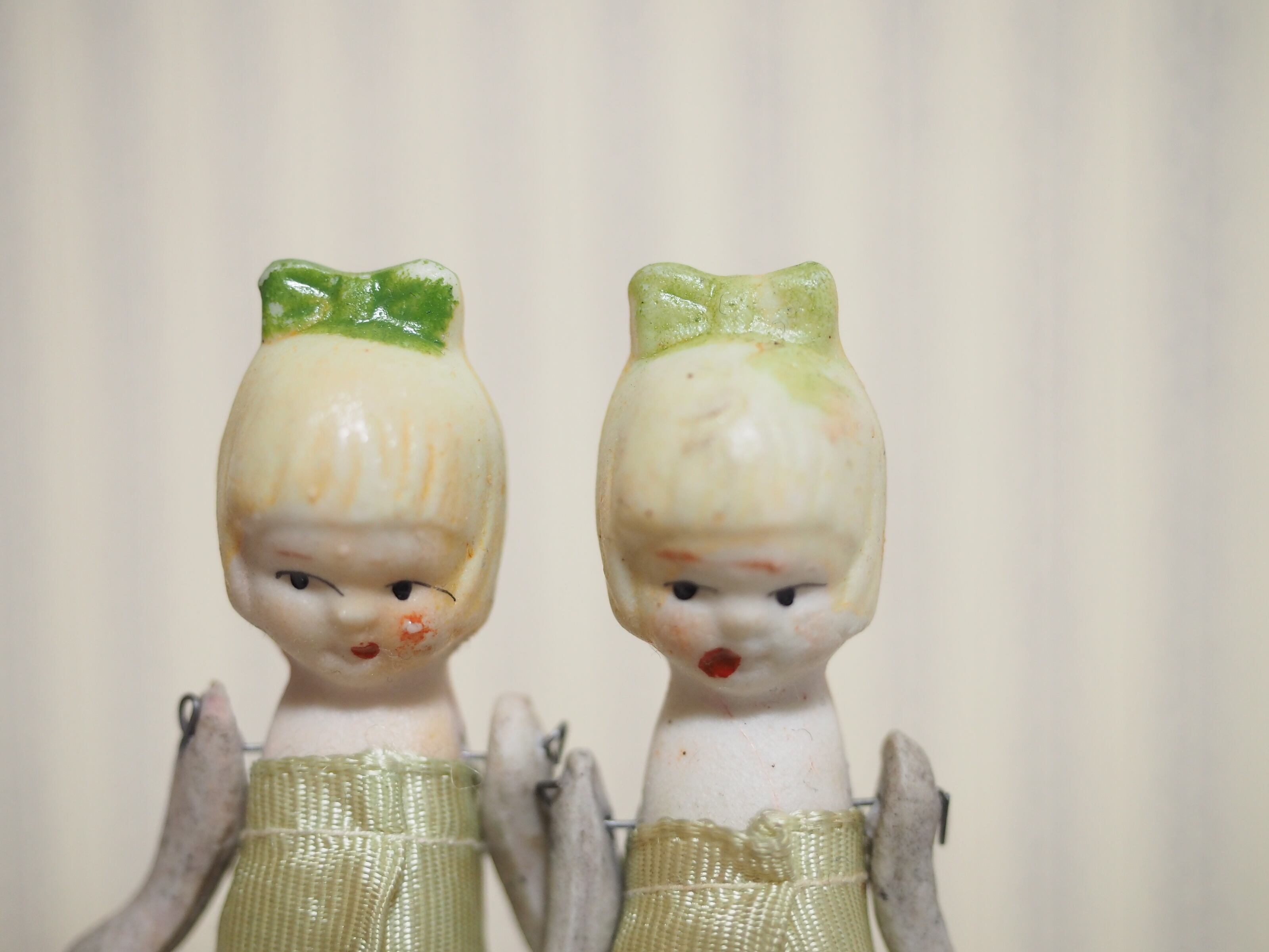おかっぱのようなヘアスタイルに黄緑リボン、淡いグリーンのお揃い服のかわいい双子ドールです。