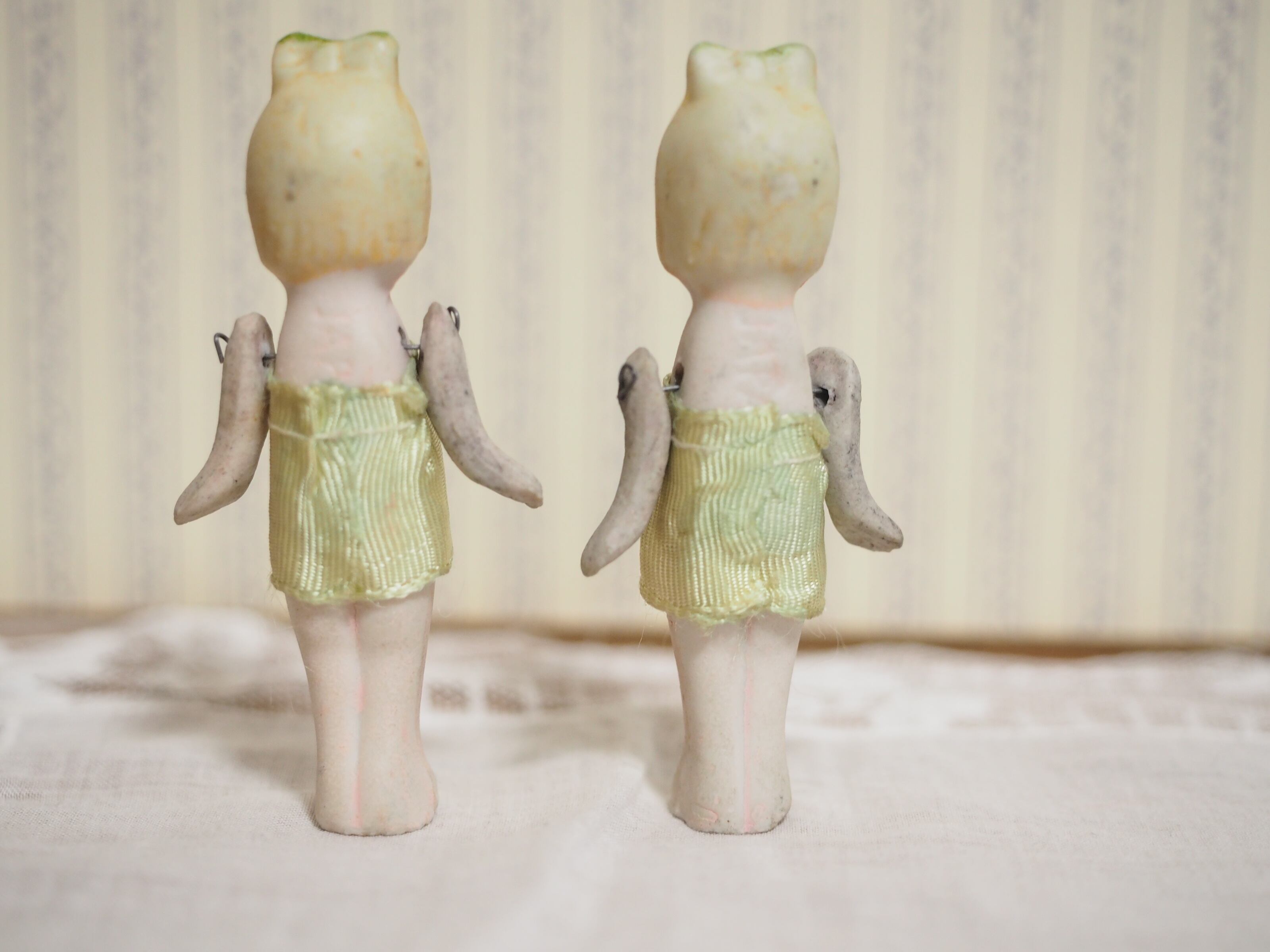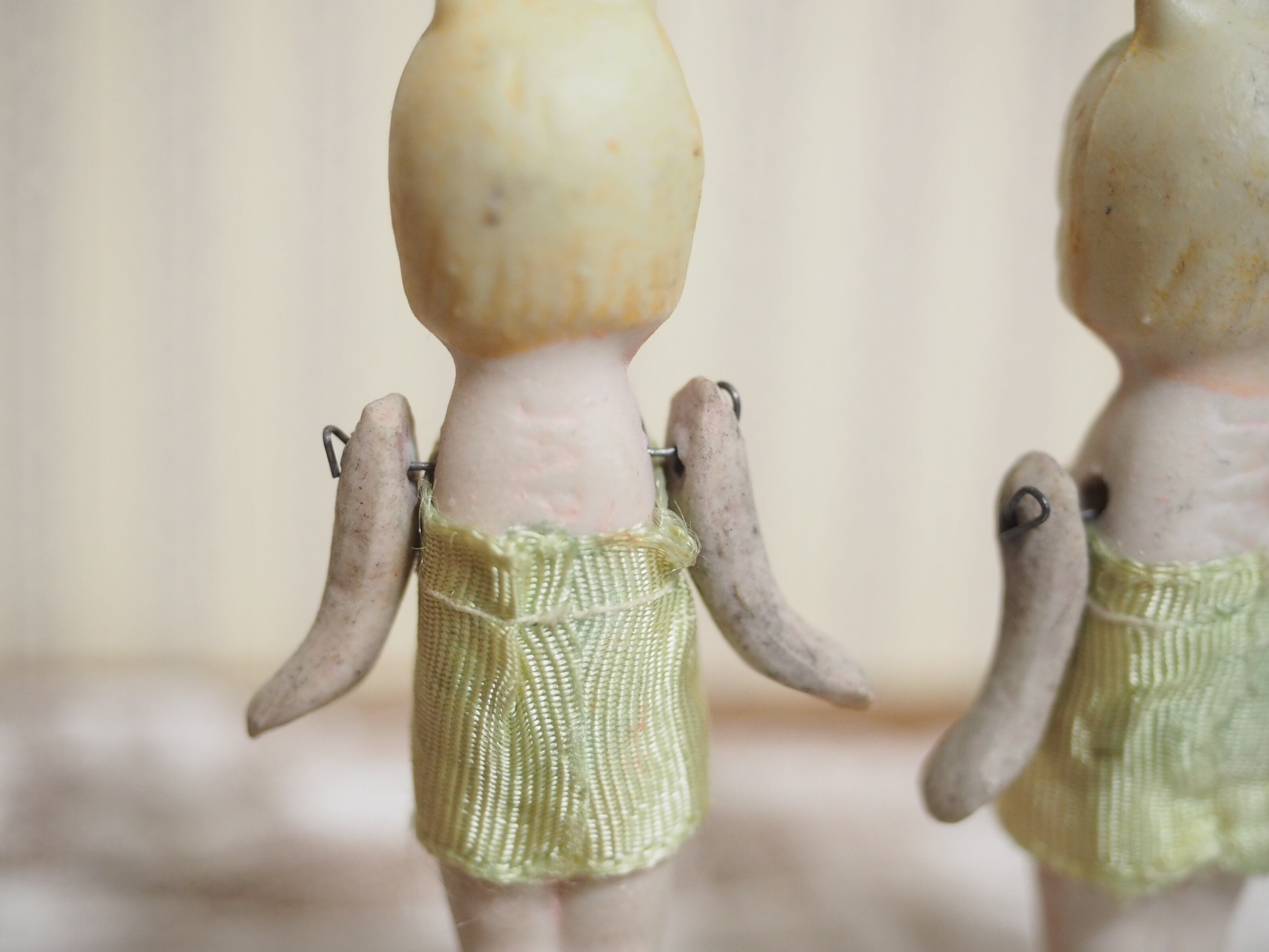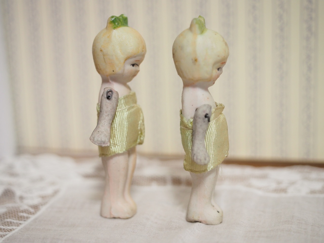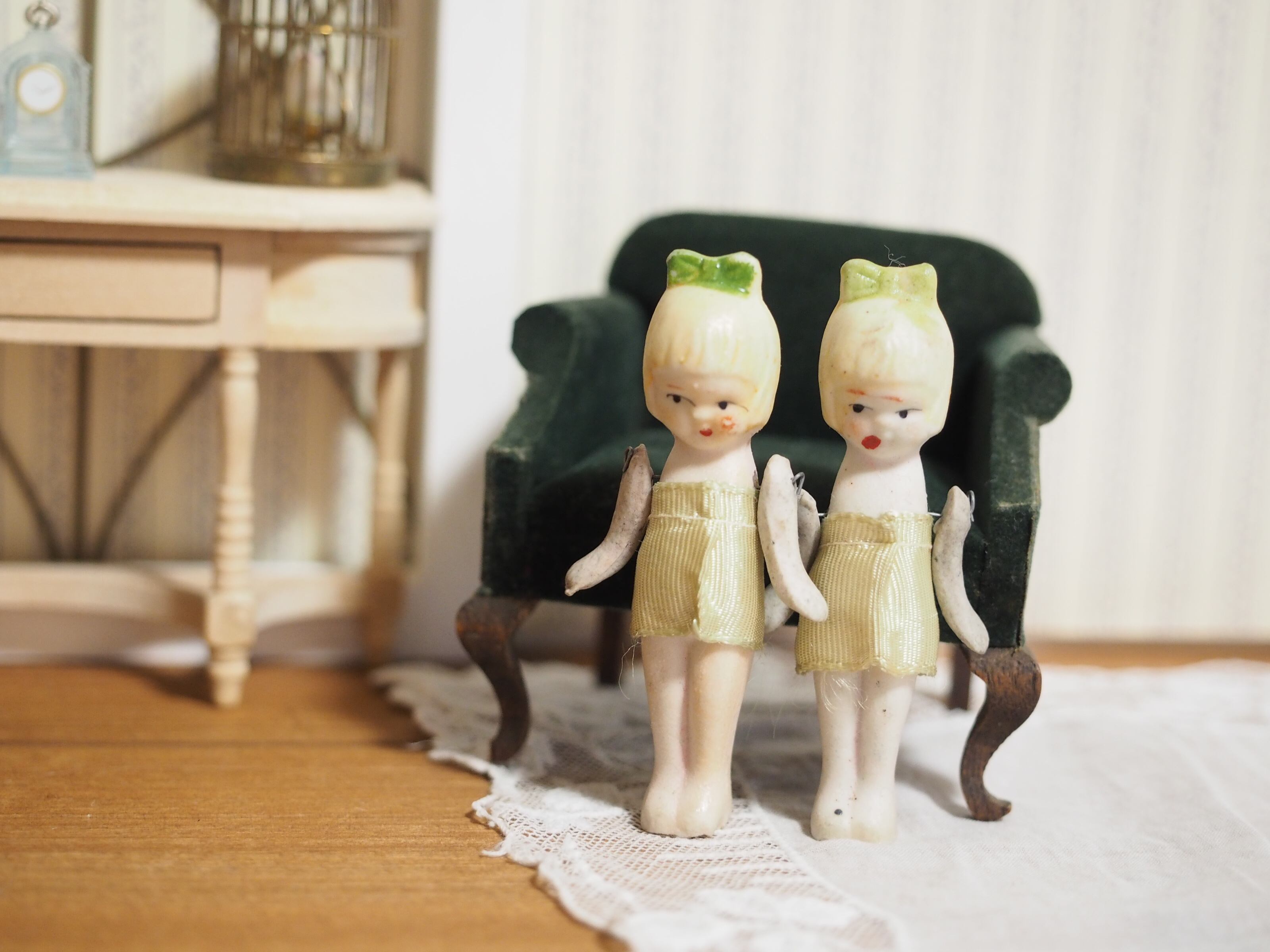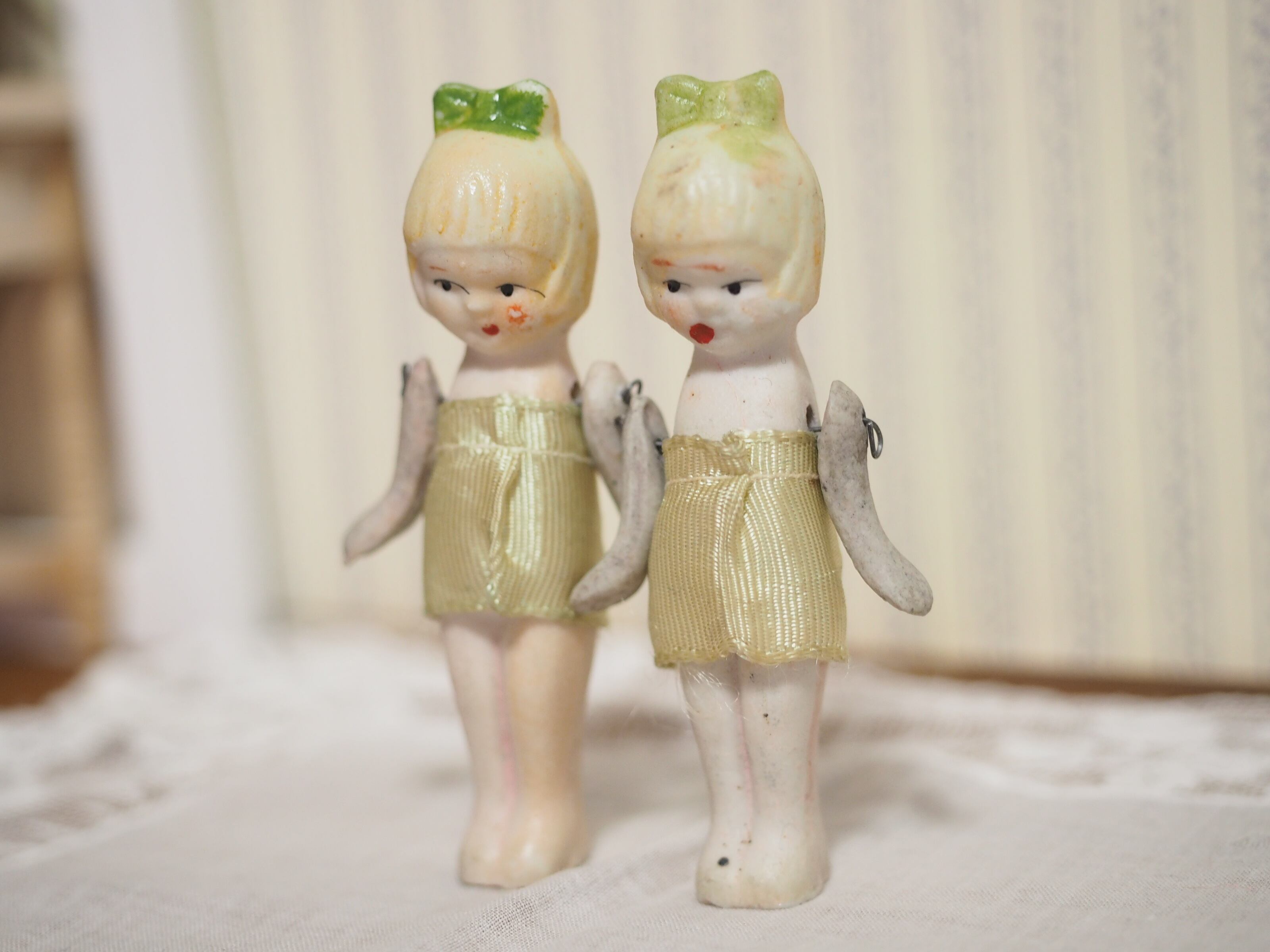 おかっぱのようなヘアスタイルに黄緑リボン、淡いグリーンのお揃い服のかわいい双子ドールです。