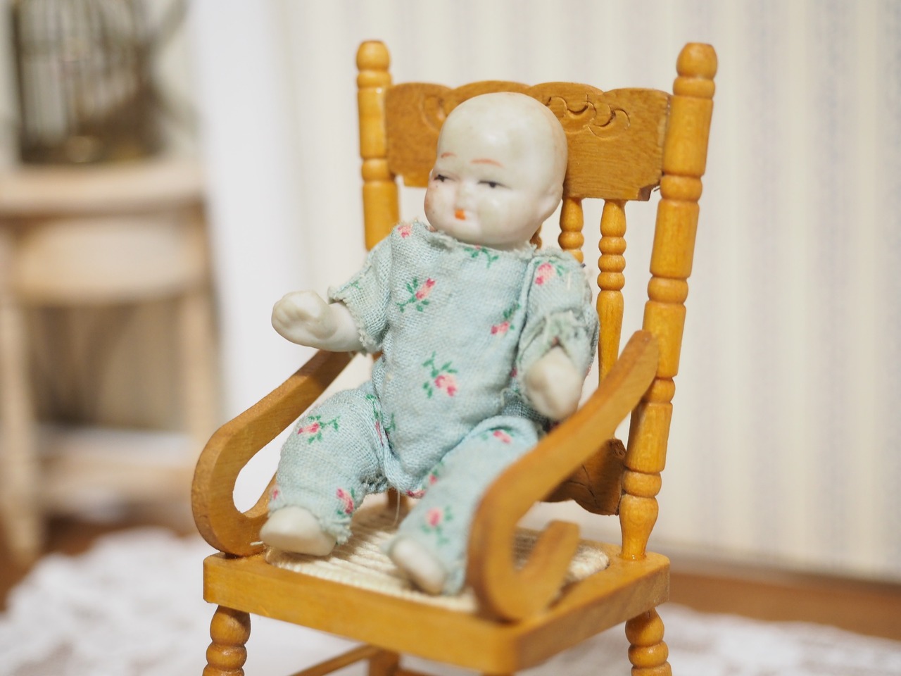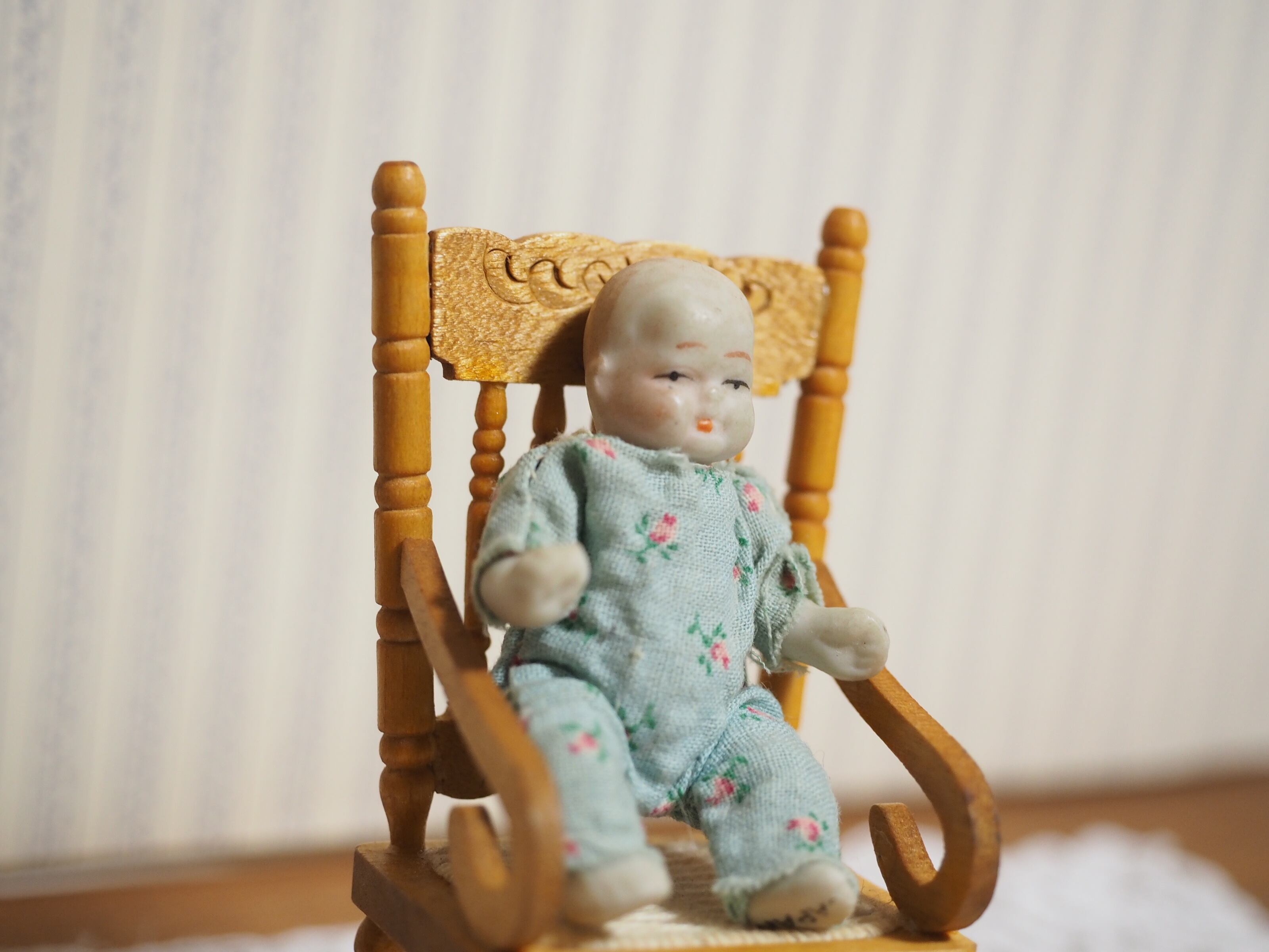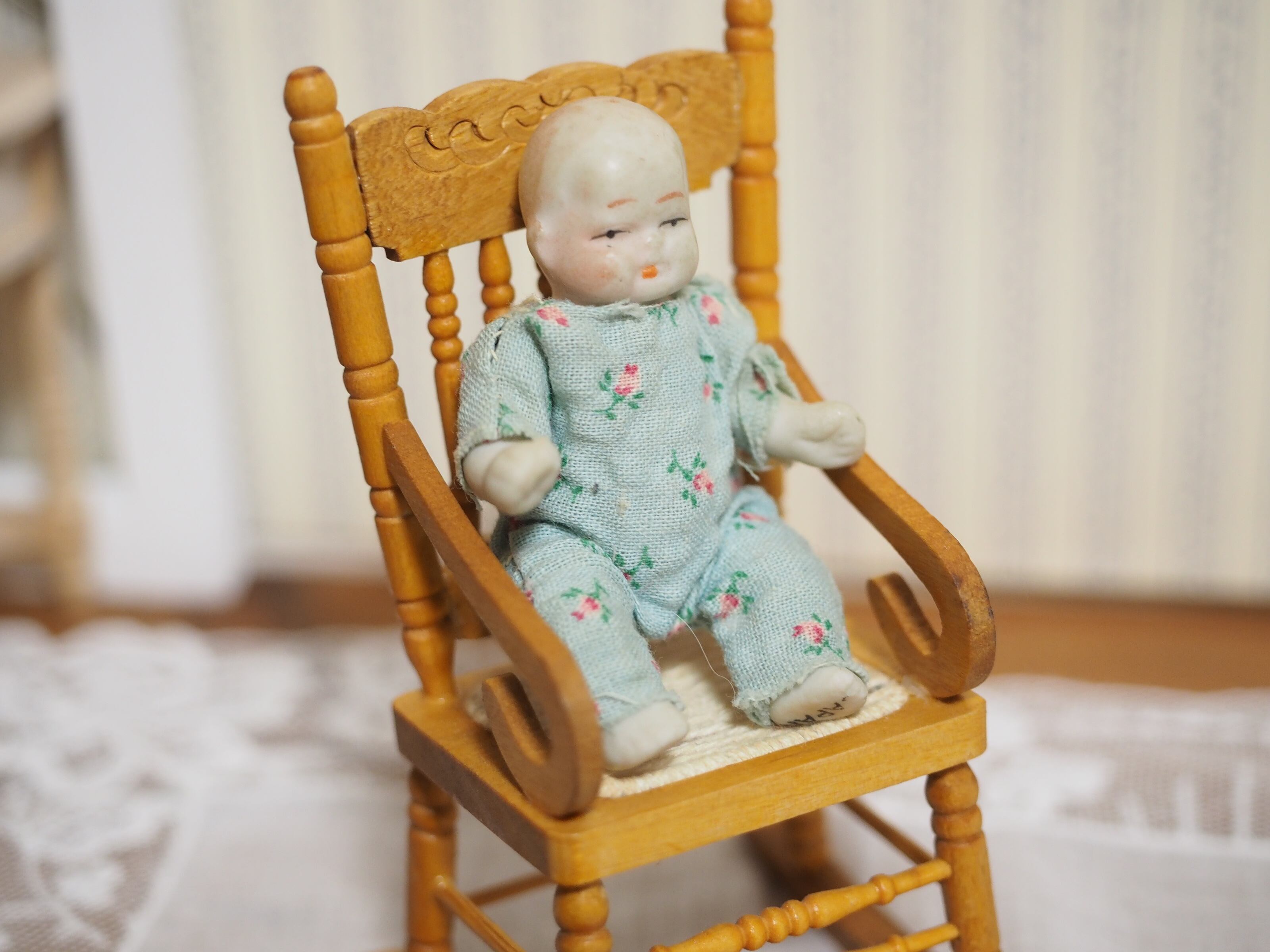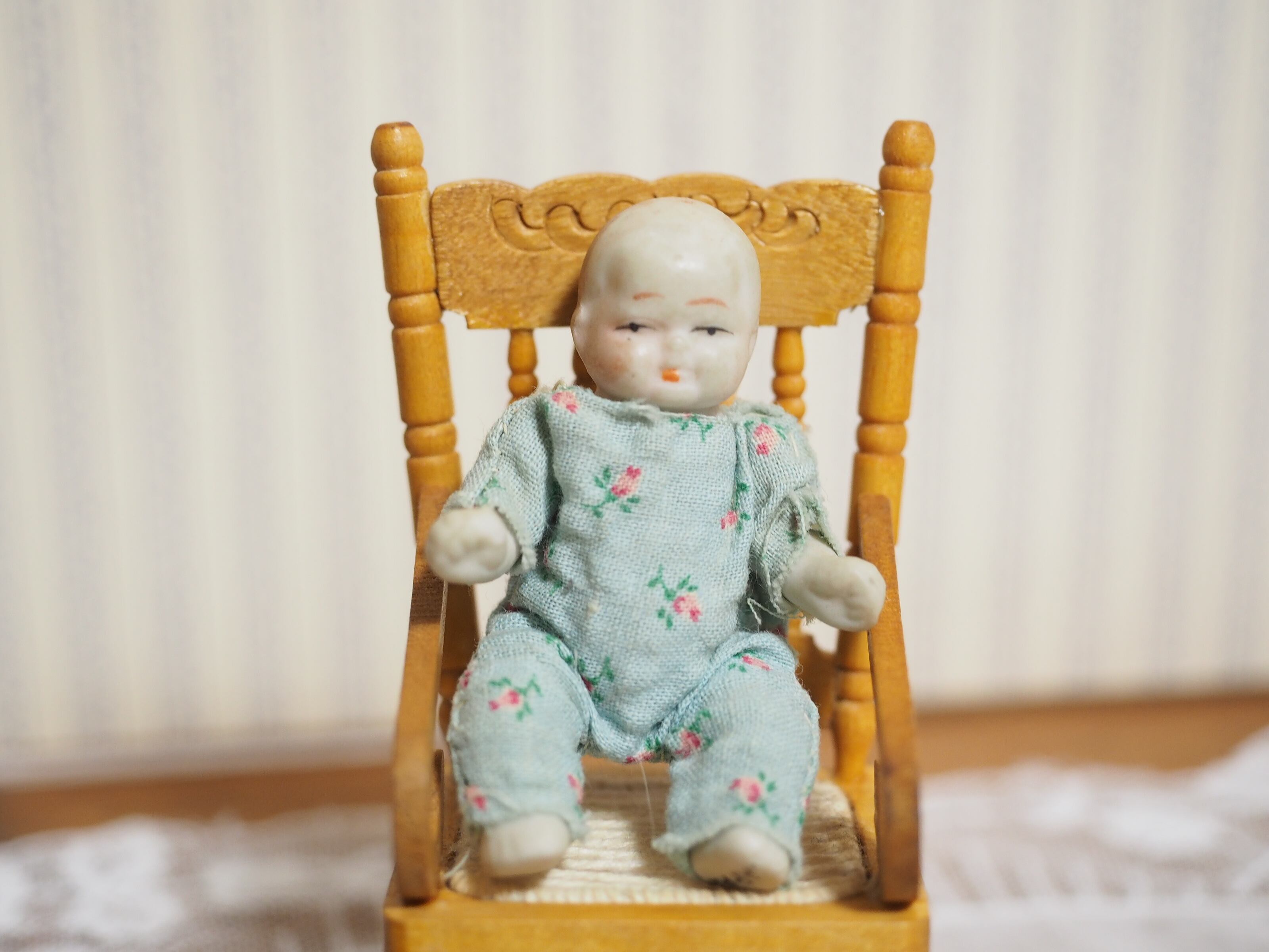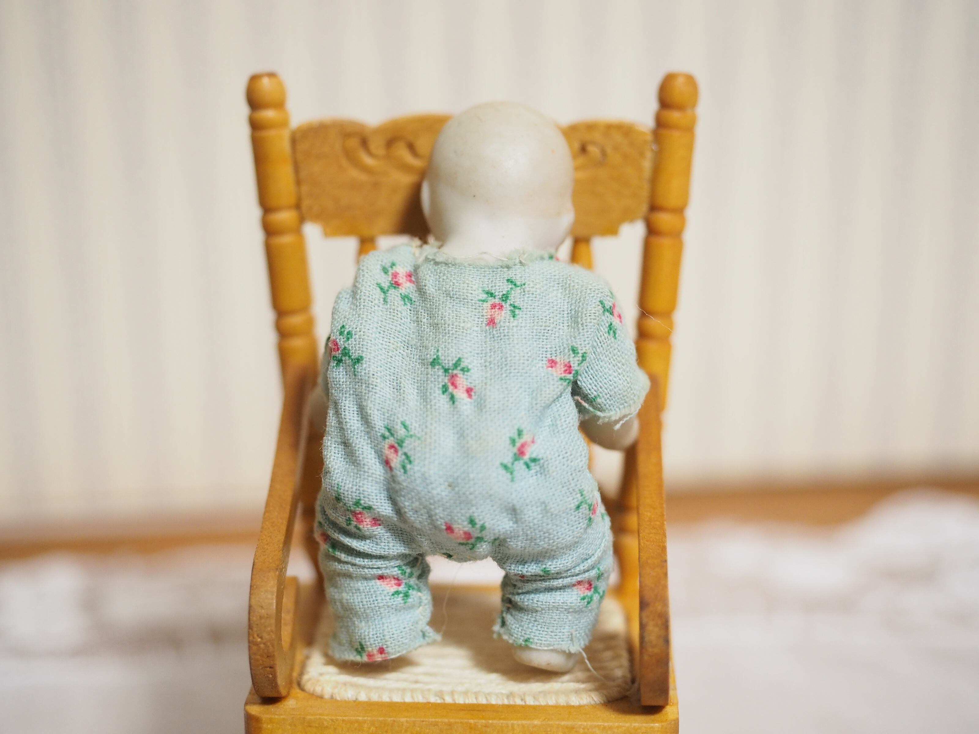 ころんとした姿がかわいい、水色の花柄ロンパースを着せてもらったビスクドールです。