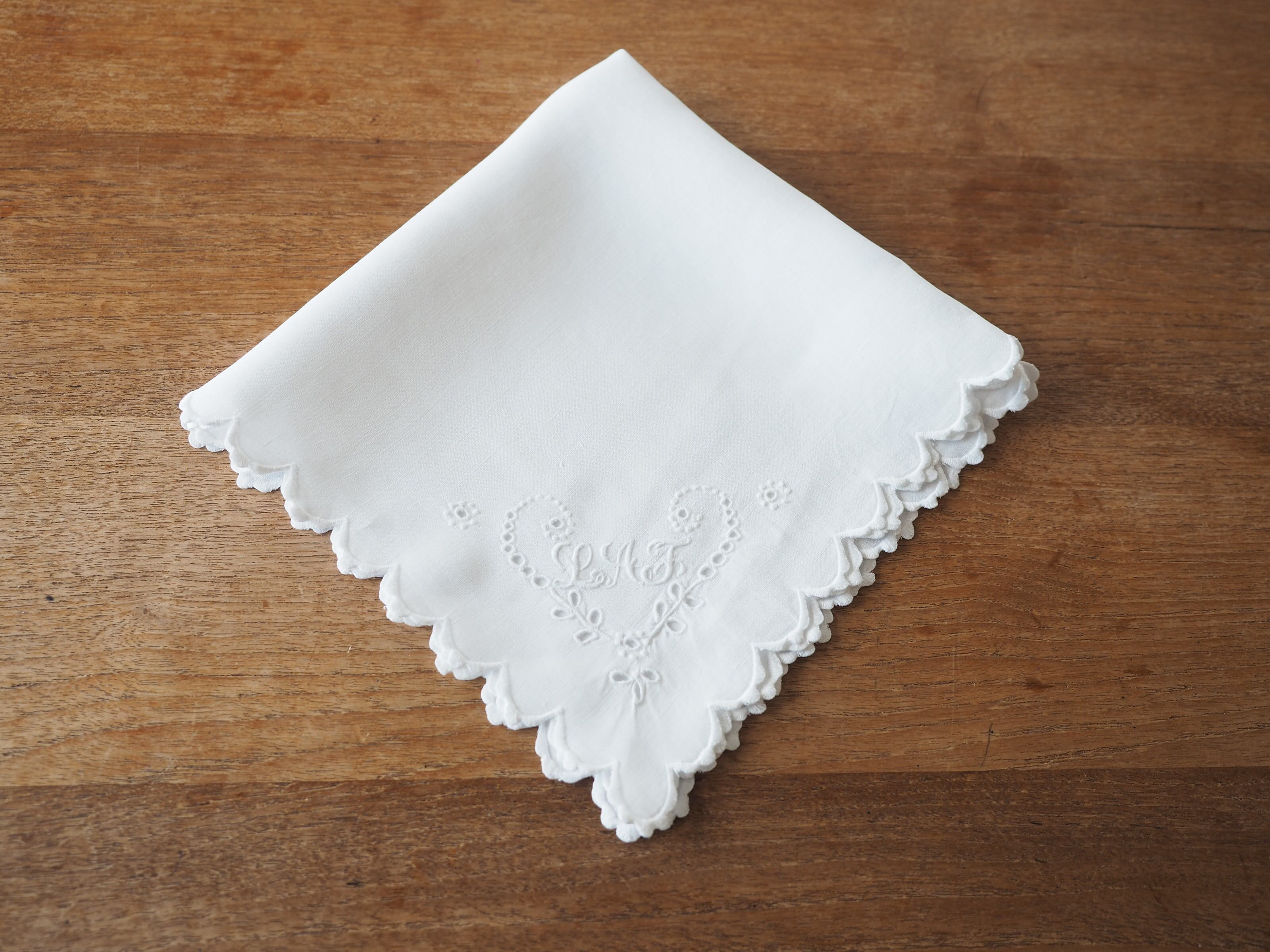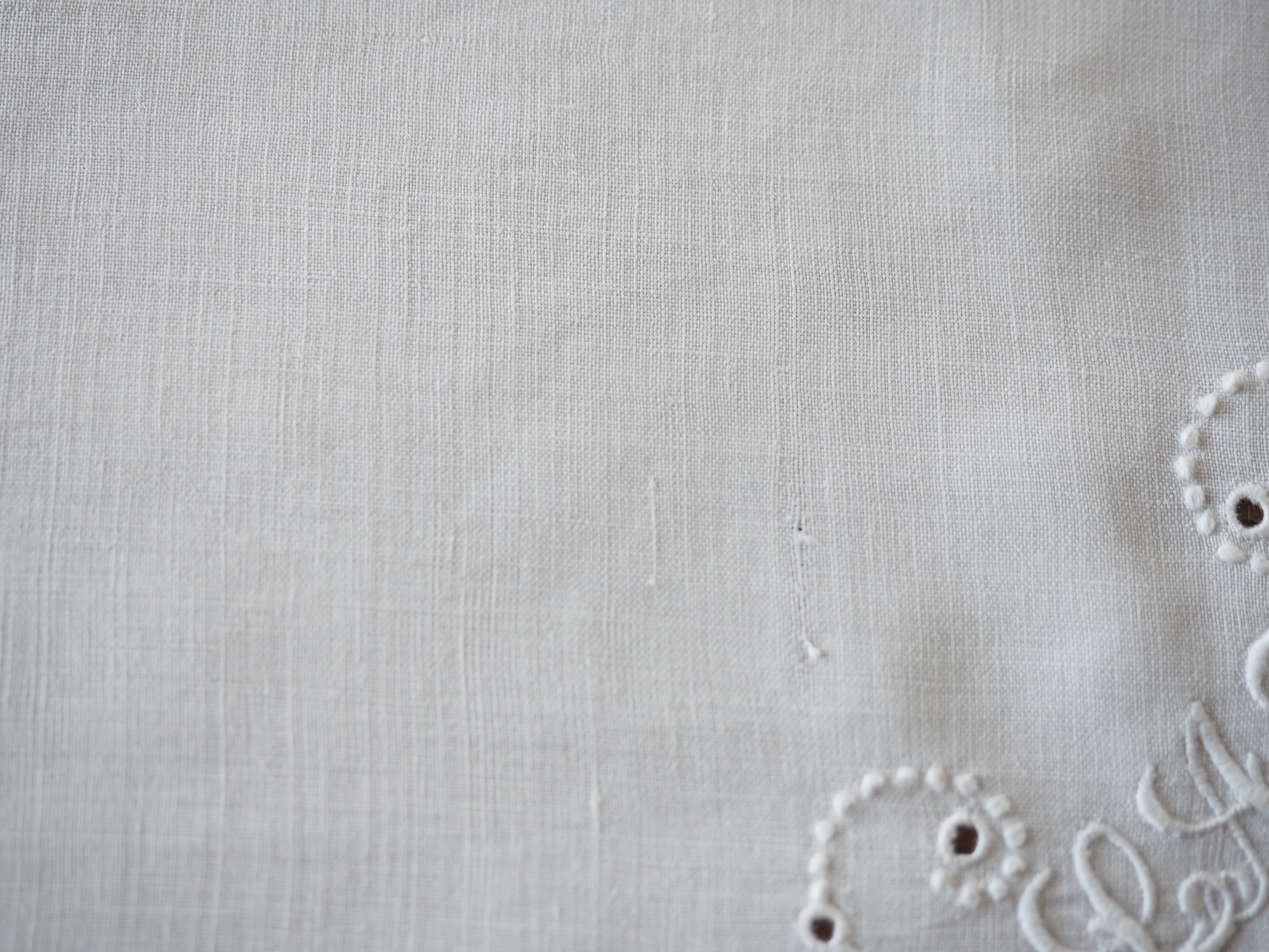 コーナーは素敵なイニシャルと、小さな穴をステッチでかがったアイレット刺繍で植物をハートにかたどったモチーフです。