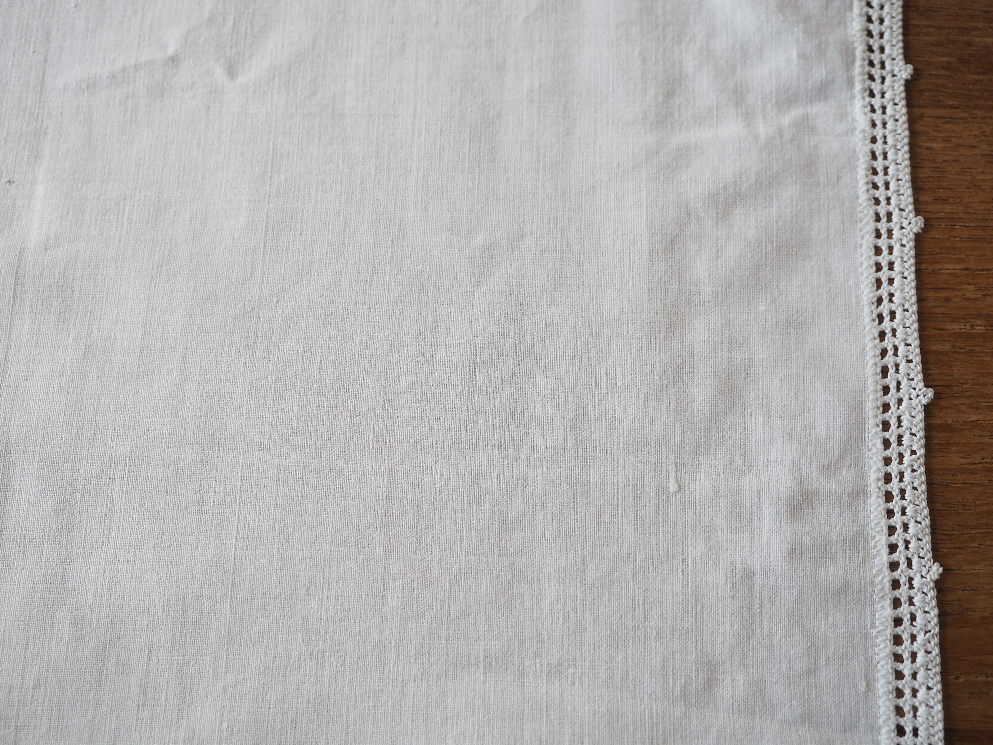 お色はビンテージ感のあるホワイトです。他のリネンと並べて比べますと、こちらは1段クリームがかったお色です。