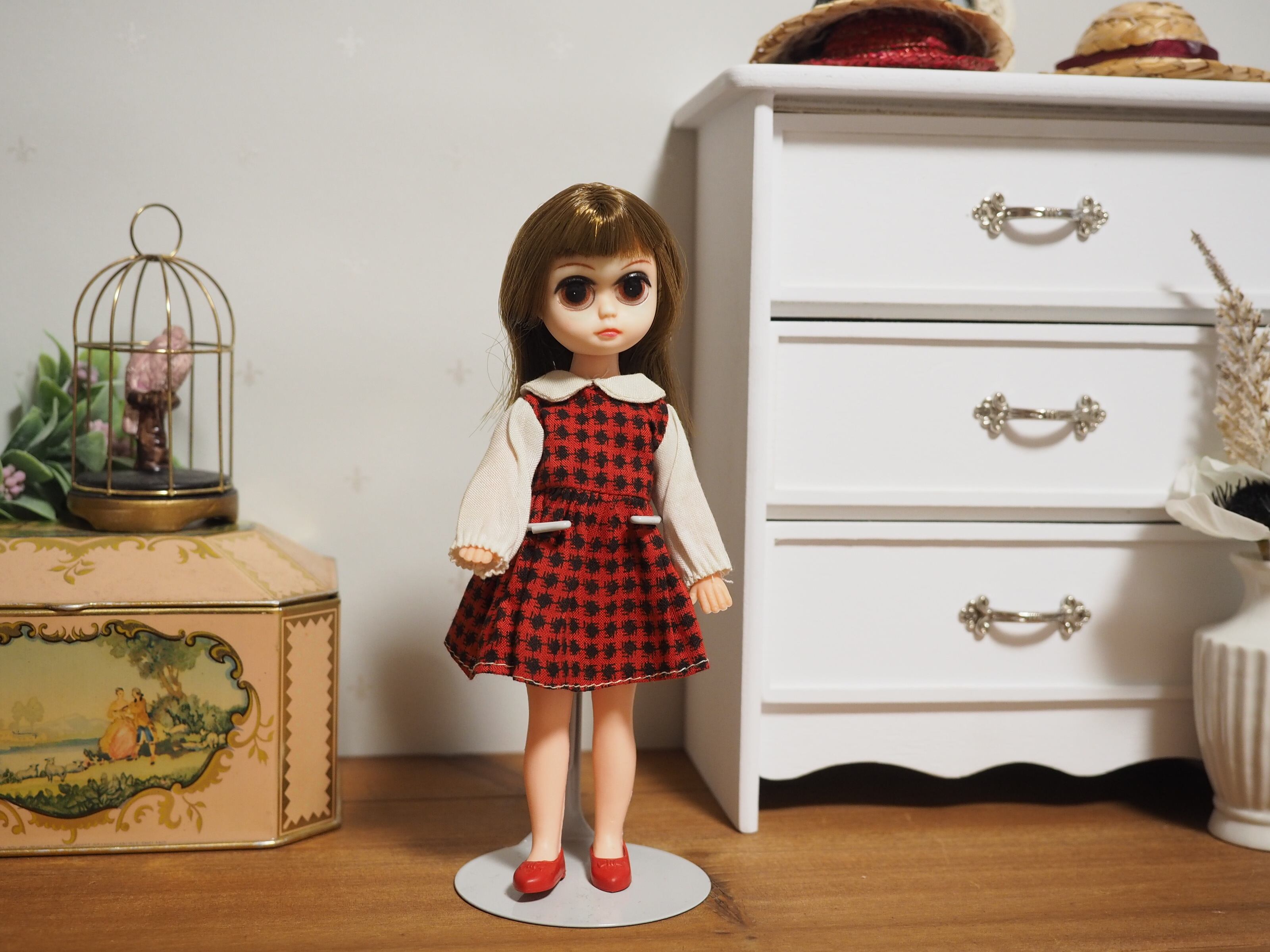 オリジナルの赤色千鳥模様のようなワンピースはスカート後ろと内側の紙タグが千切れています。