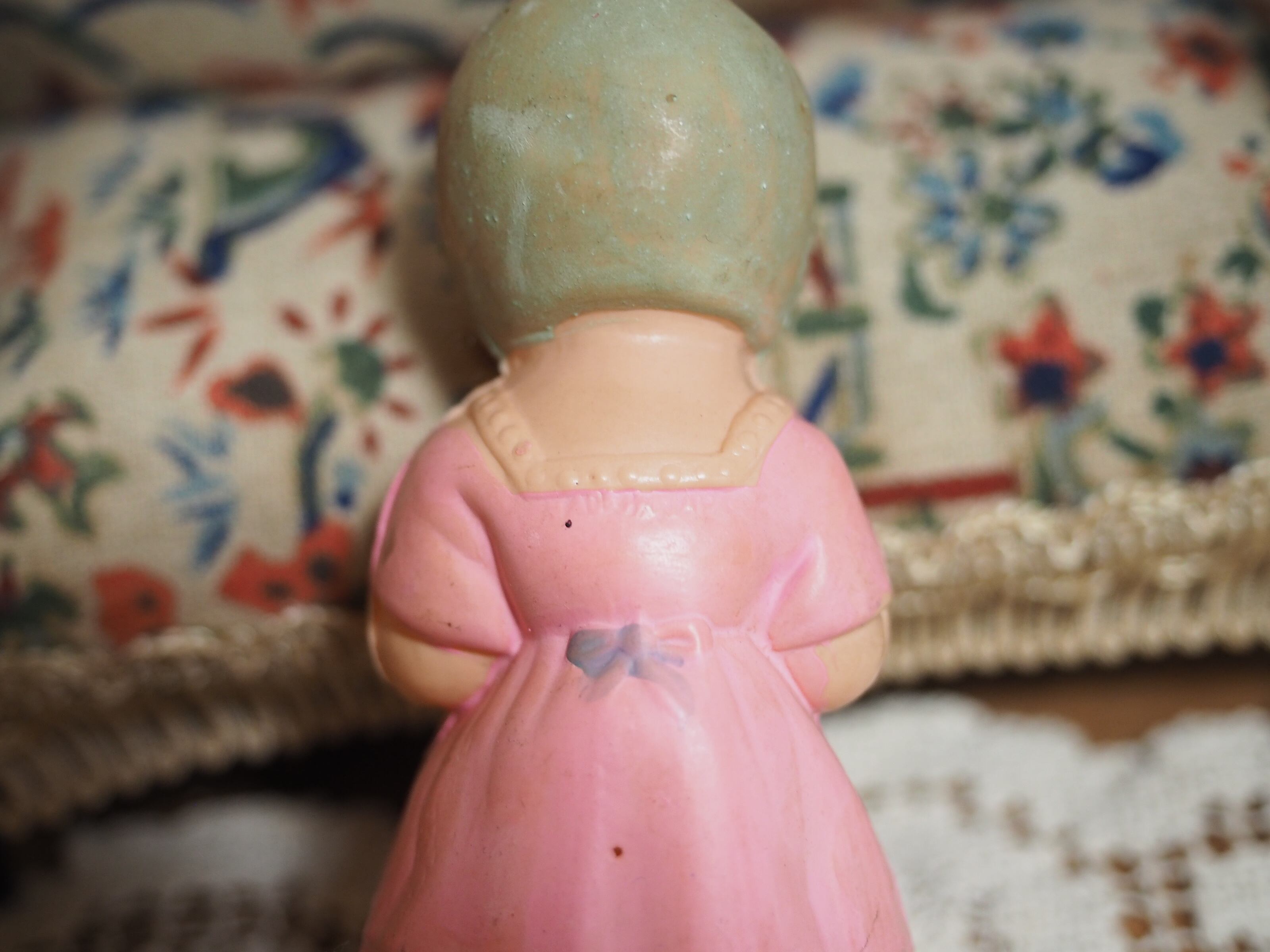 優しそうな瞳ににっこりした口元、淡いペイントがきれいな女の子のセルロイドです。