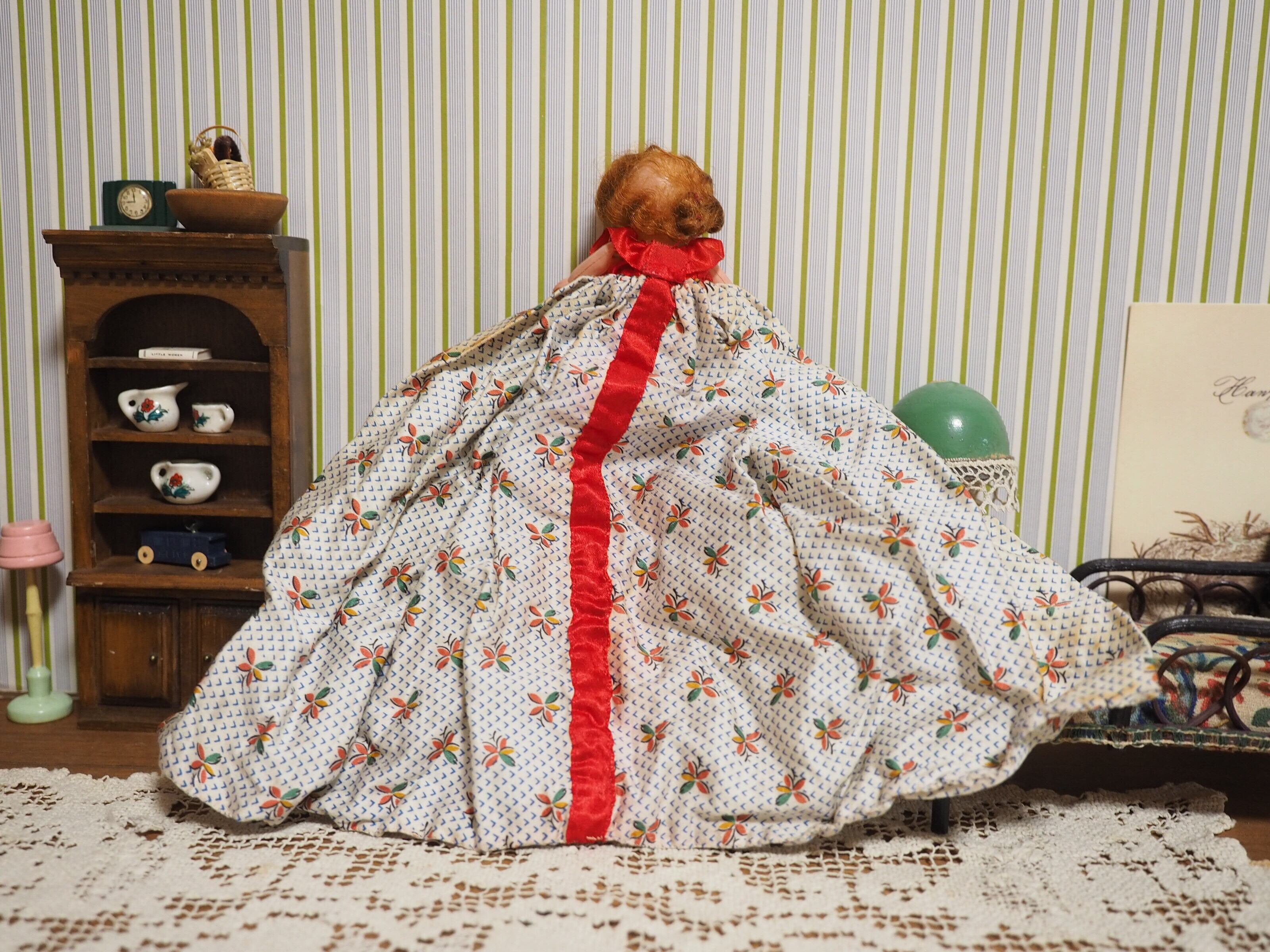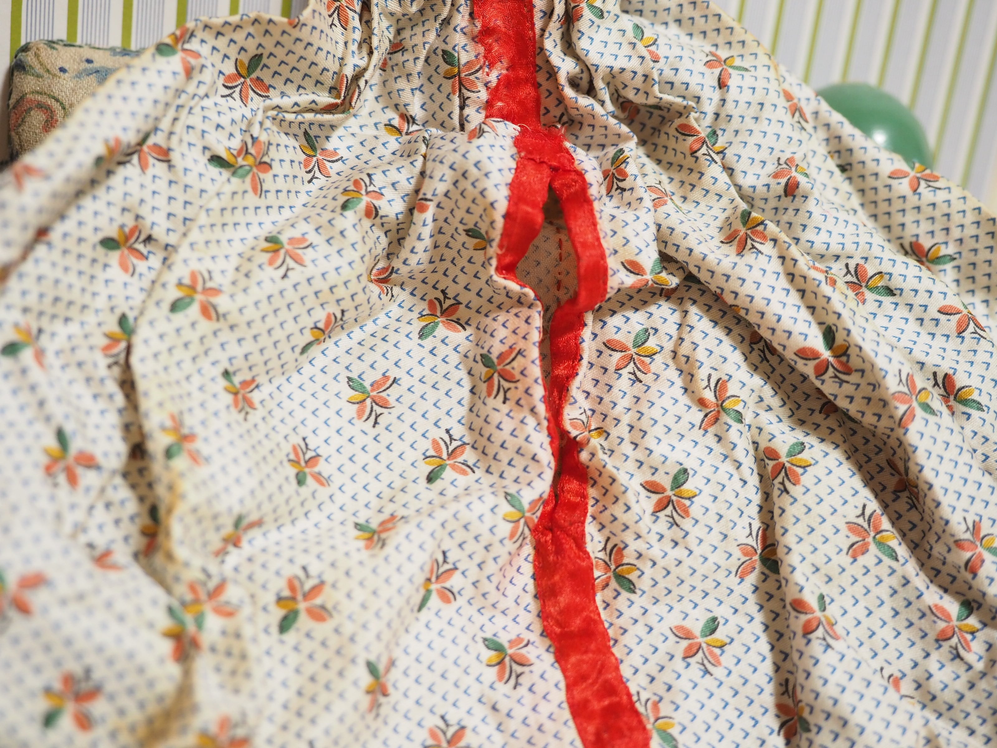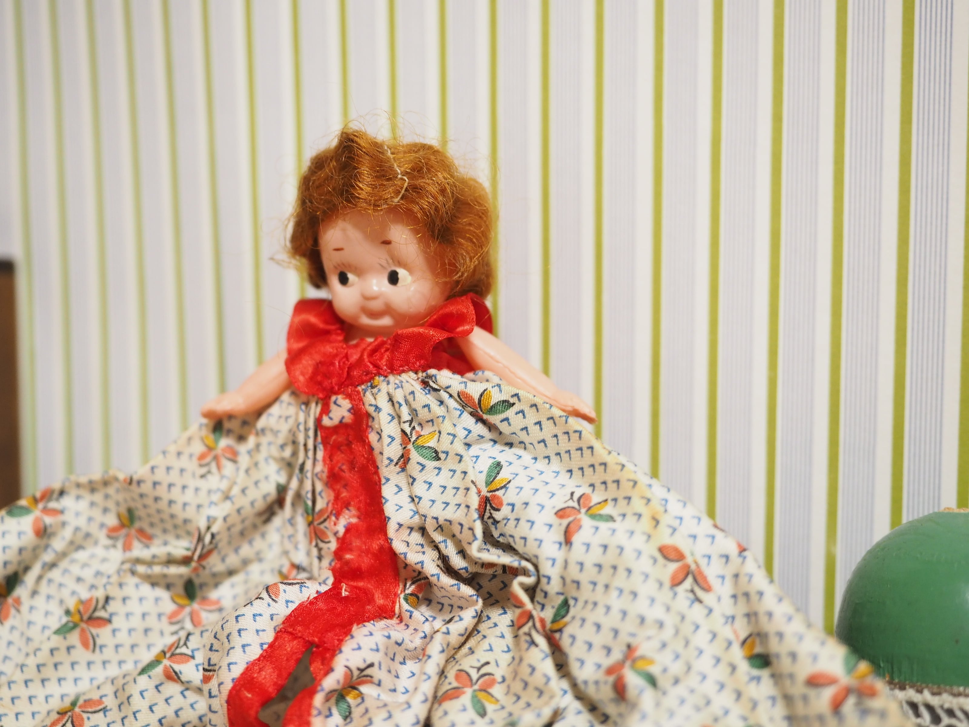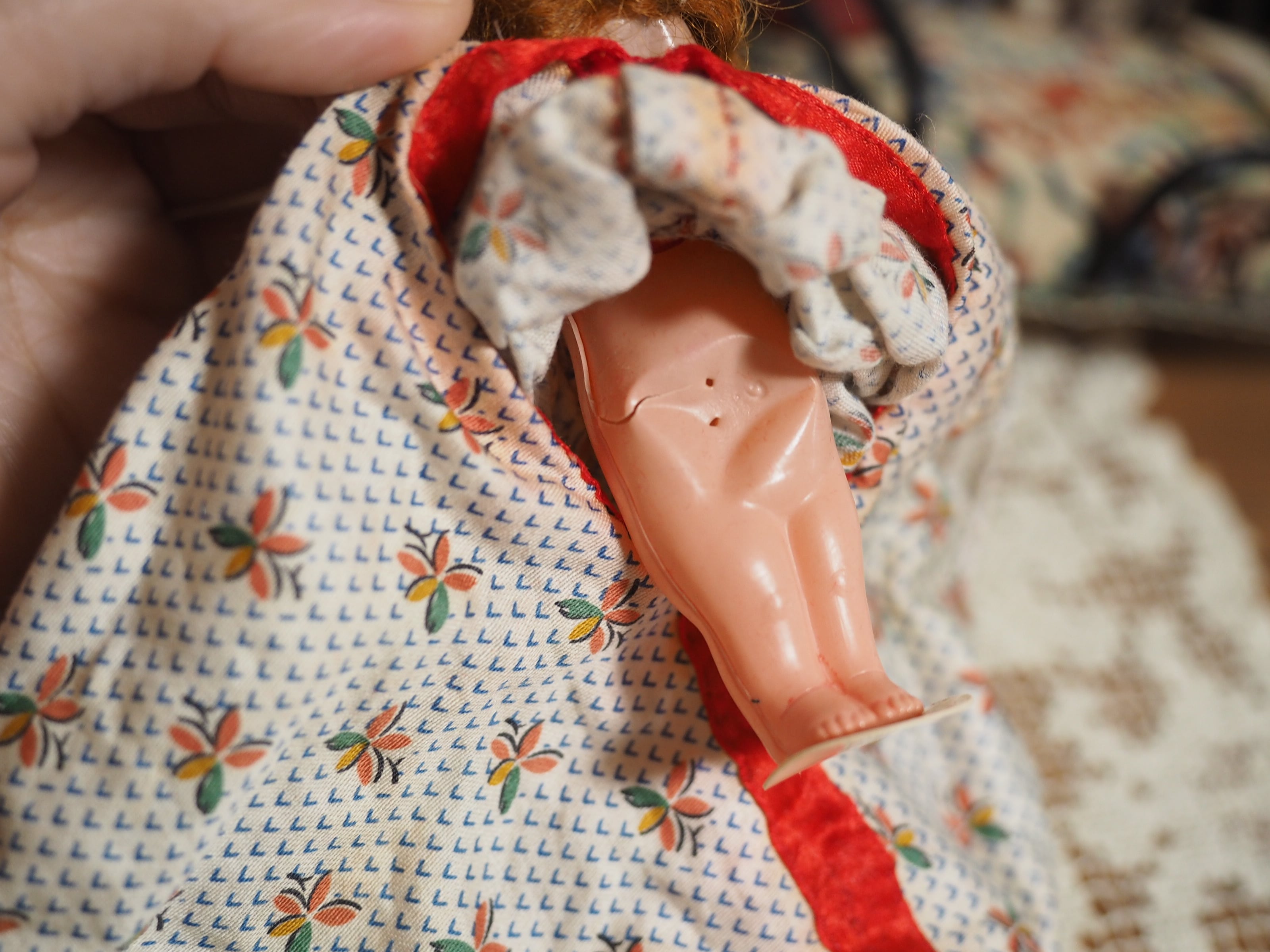 真ん中はポケットのようになっていて、ワンピースの裾は縫い合わされていますので、吊り下げて何か入れられたのか、足に台紙がありますので穴から足を出して飾られたのかもしれません。