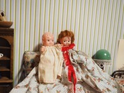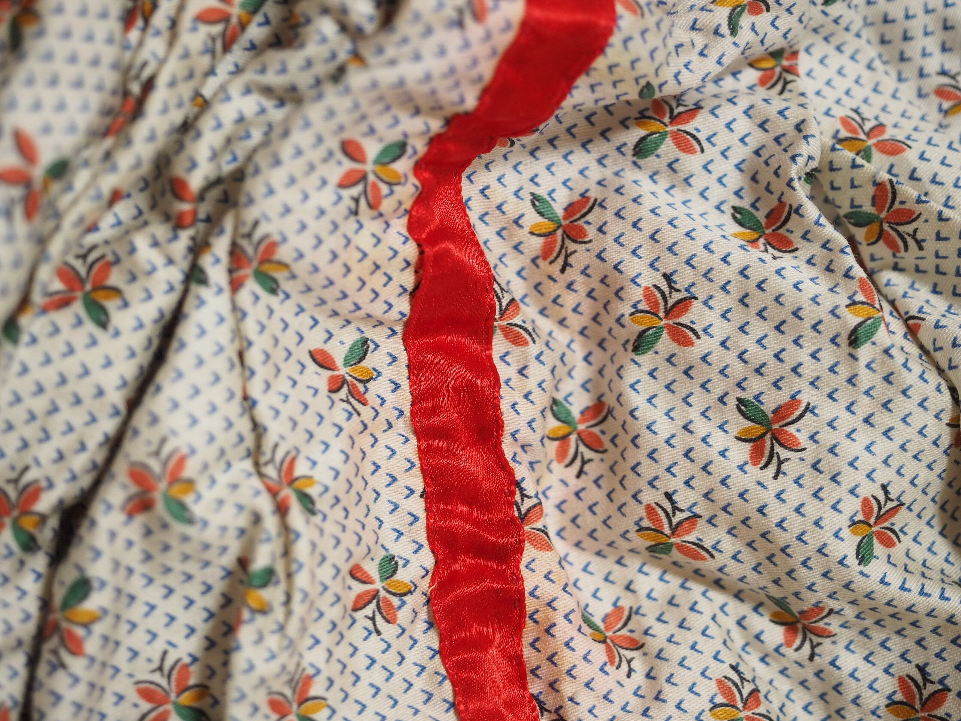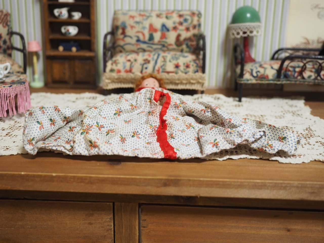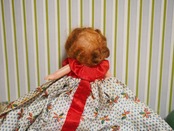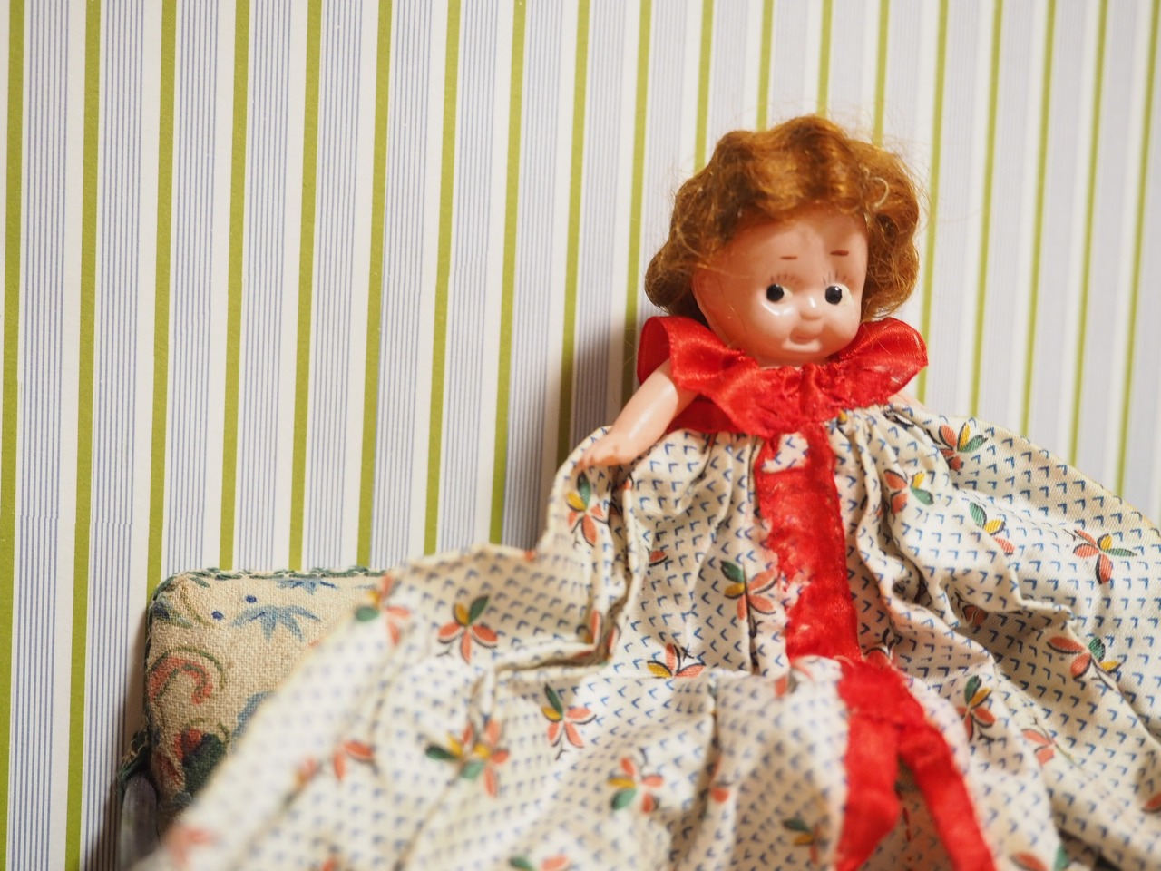 真ん中はポケットのようになっていて、ワンピースの裾は縫い合わされていますので、吊り下げて何か入れられたのか、足に台紙がありますので穴から足を出して飾られたのかもしれません。