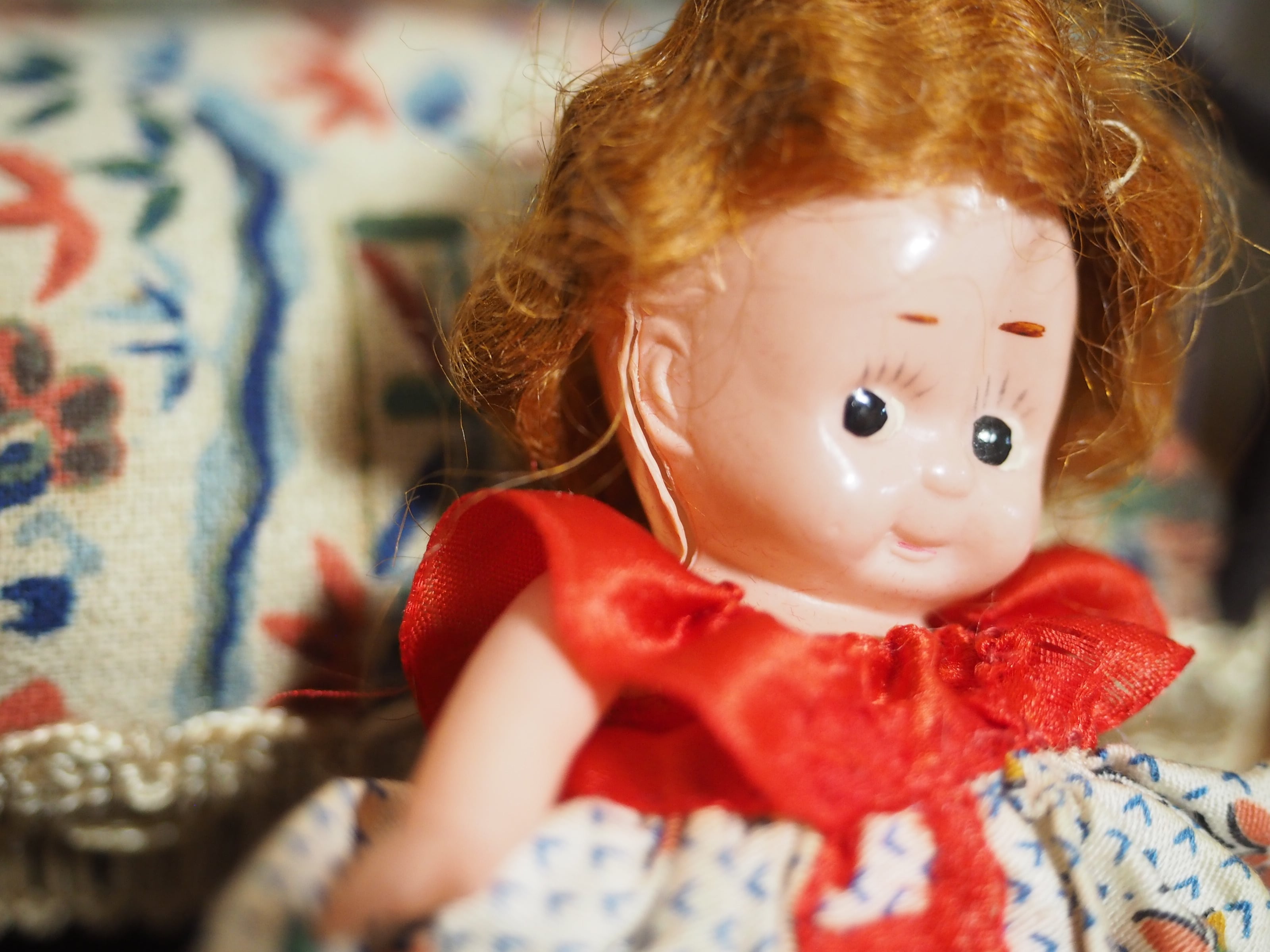 感動するような軽さと、素朴な温かみのあるセルロイドで、丸い瞳に細いまつ毛がキュートなキューピーです。