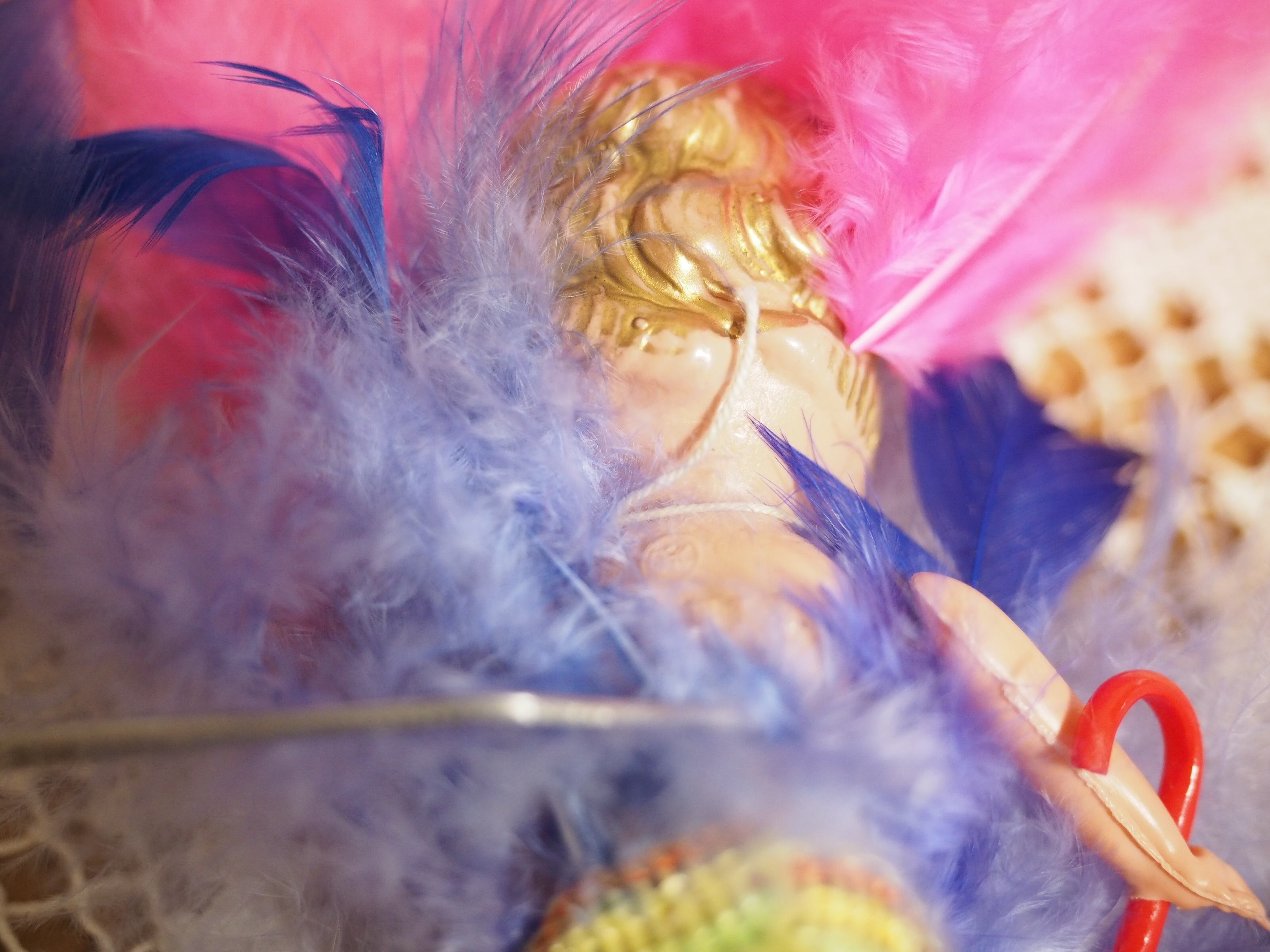 ふわふわしたピンクとブルーの羽は状態良好ですが、お届けの際細かな羽毛が抜ける可能性がございます。