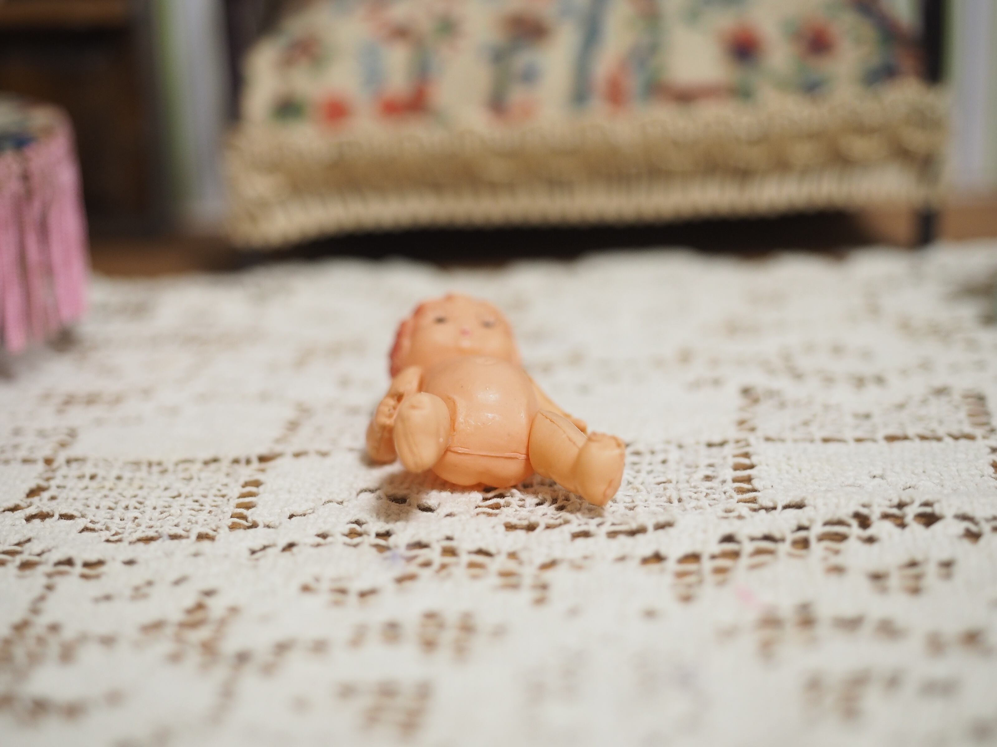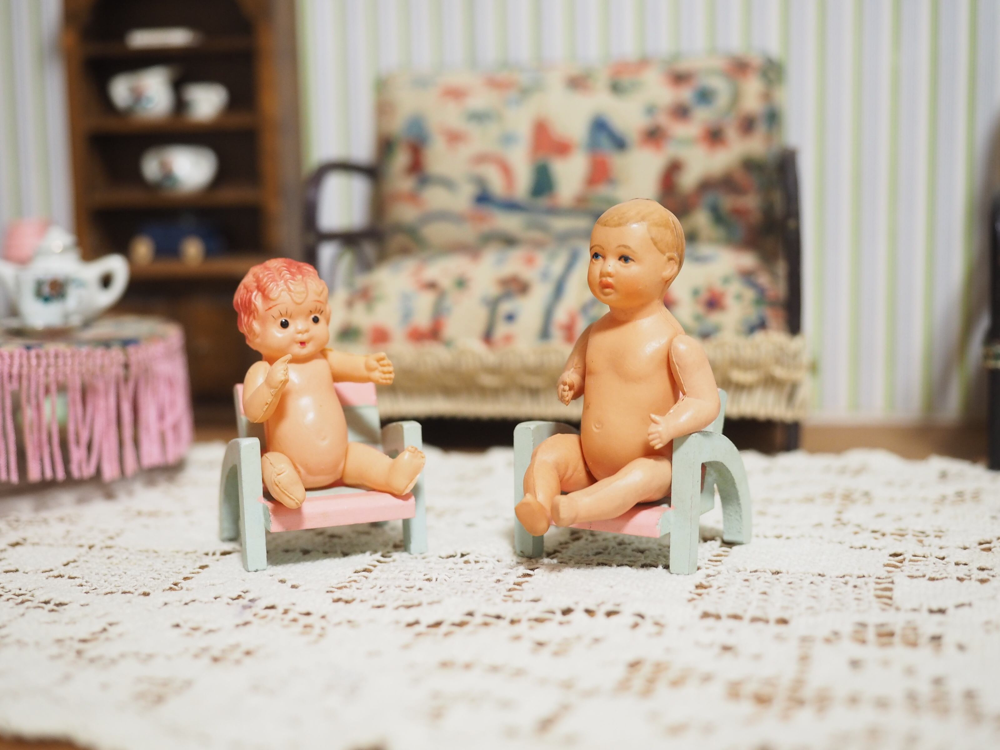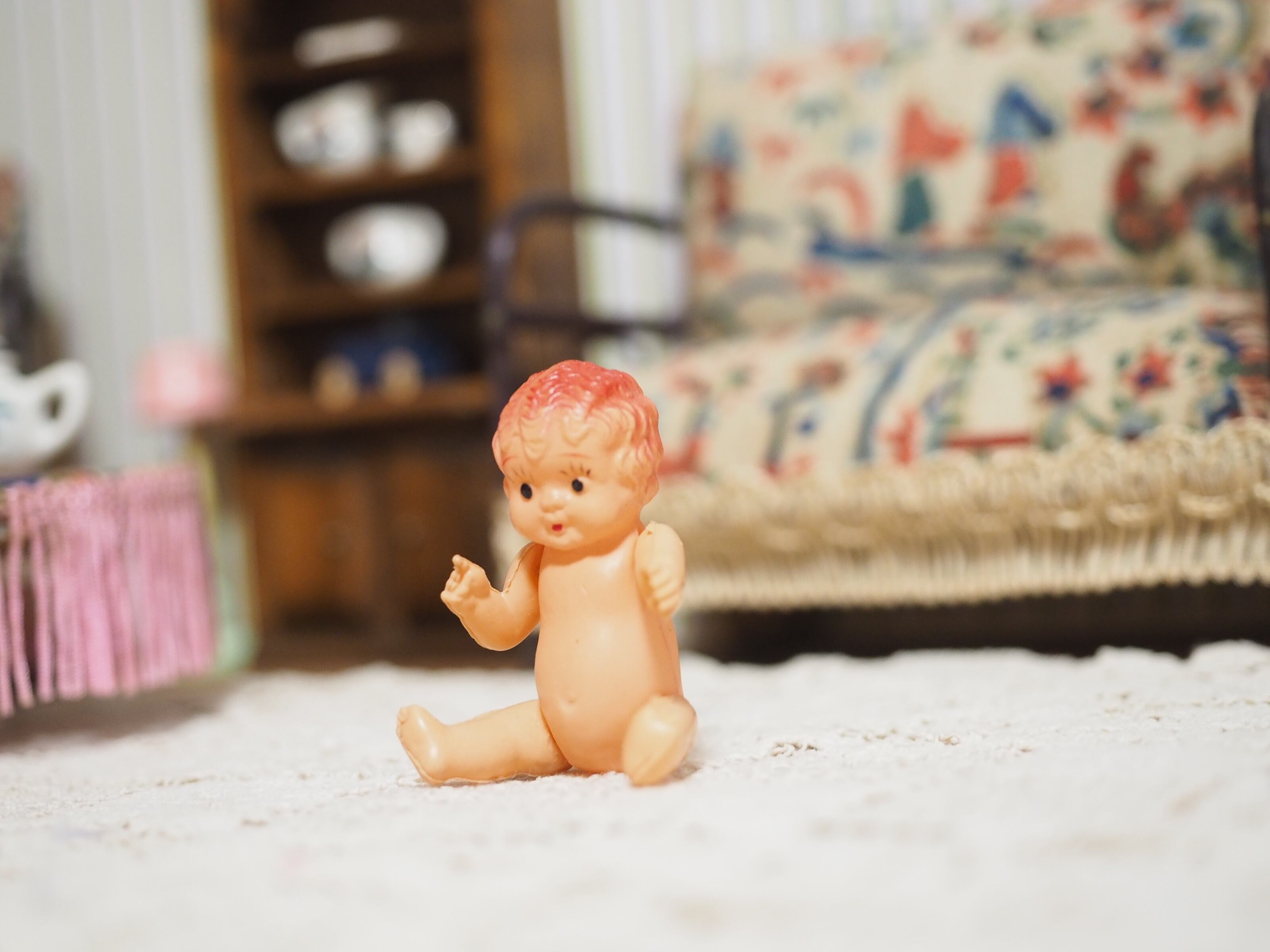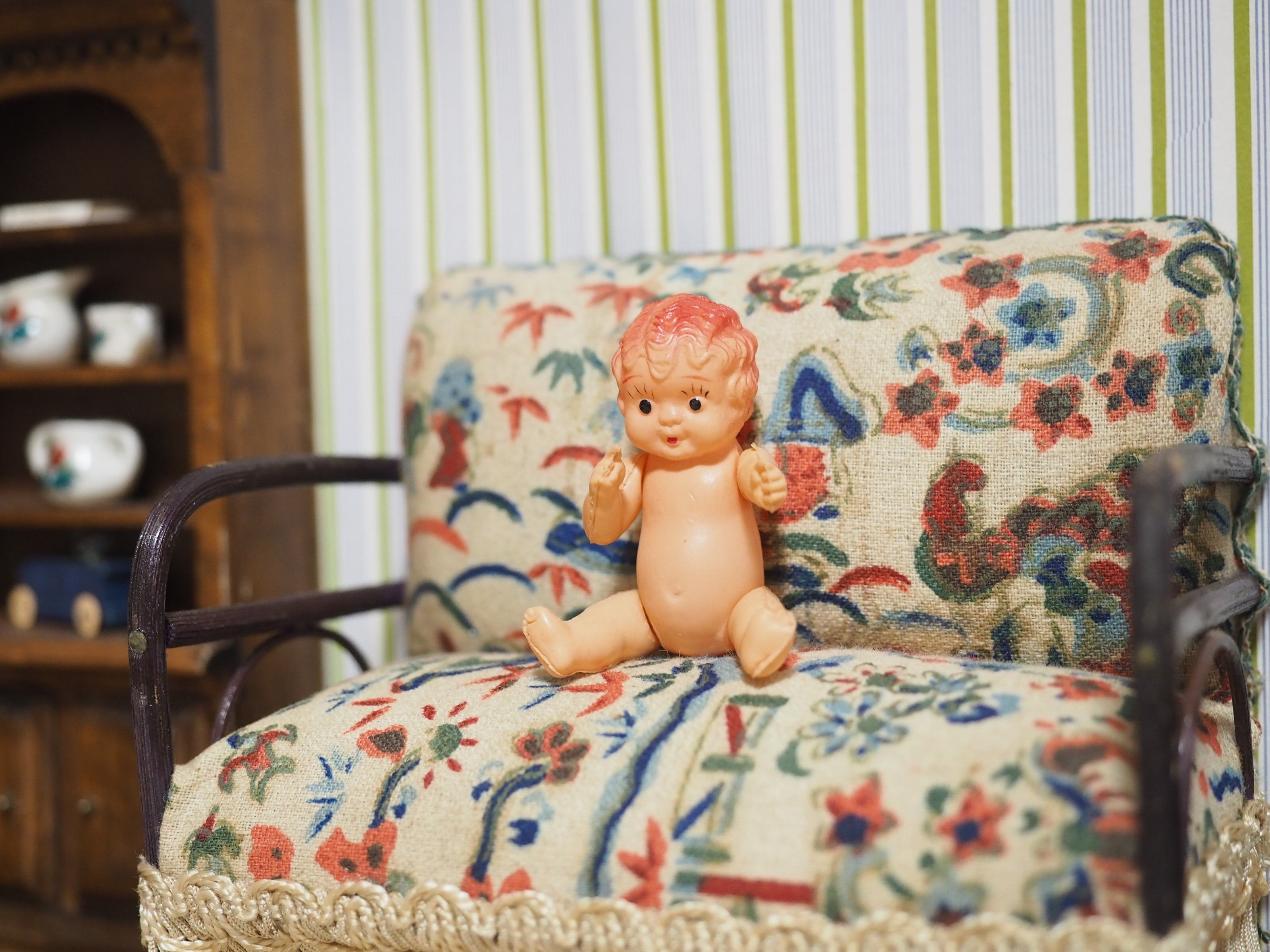 非常に小さいですが腕脚ジョイントで小さな椅子にも上手に座れます!右手の人差し指を出したポーズがかわいらしいドールです。
