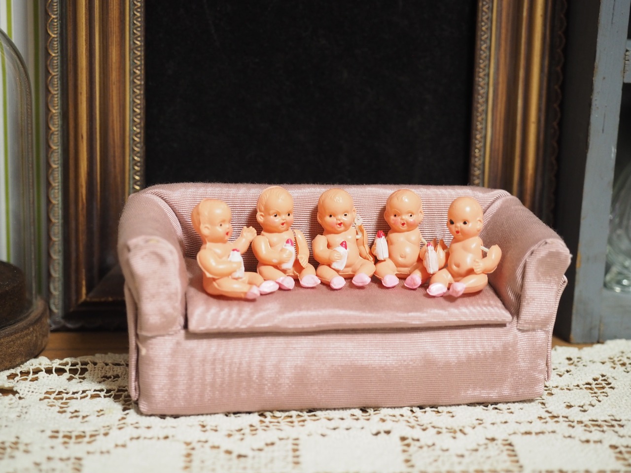 お座り姿で約3.5㎝の小ささですが、腕はゴムジョイントで右手に哺乳瓶を持っています!