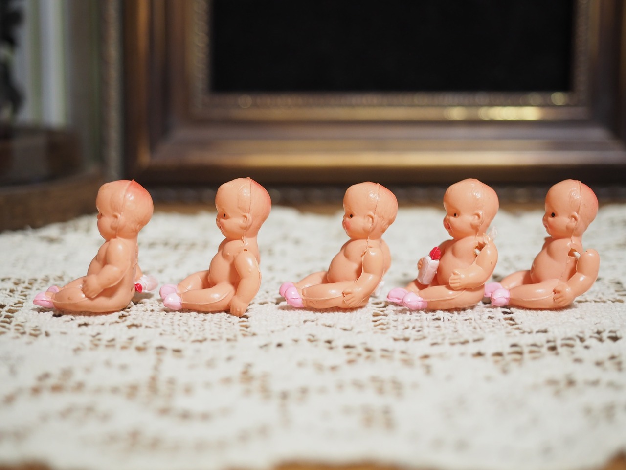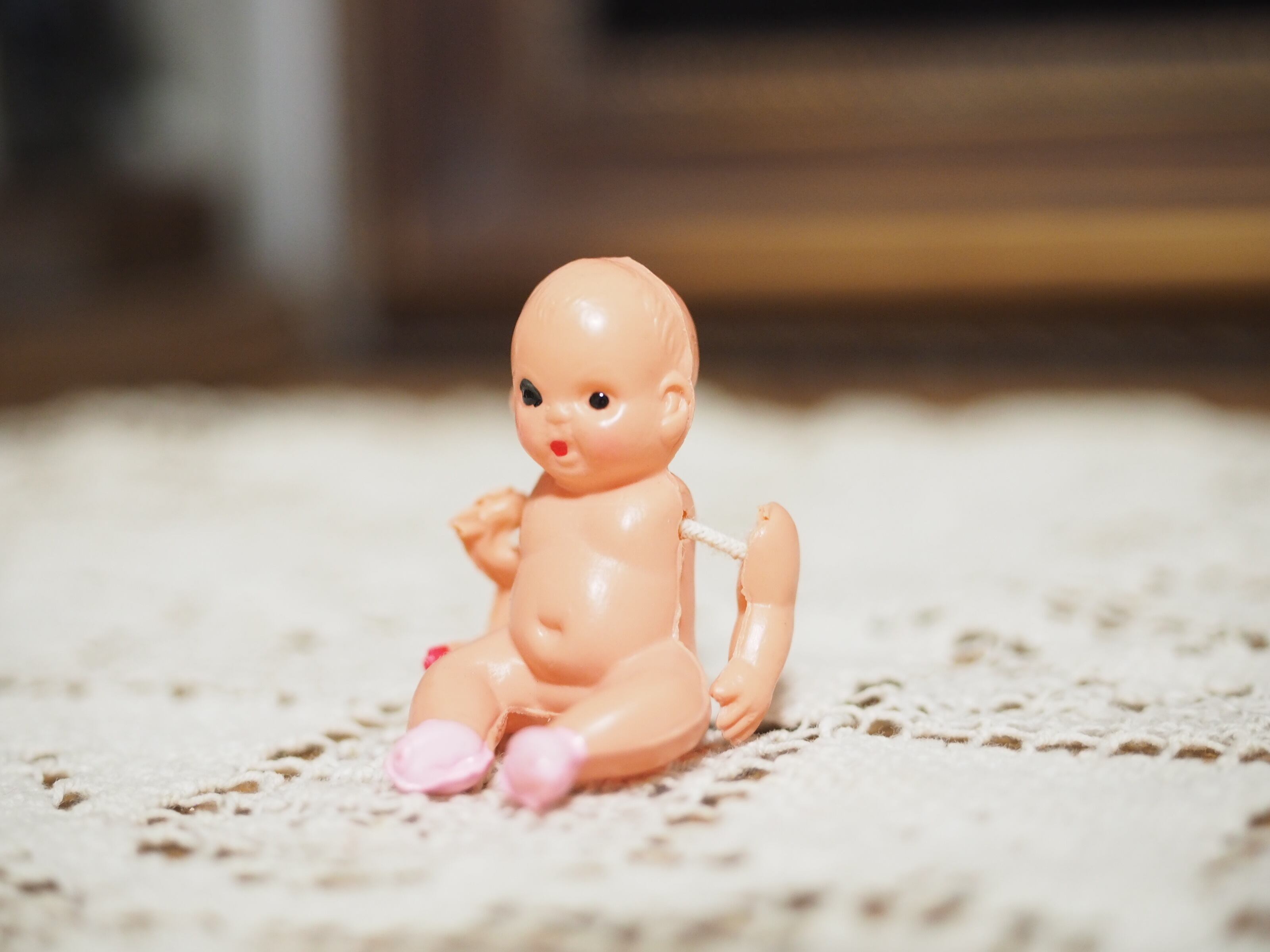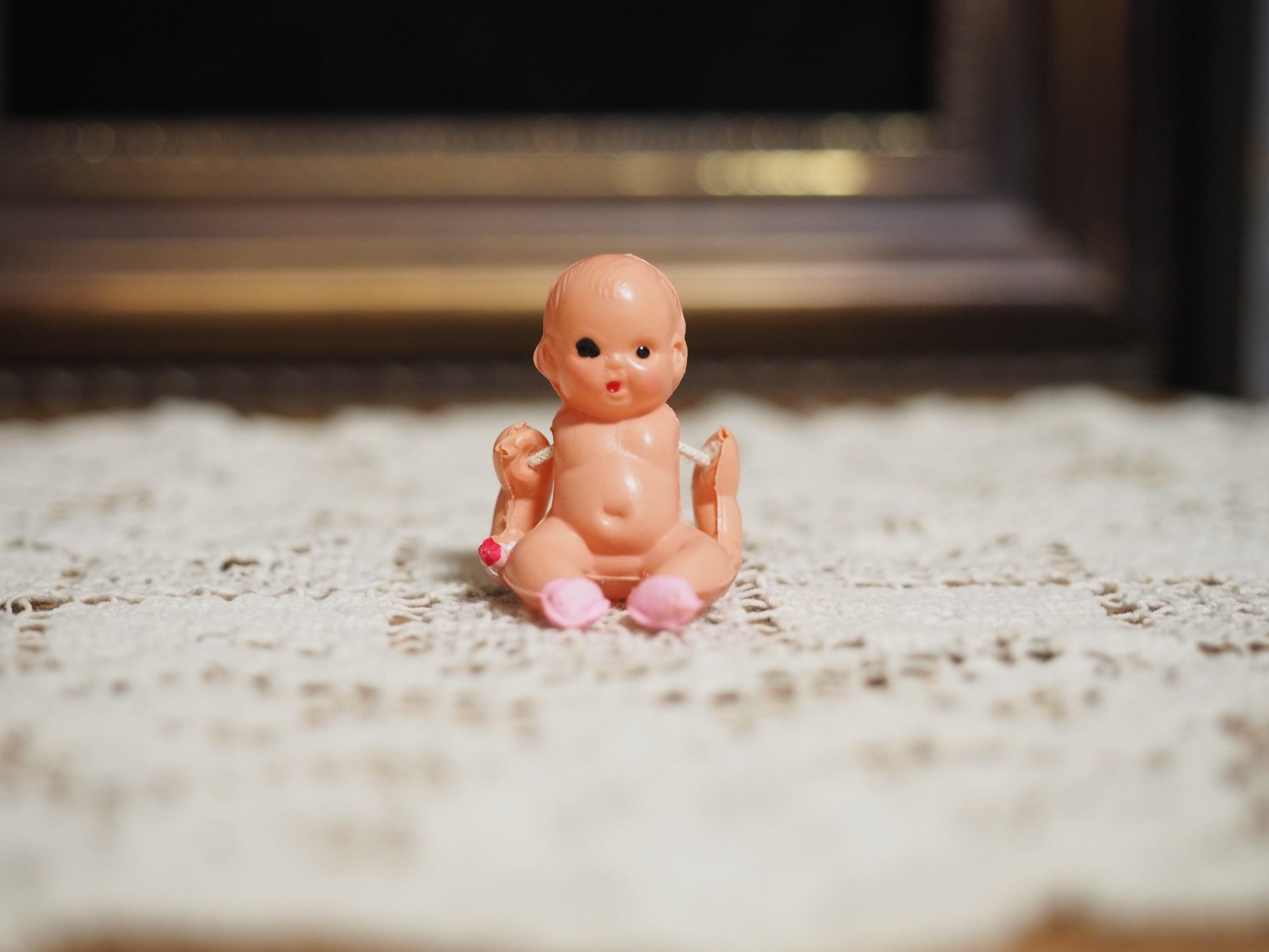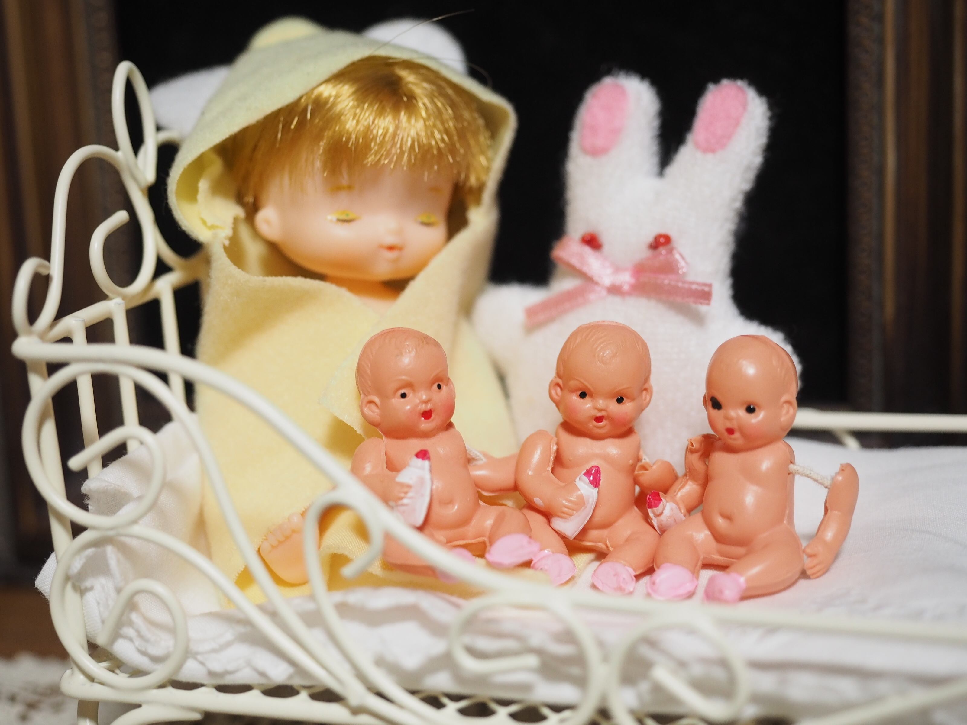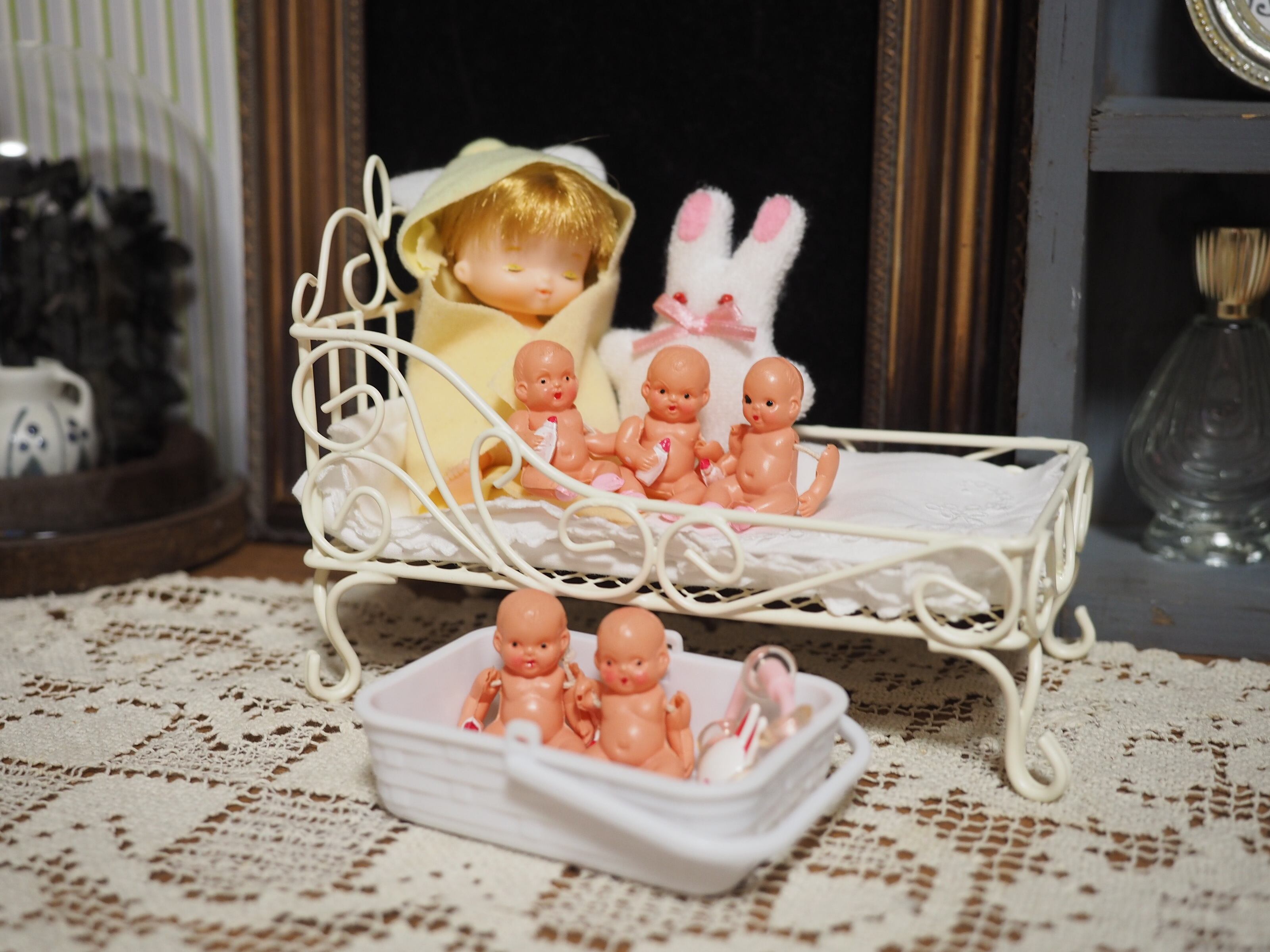 お座り姿で約3.5㎝の小ささですが、腕はゴムジョイントで右手に哺乳瓶を持っています!