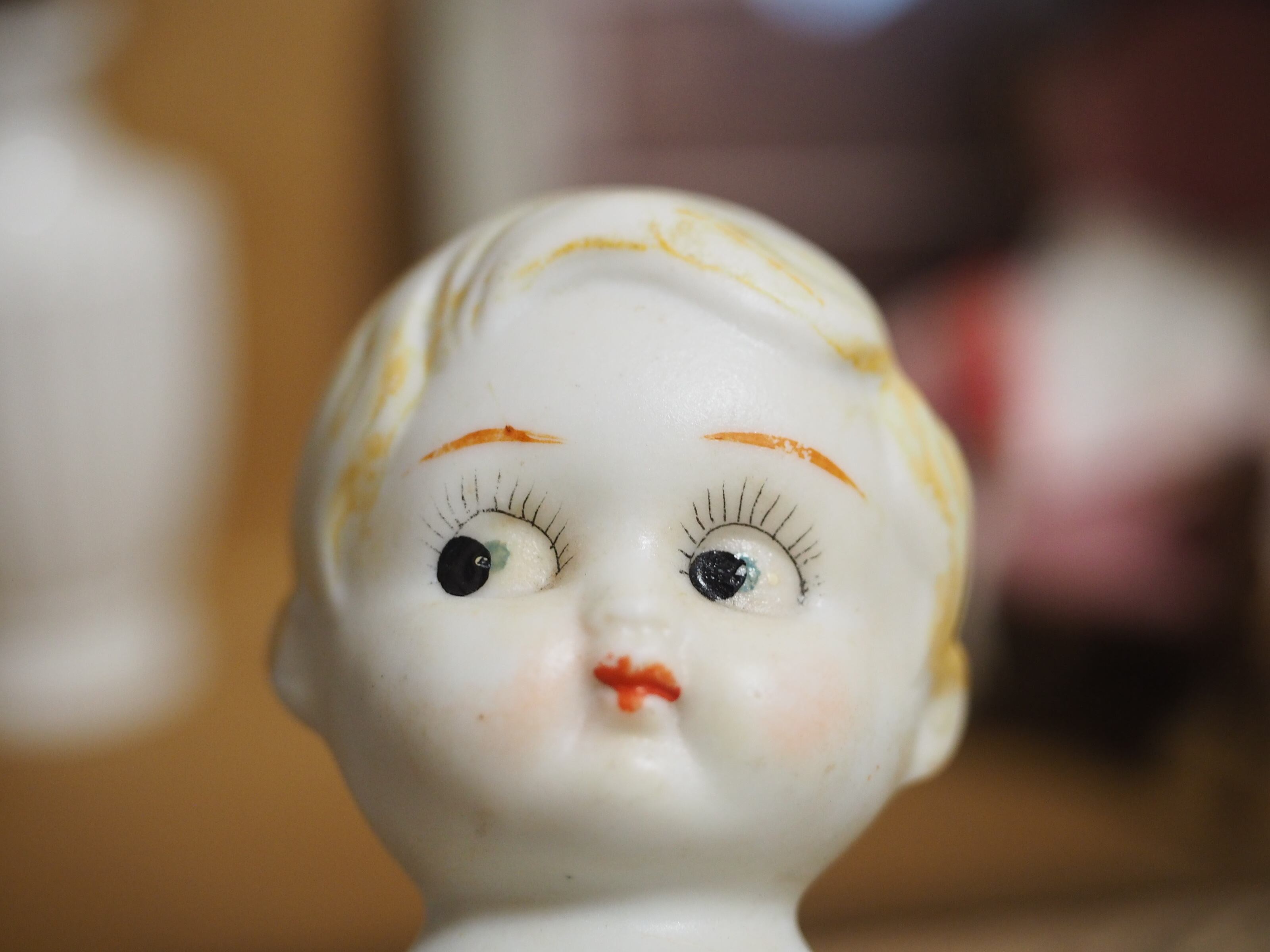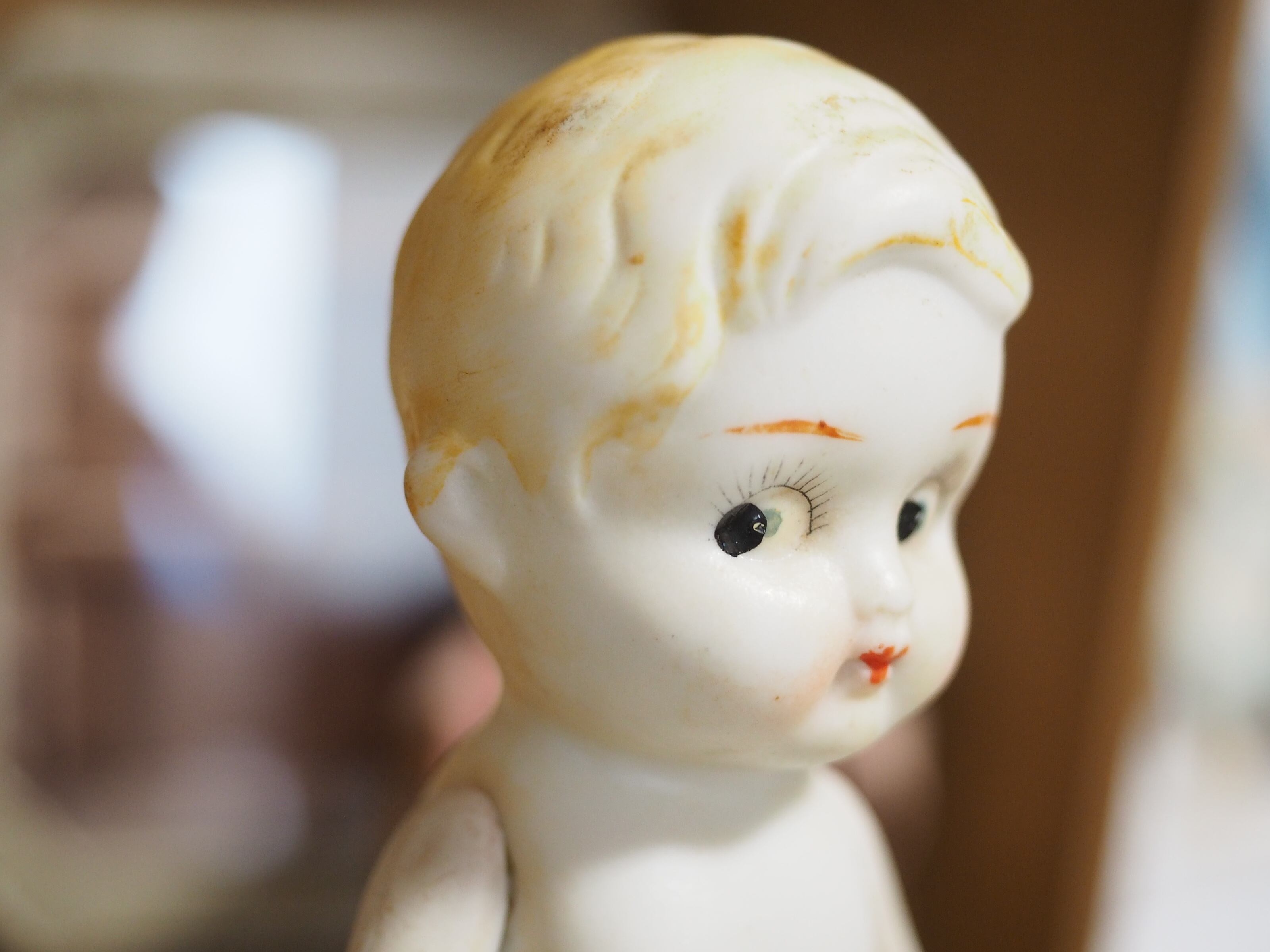 細いまつ毛がびっしり描かれたきれいなグーグリーアイのビスクドールです。グーグリーアイは1921年以降JAPAN表記になった頃によくみられ、1920~1930年代のドールと思われます。