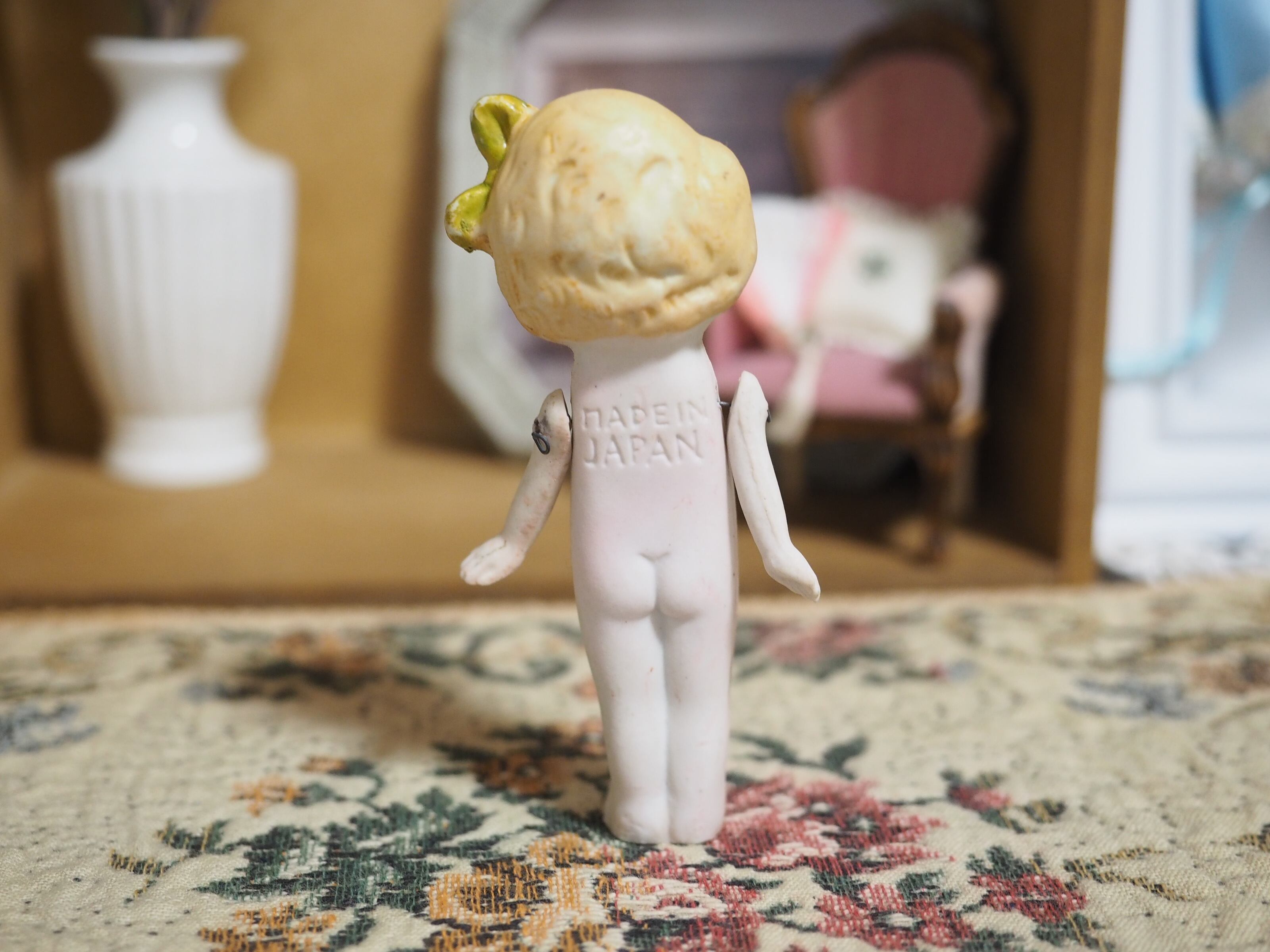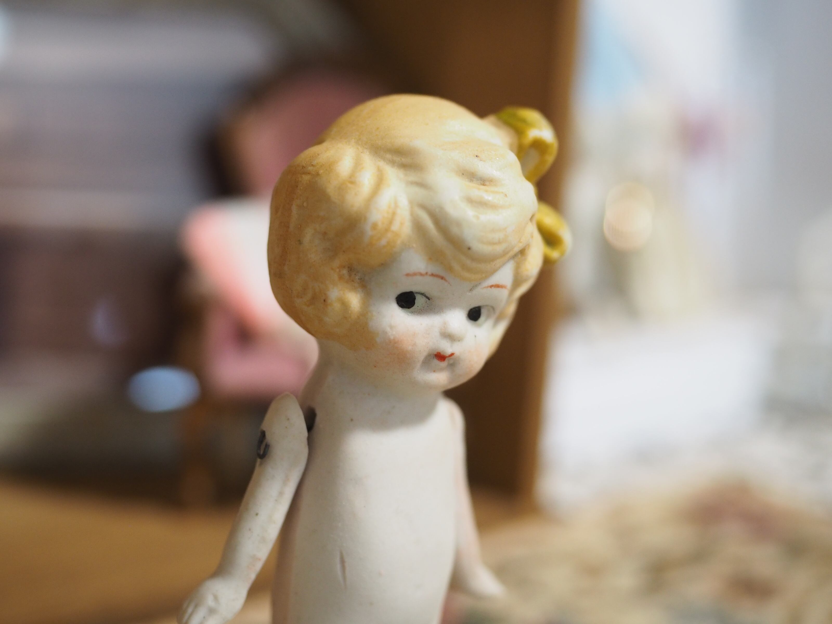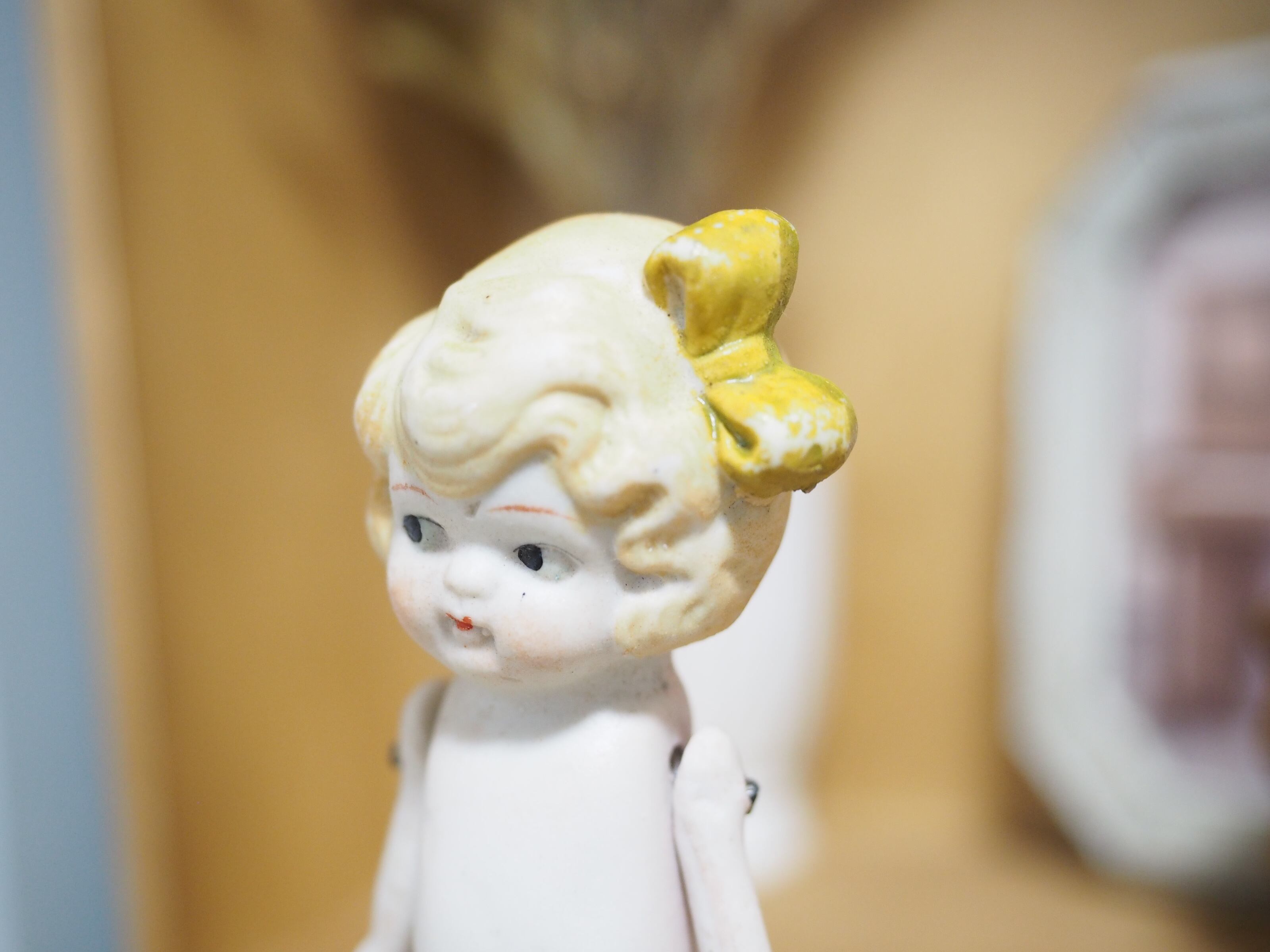 ふんわりしたヘアは淡く上品にペイントされ、大きな縦リボンはくるんと巻かれたしわ、形がとてもかわいいです(ペイント剥げあり)。