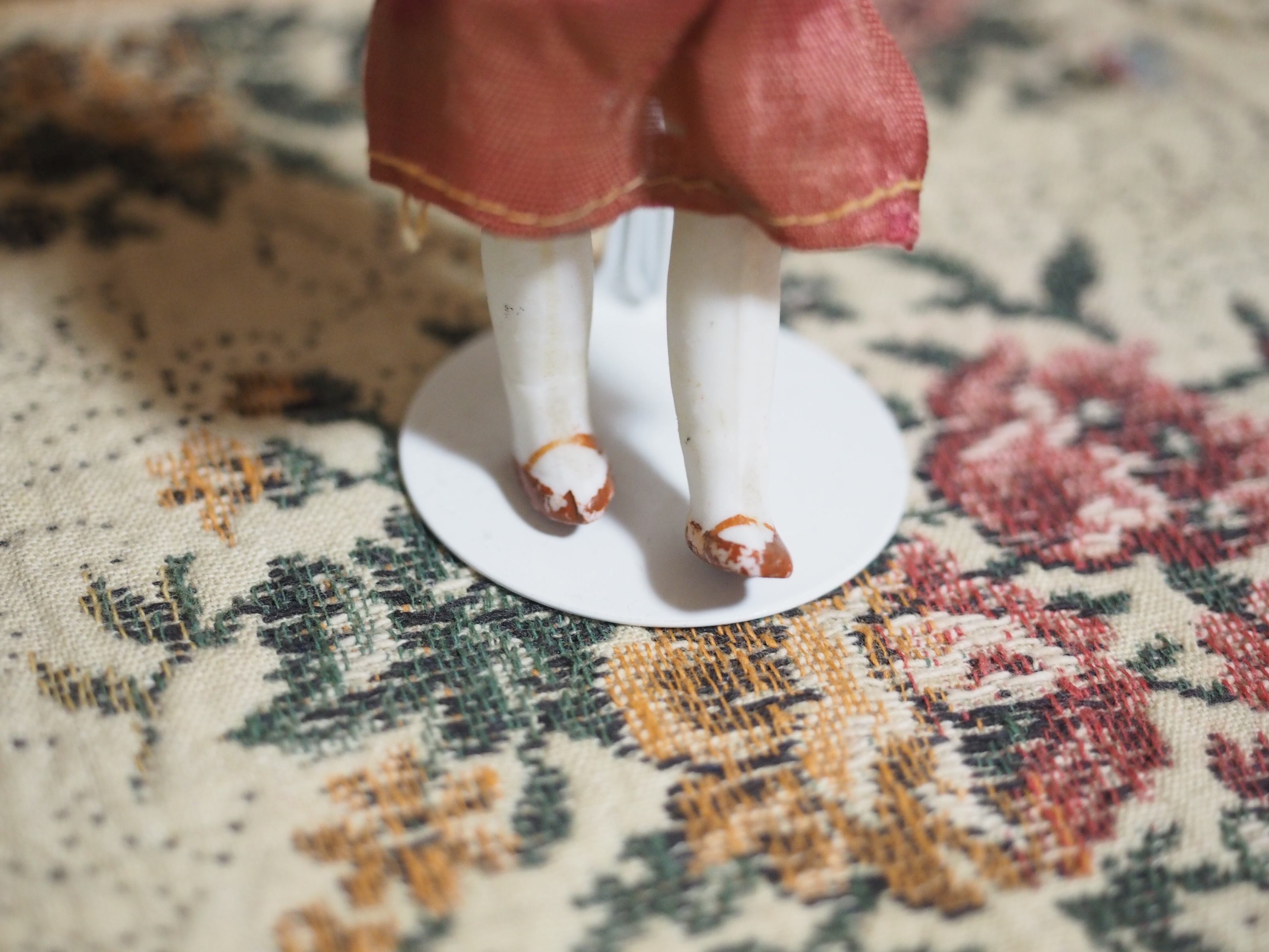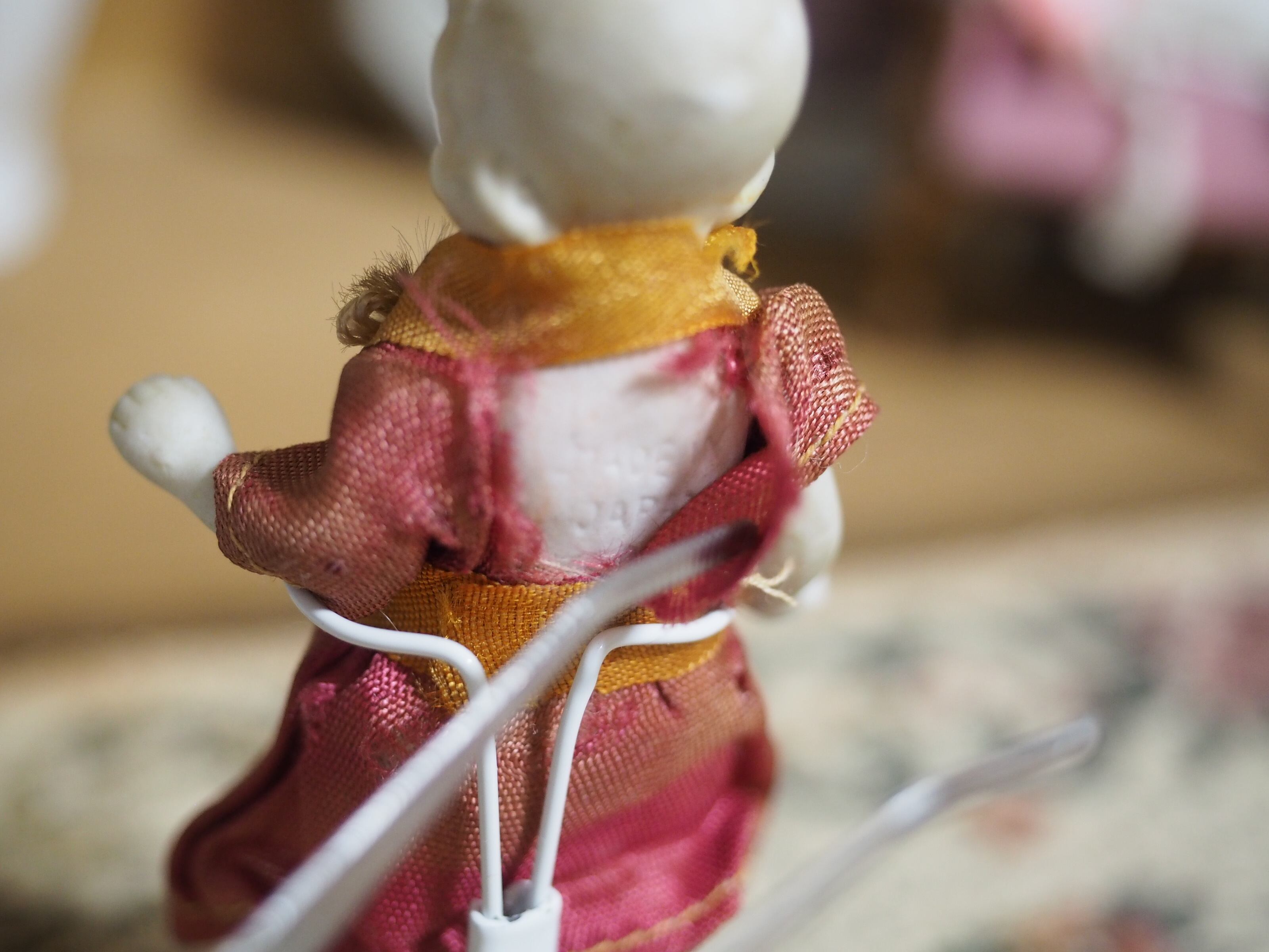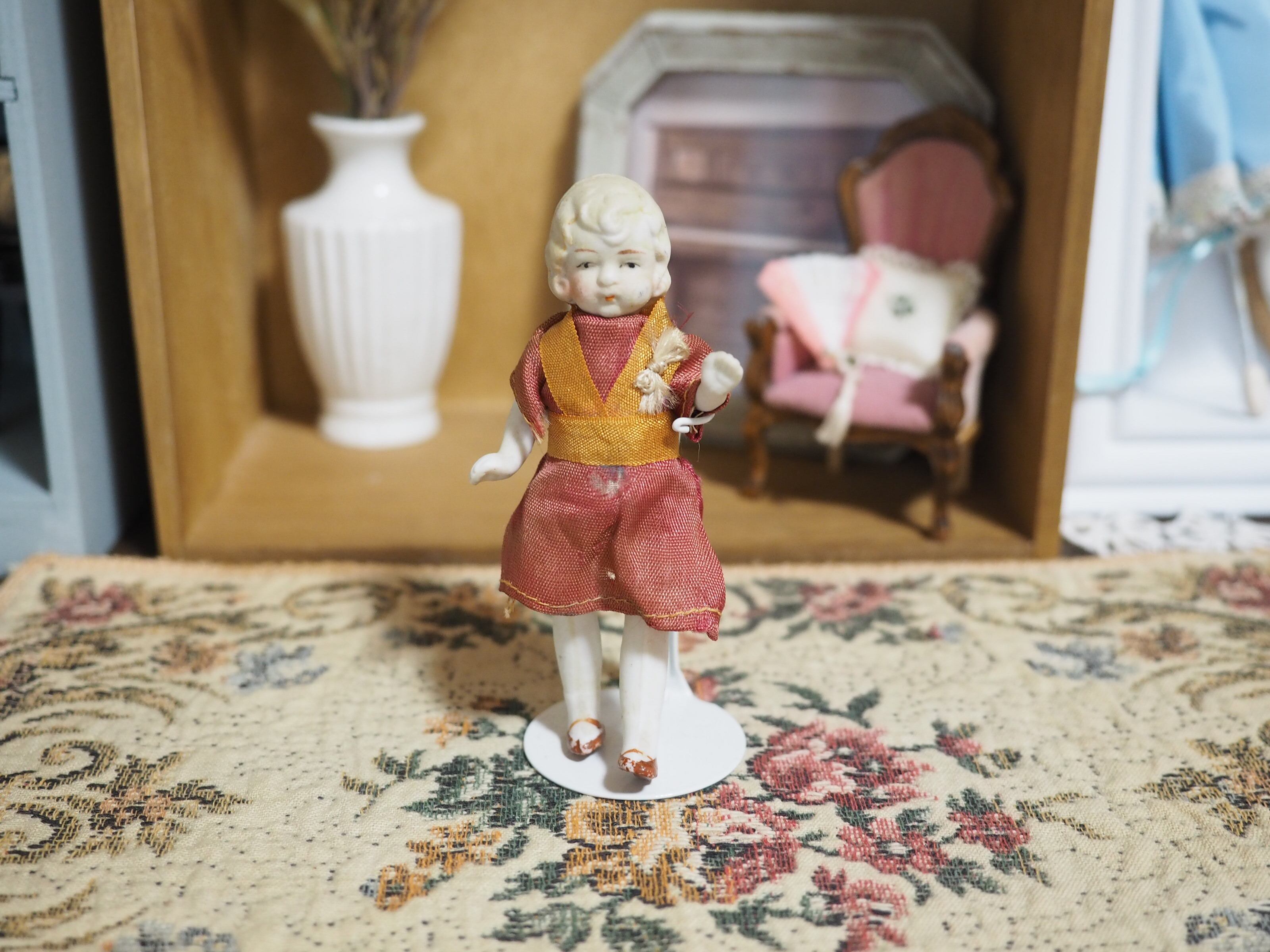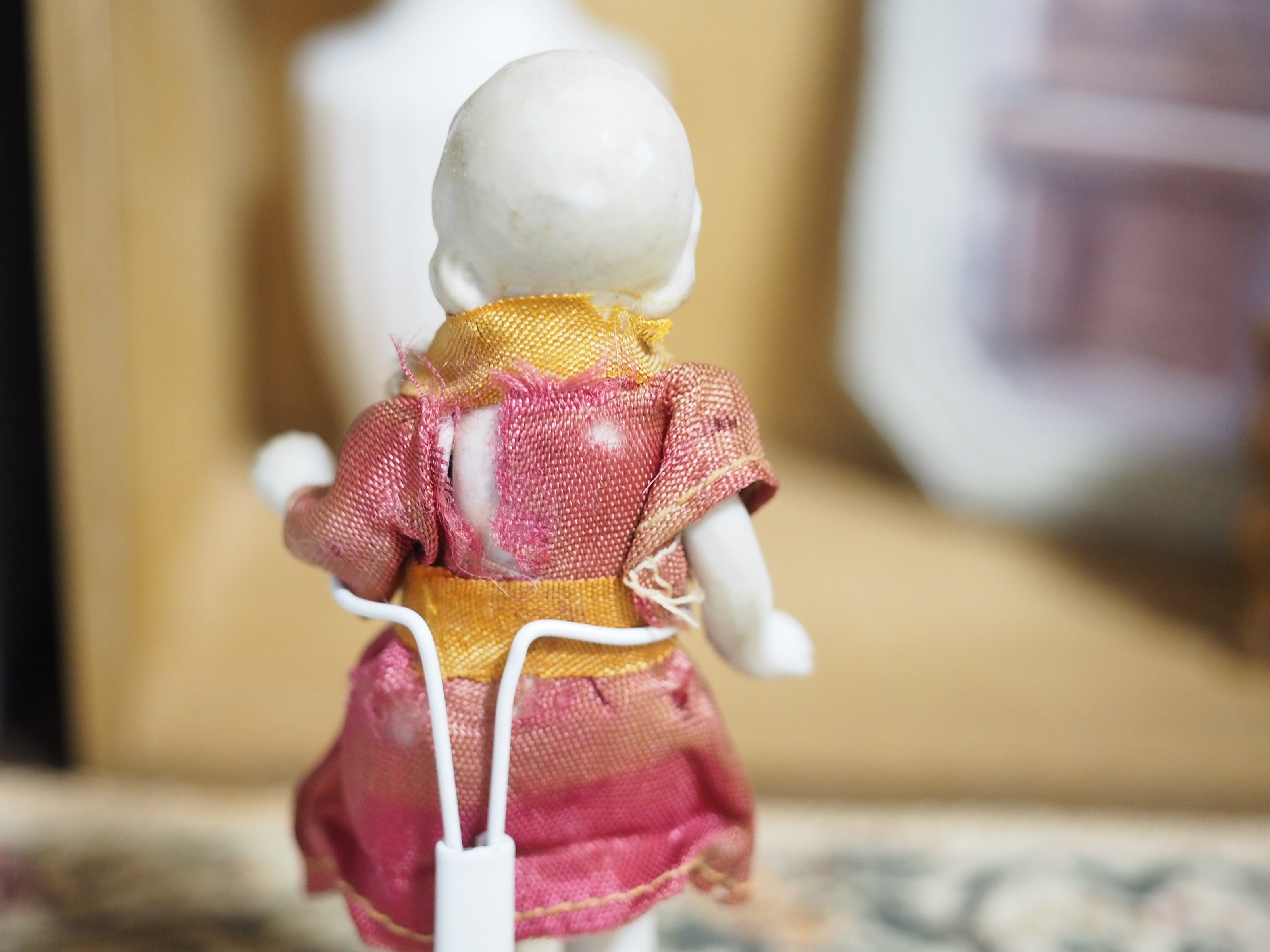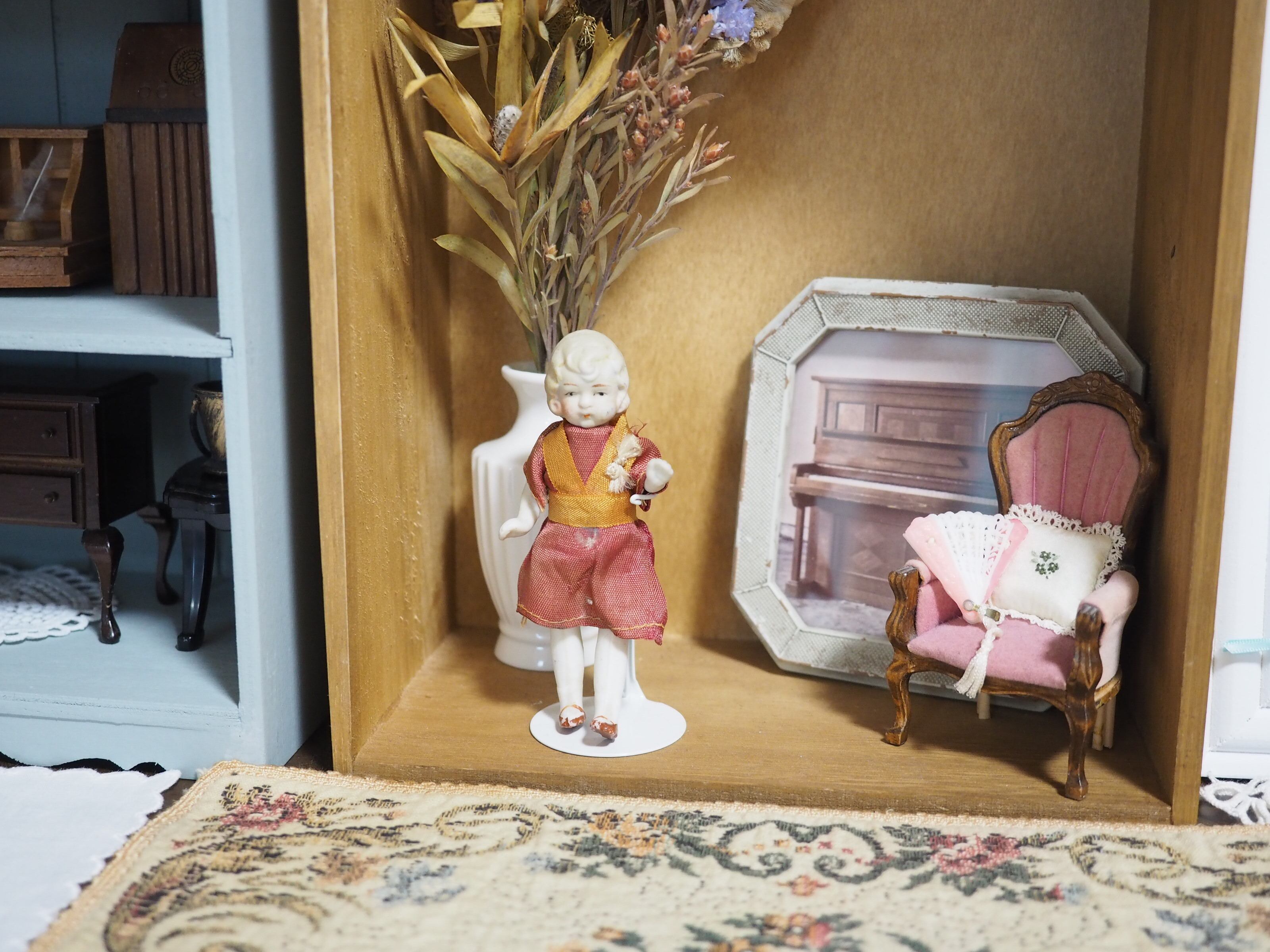 当時物のお洋服は経年変色や裂け、穴がありますが、とても上品なデザインと色合いで、ドールの雰囲気にぴったりです。