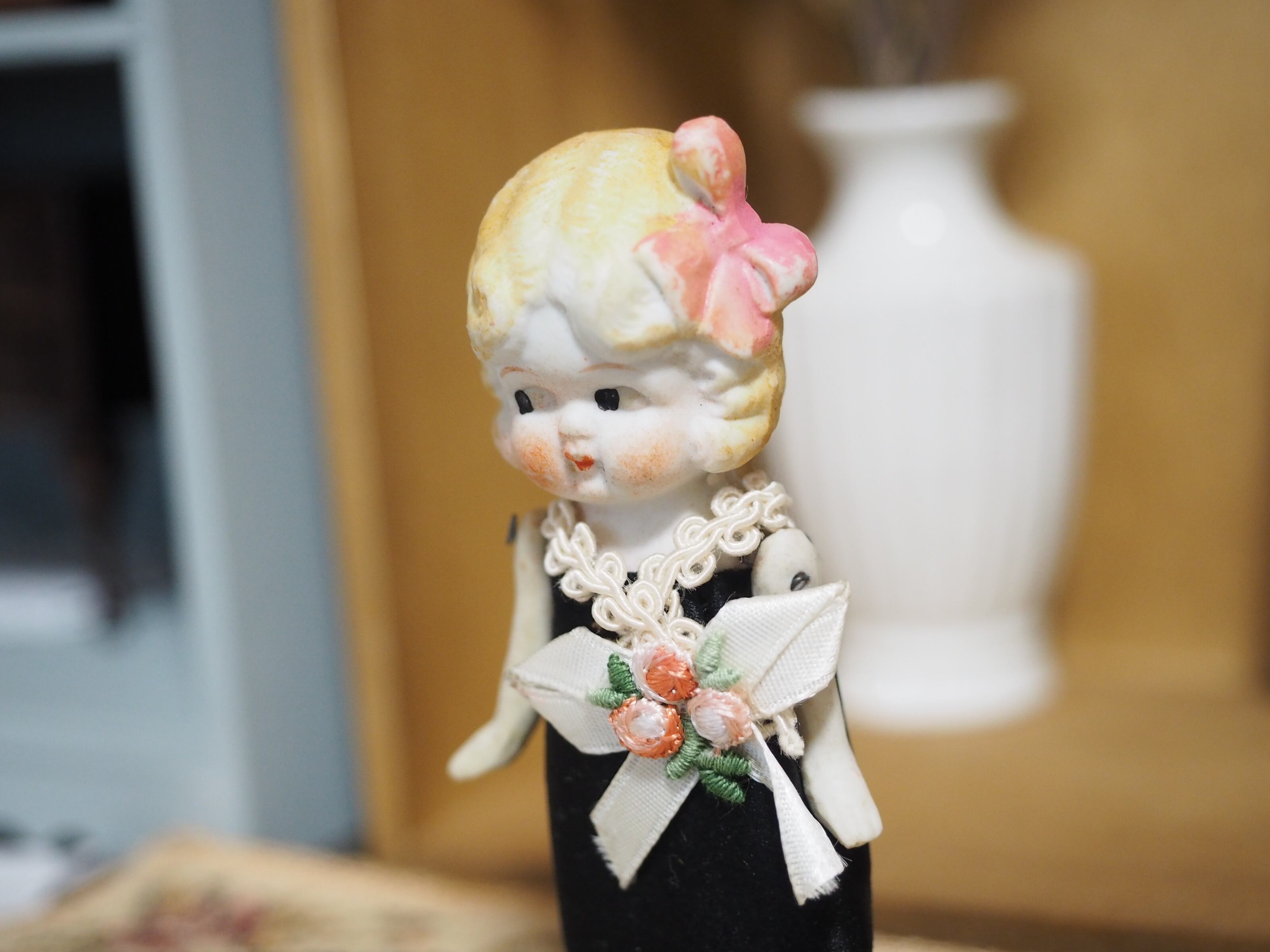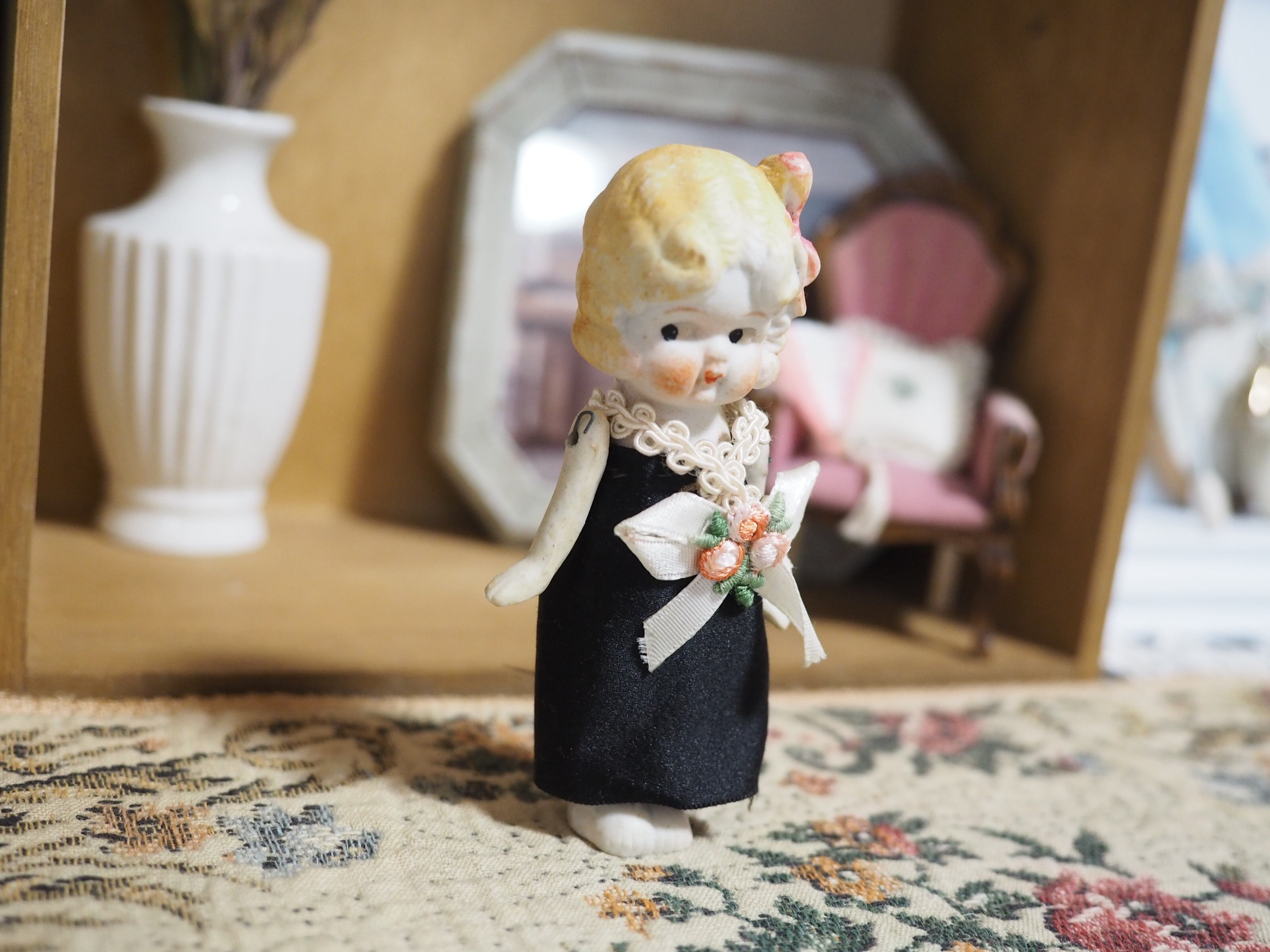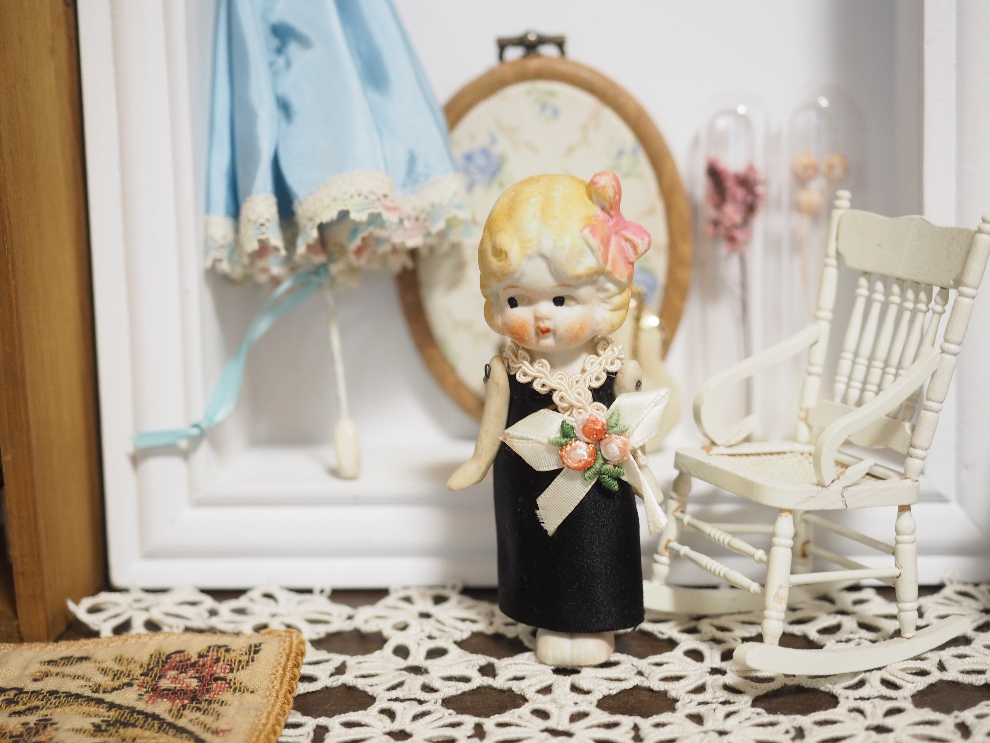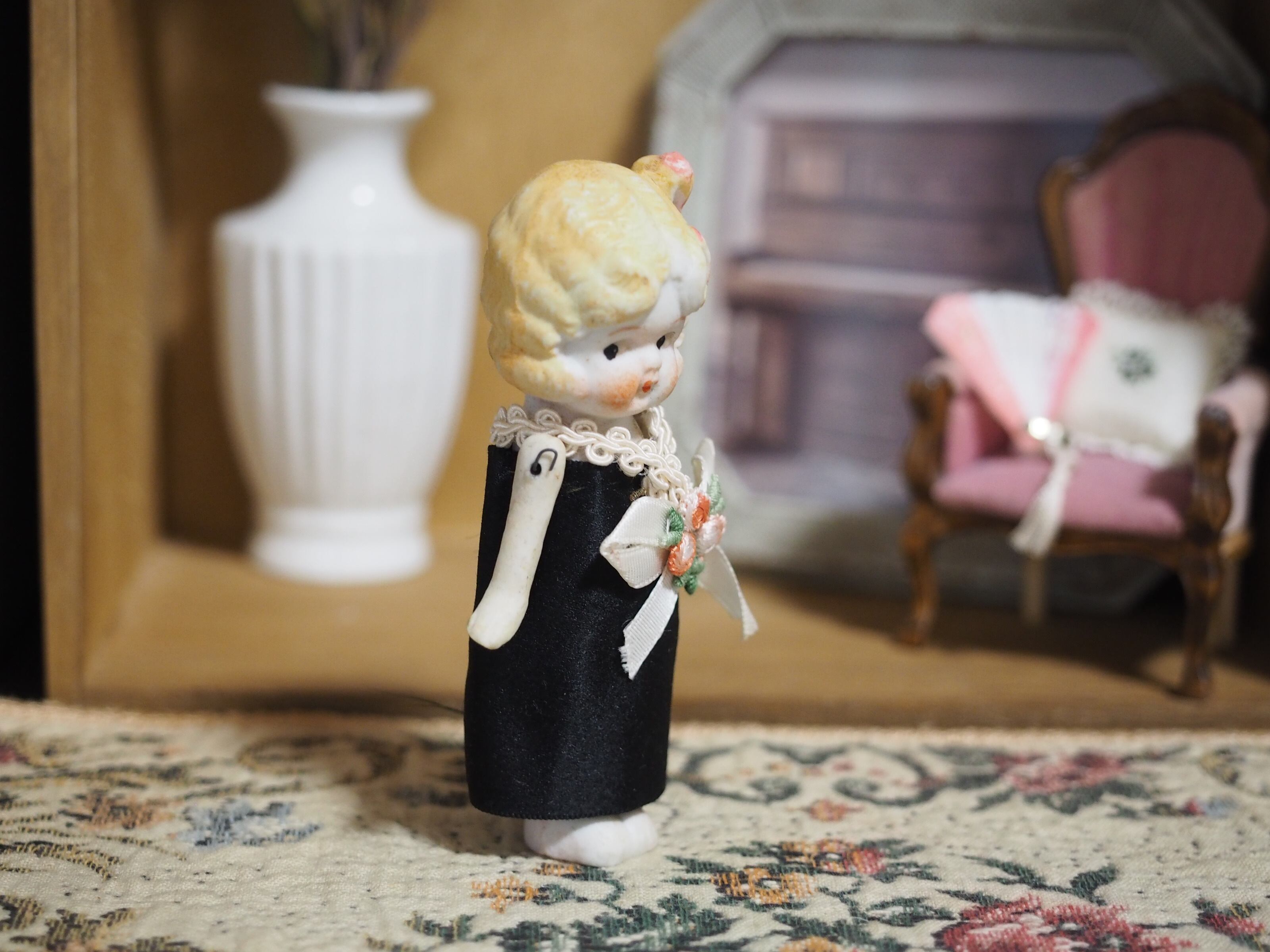 ワイヤージョイントの手活人形、ウェーブヘアにリボンを付けた女の子は小さなサイズが多く、こちらはやや大き目でシックなブラックワンピースを着用しています。