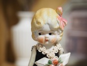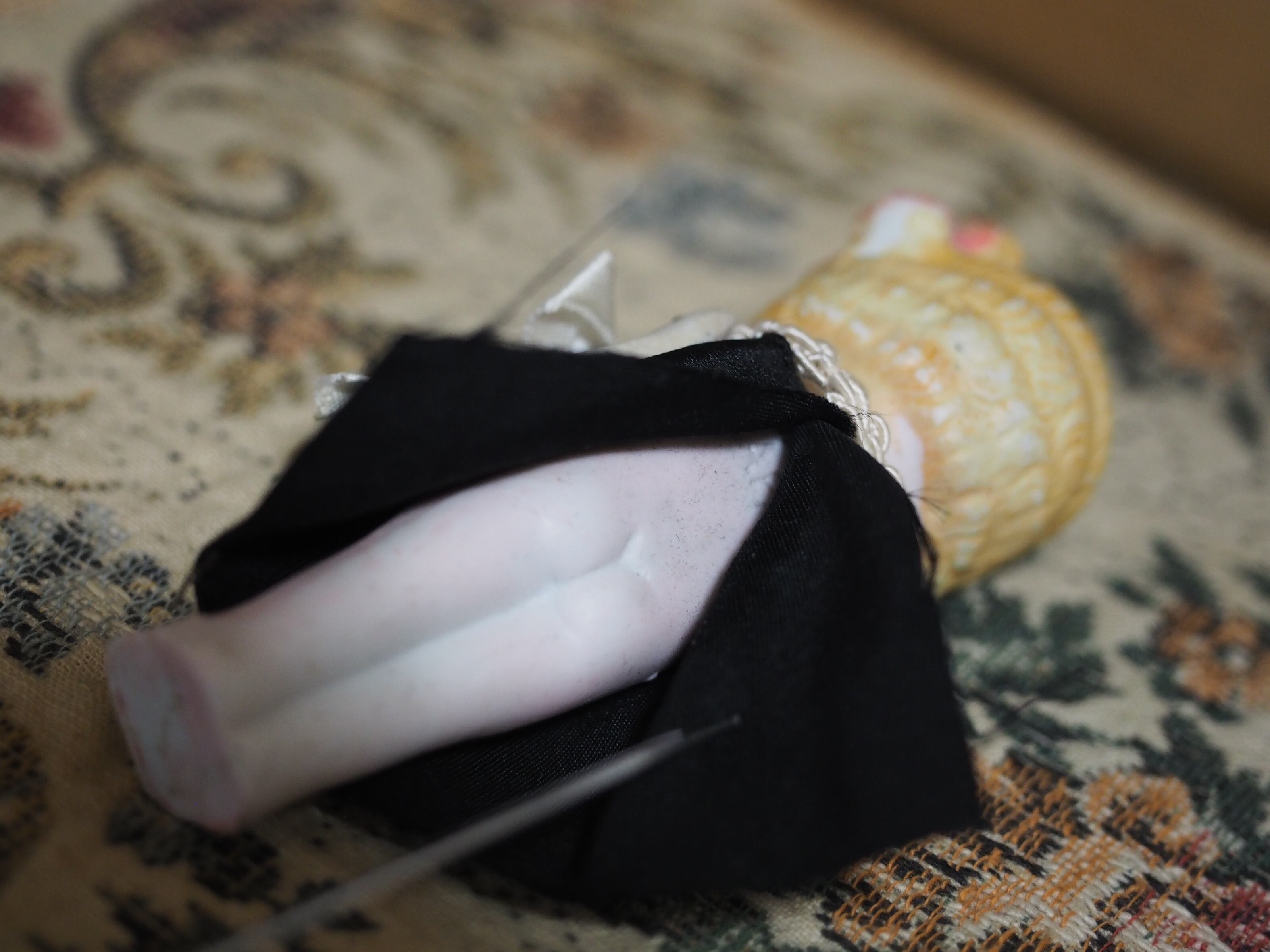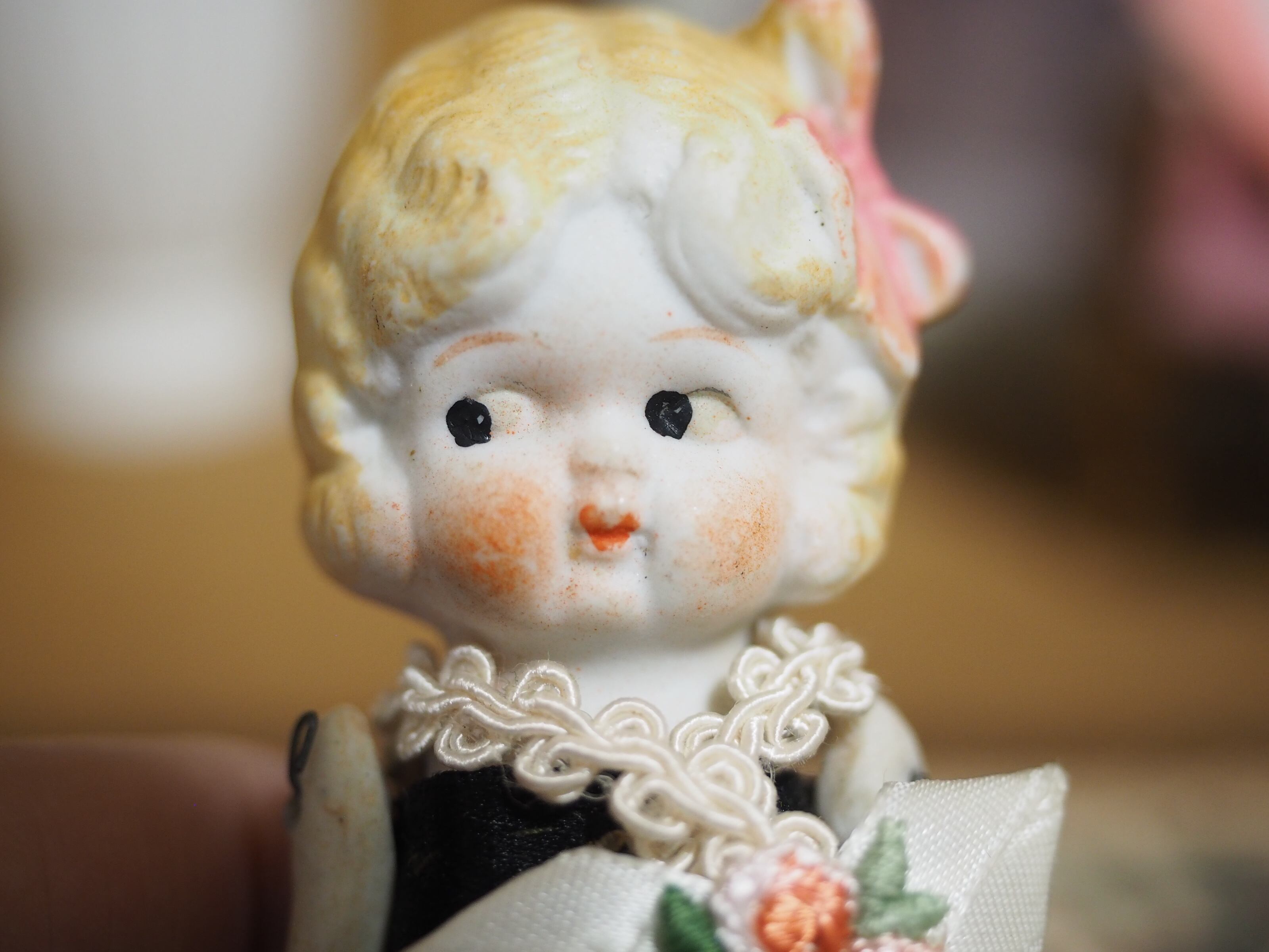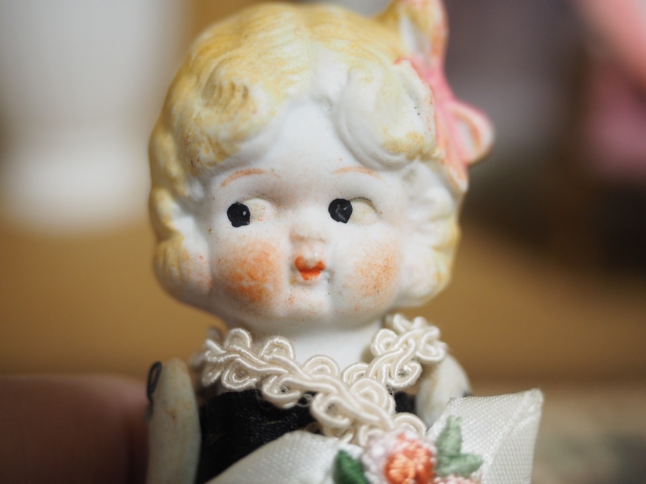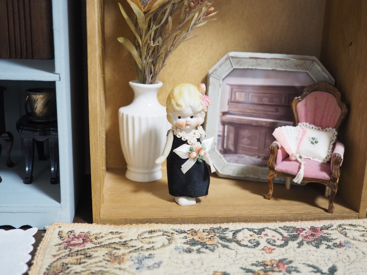 ワイヤージョイントの手活人形、ウェーブヘアにリボンを付けた女の子は小さなサイズが多く、こちらはやや大き目でシックなブラックワンピースを着用しています。