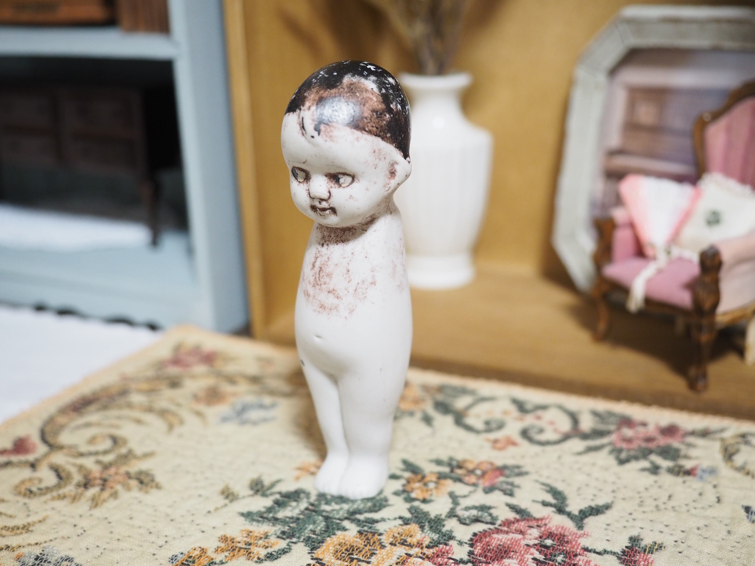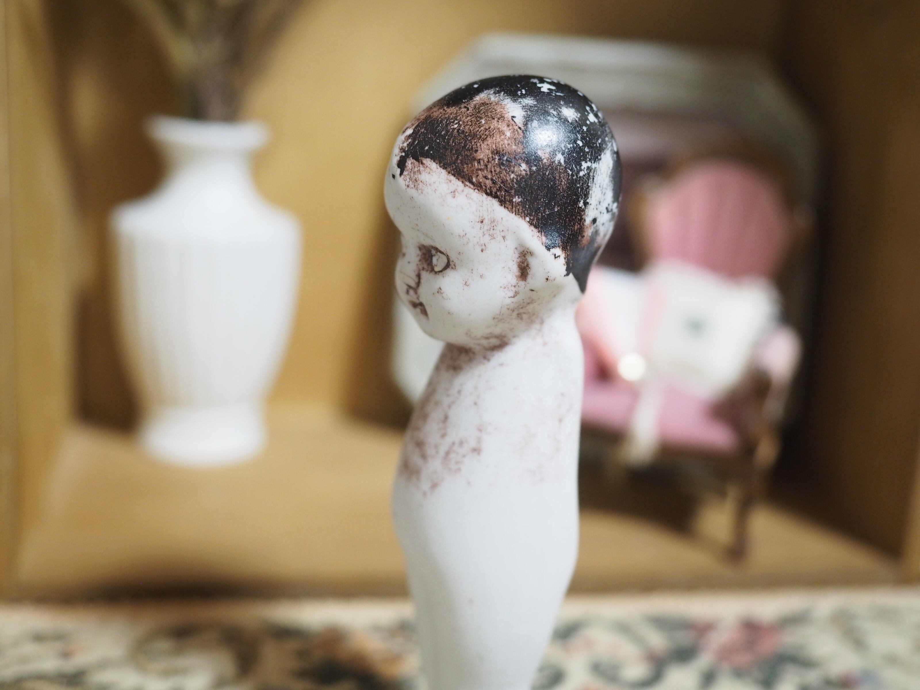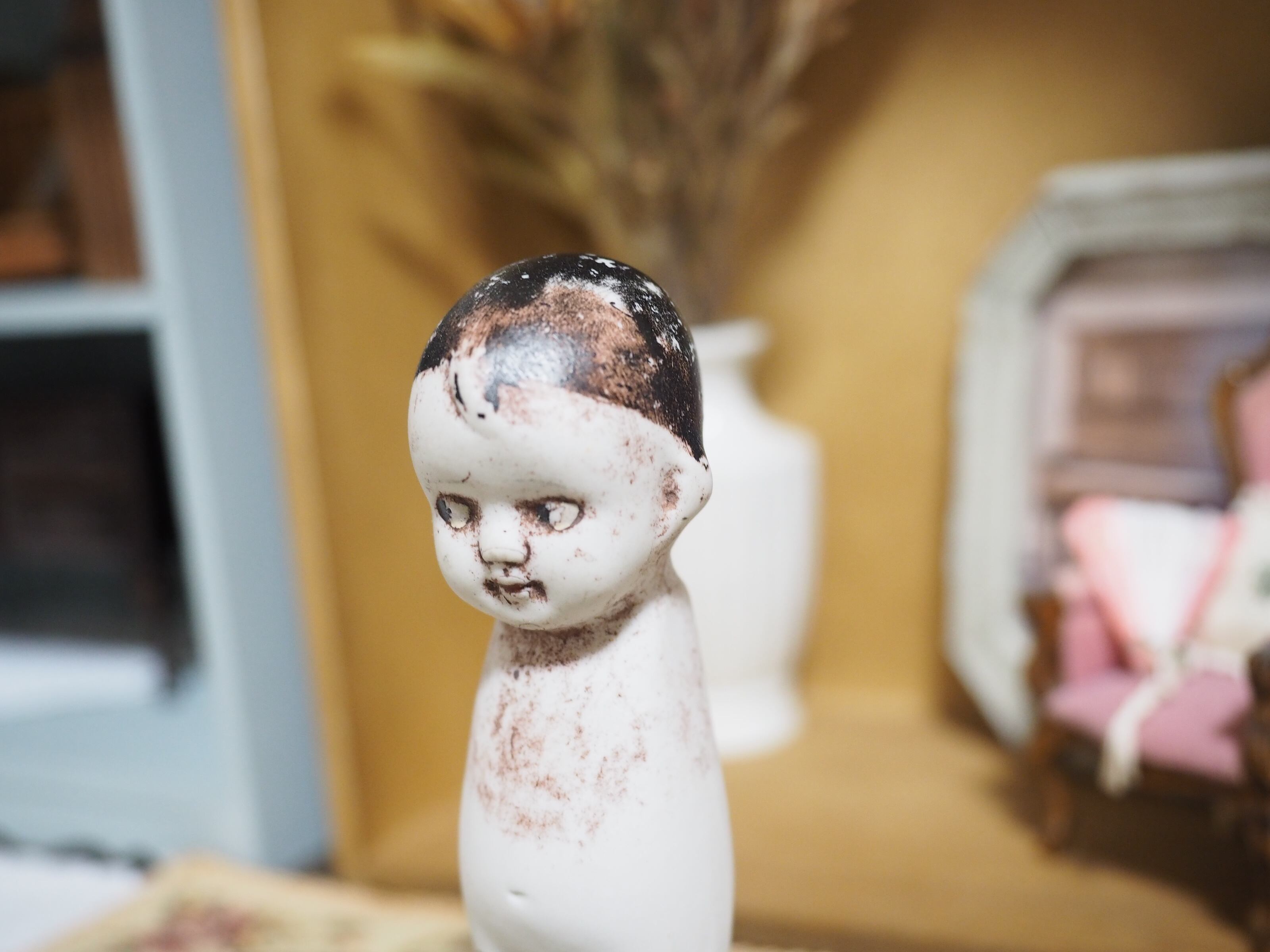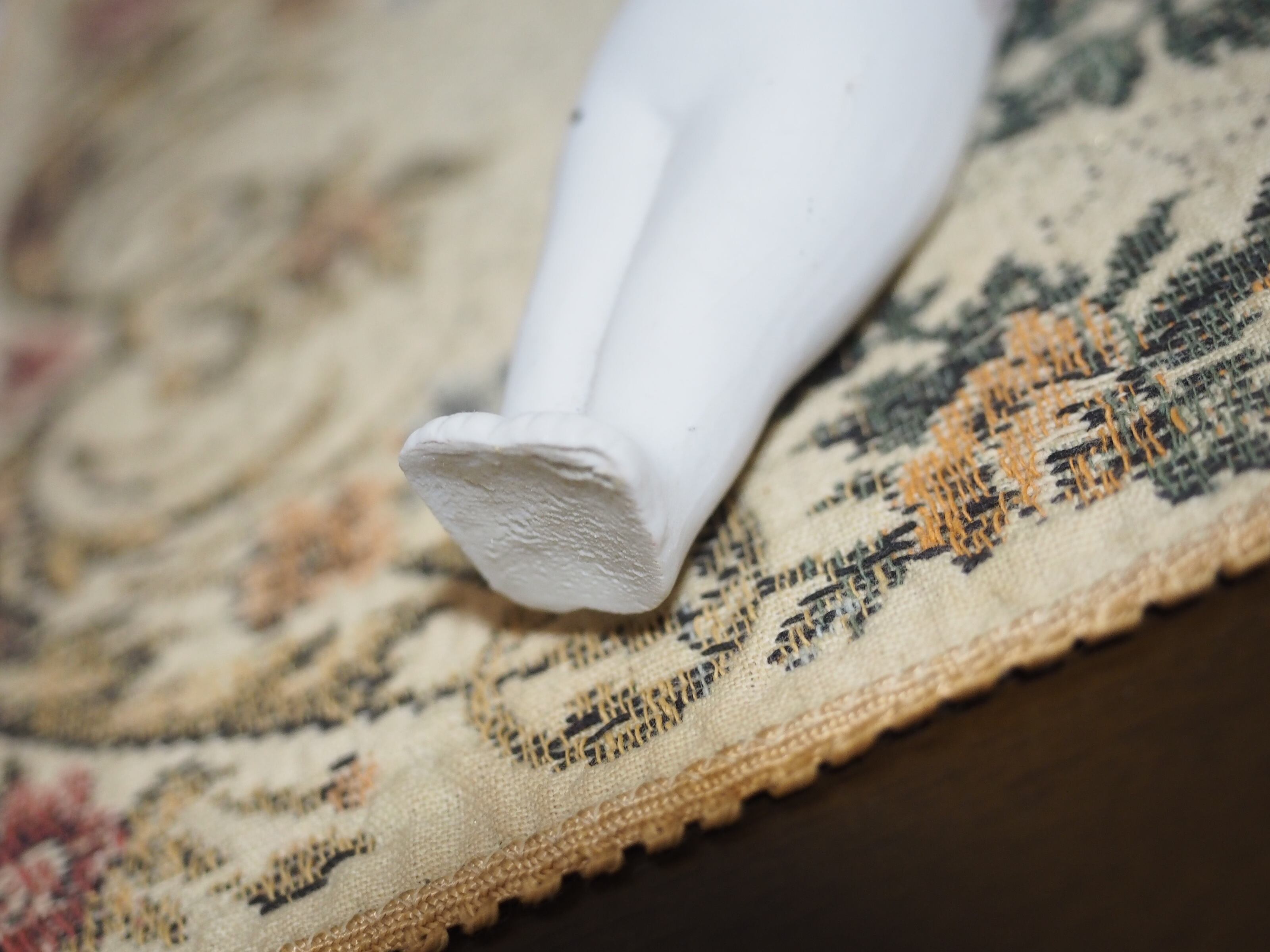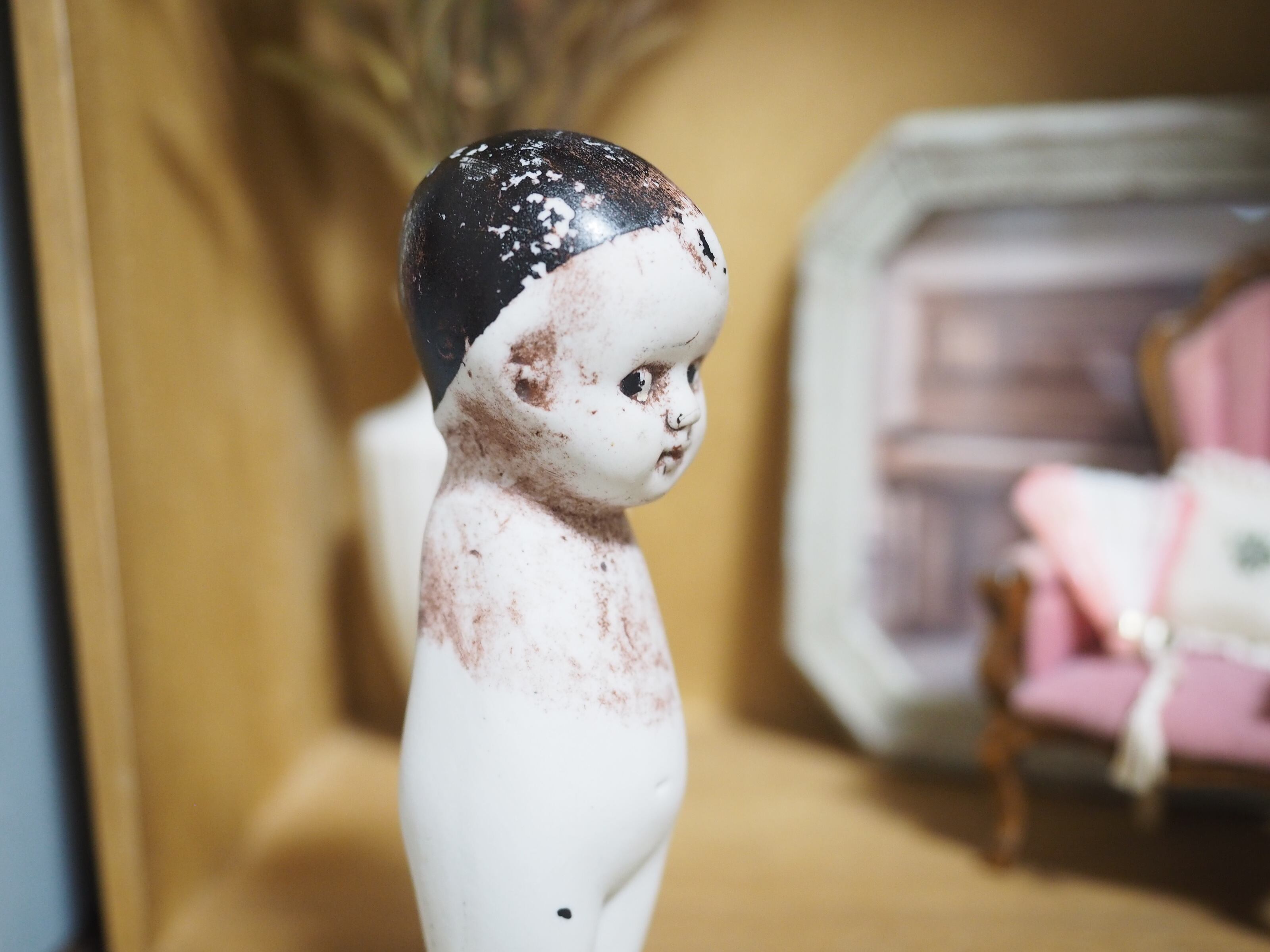 腕はなく、表情と共になんともミステリアスなビスクドールです。