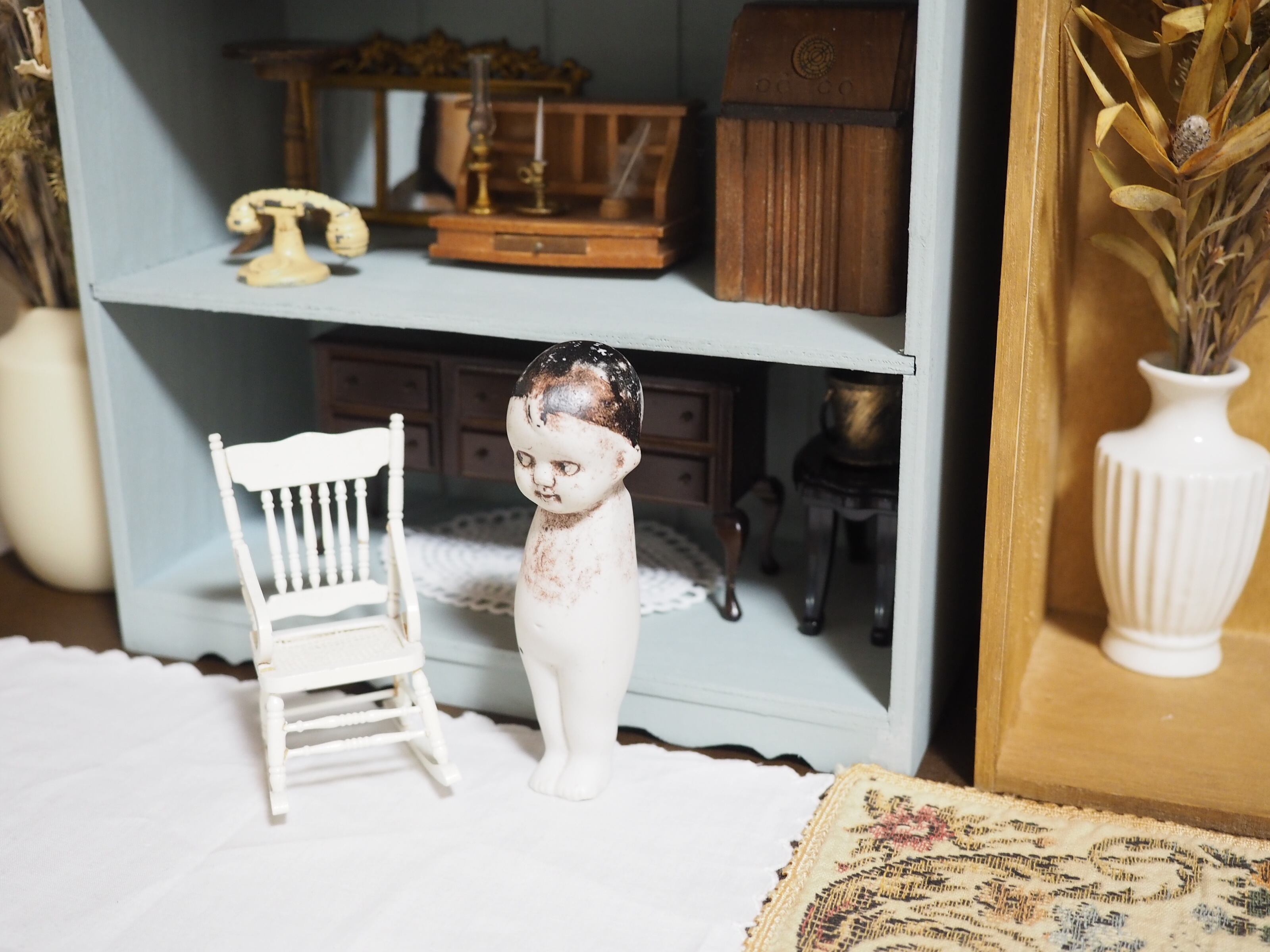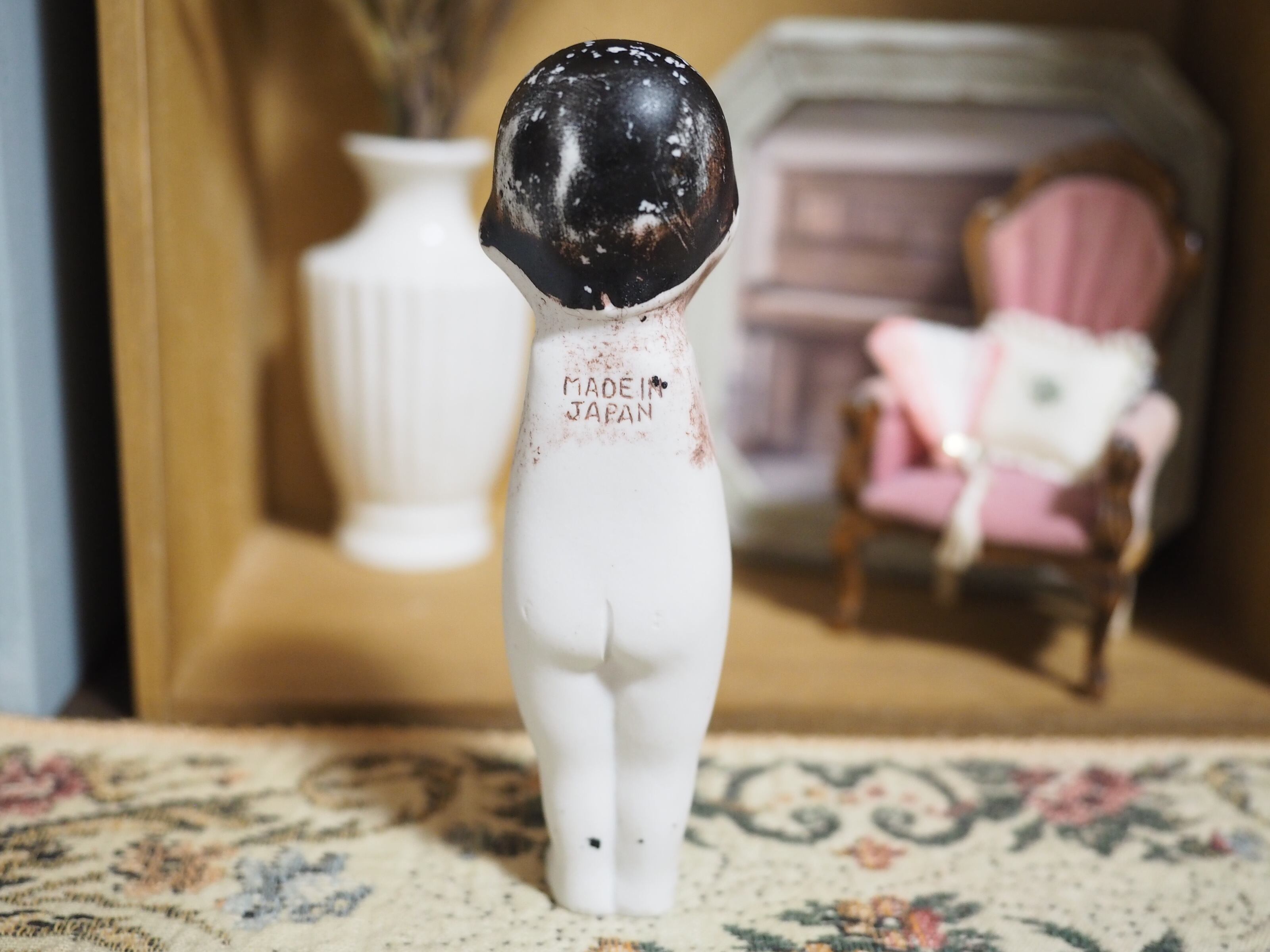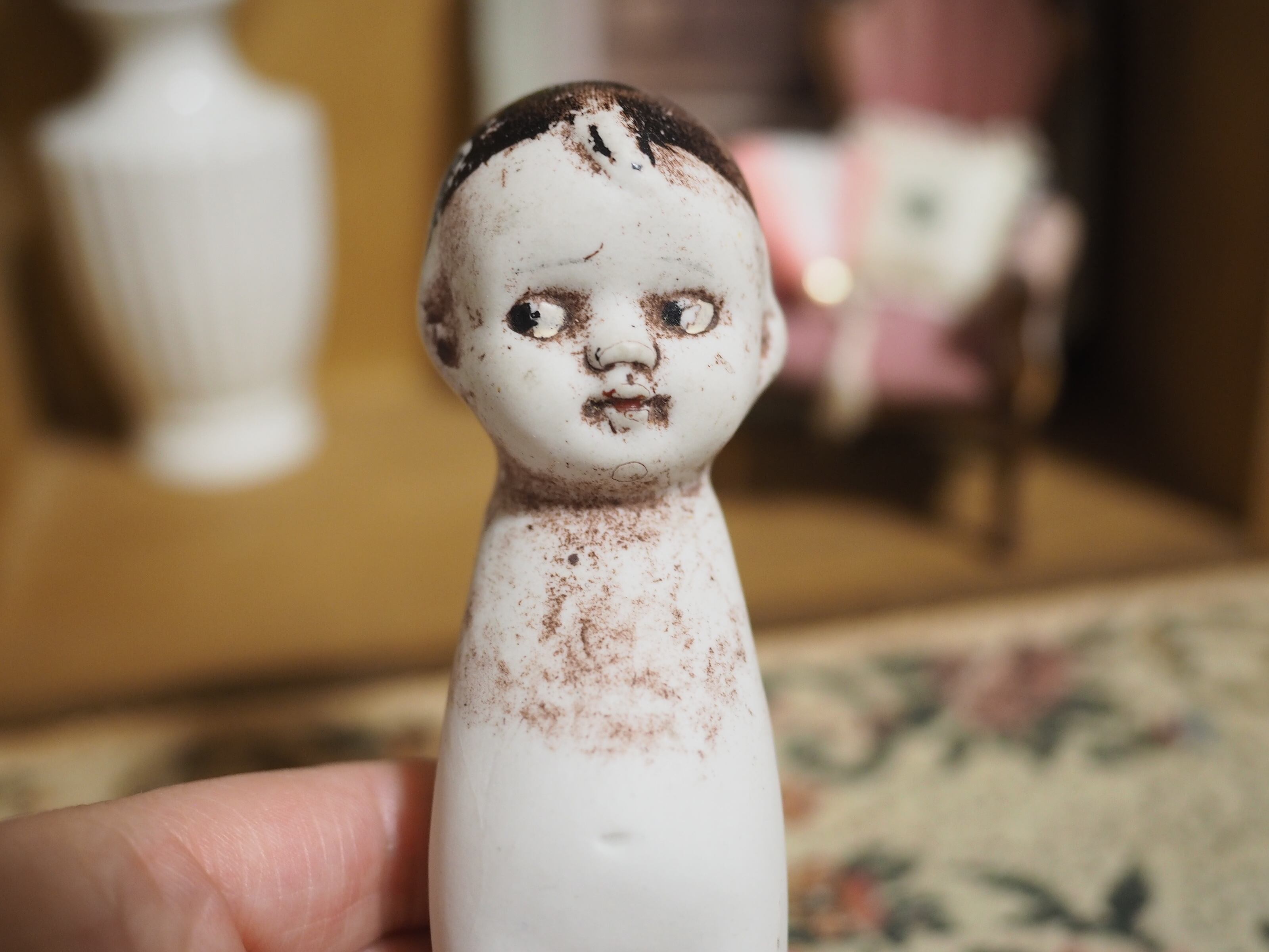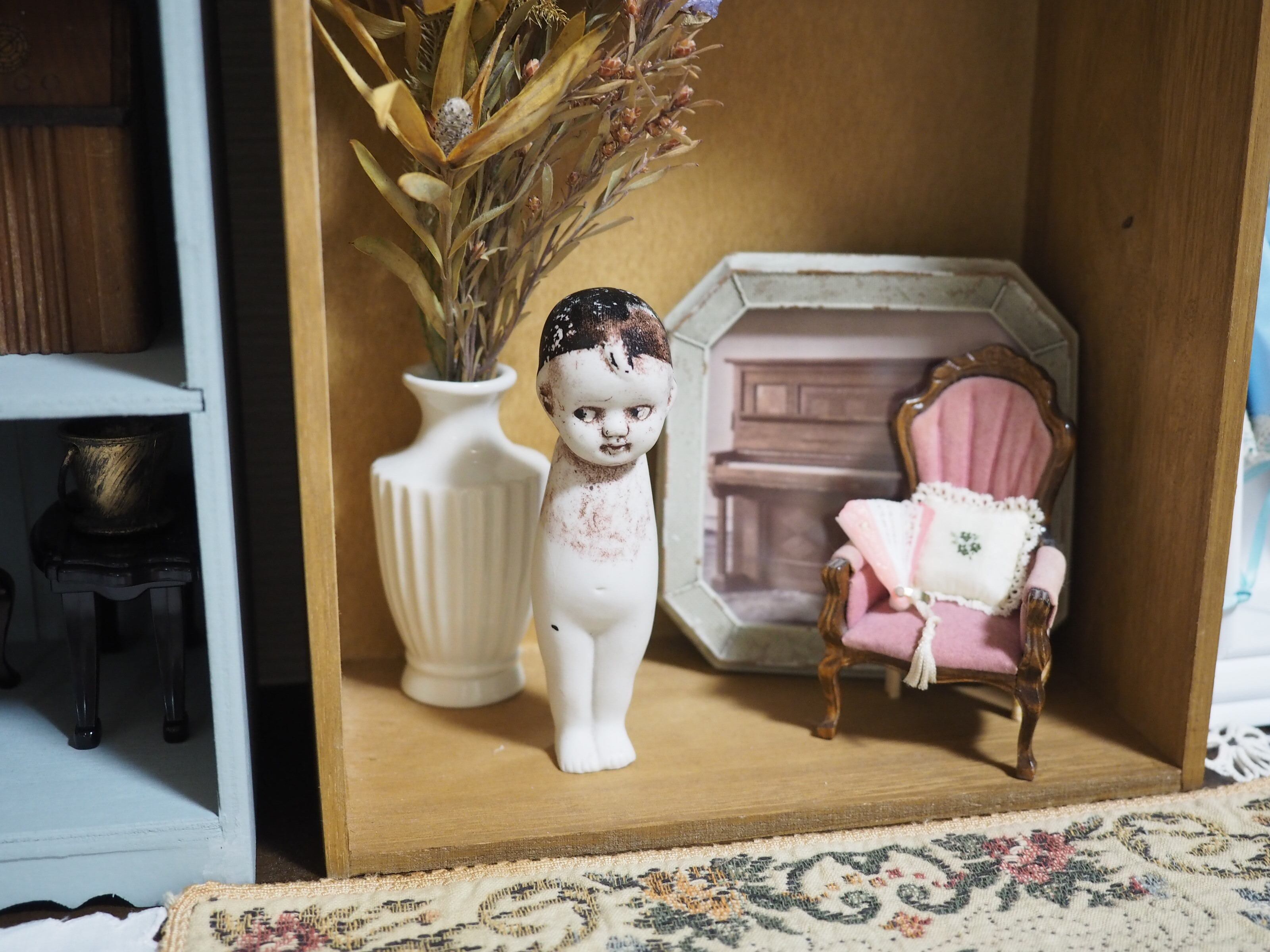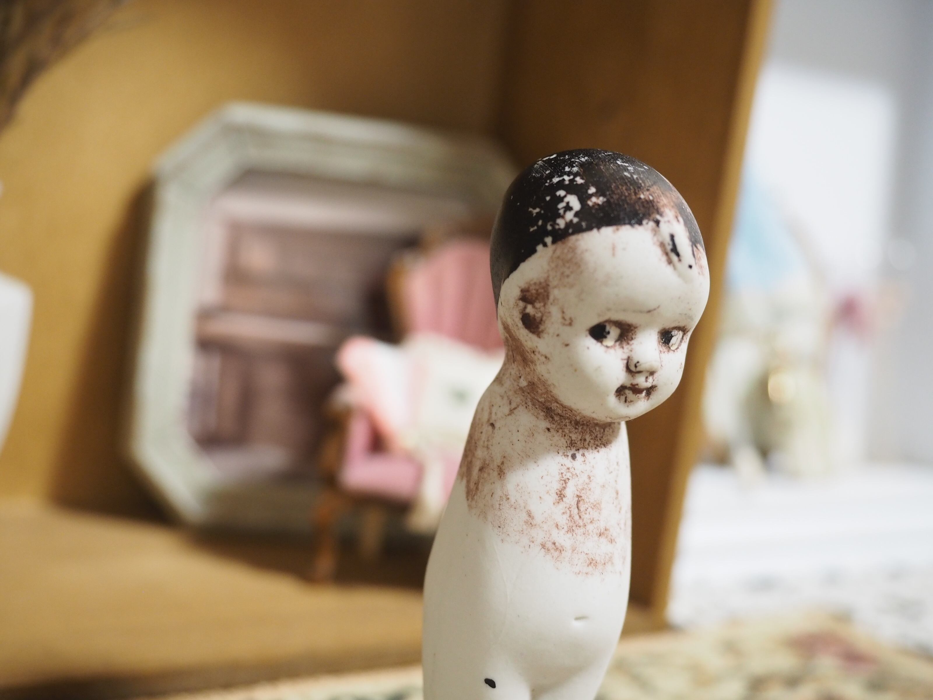 腕はなく、表情と共になんともミステリアスなビスクドールです。