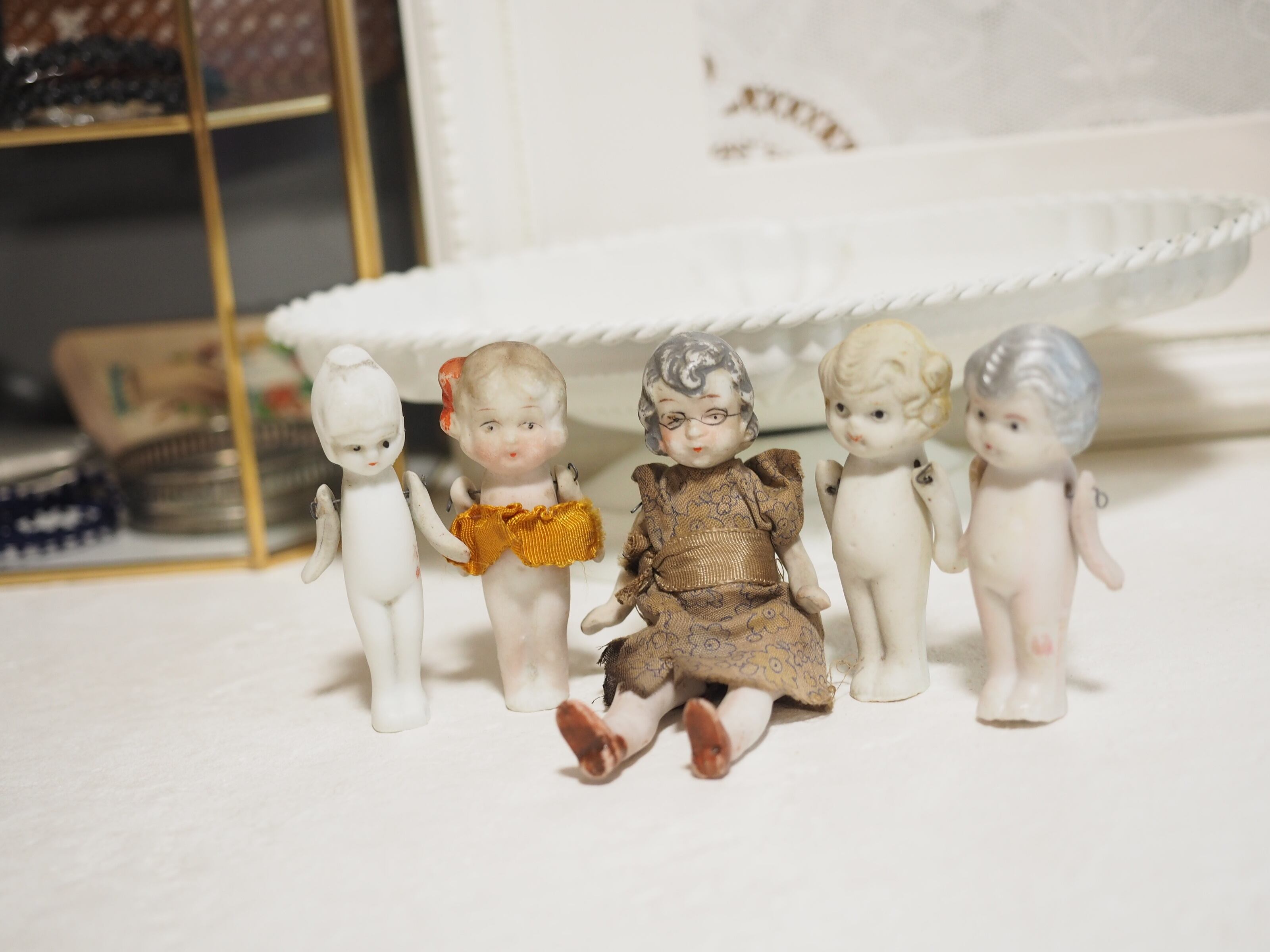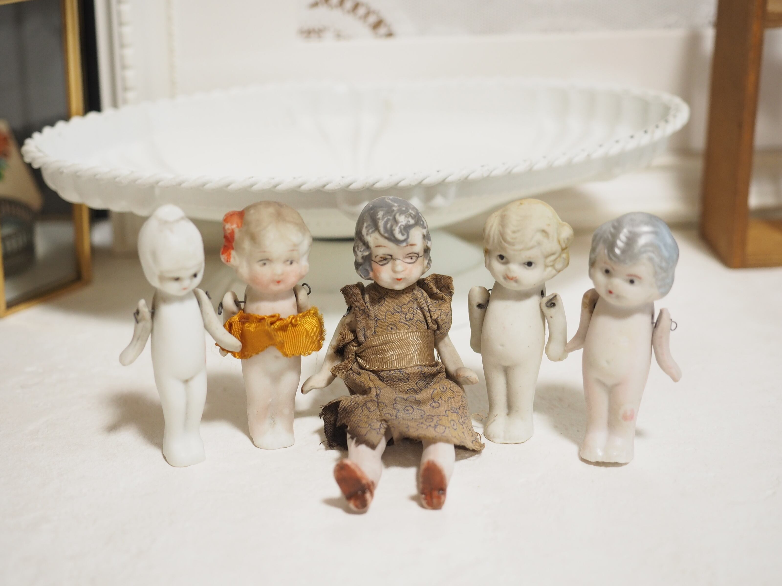 優し気なおばあちゃんと、個性のある子供たちのようなビスクドールのセットです。