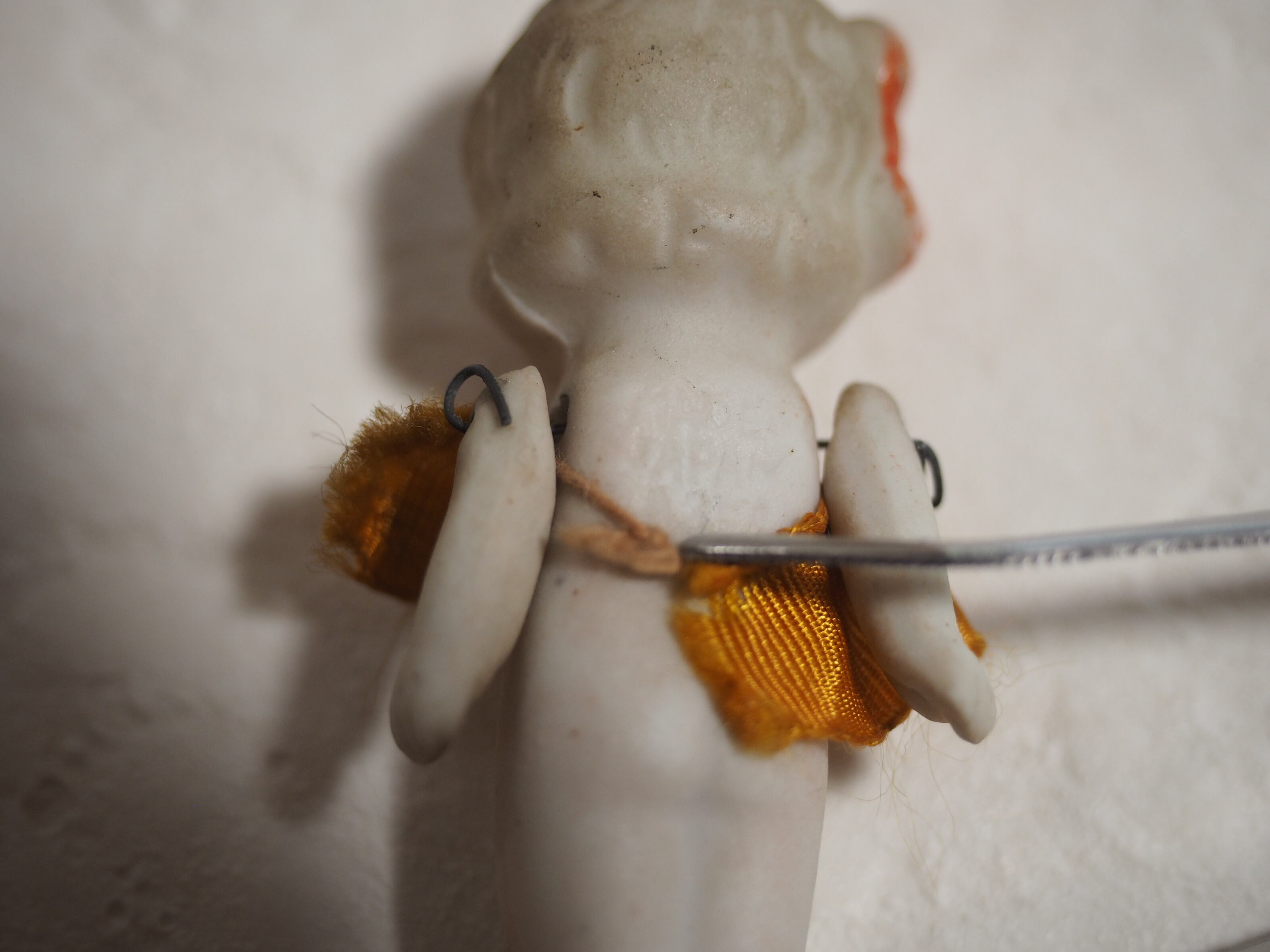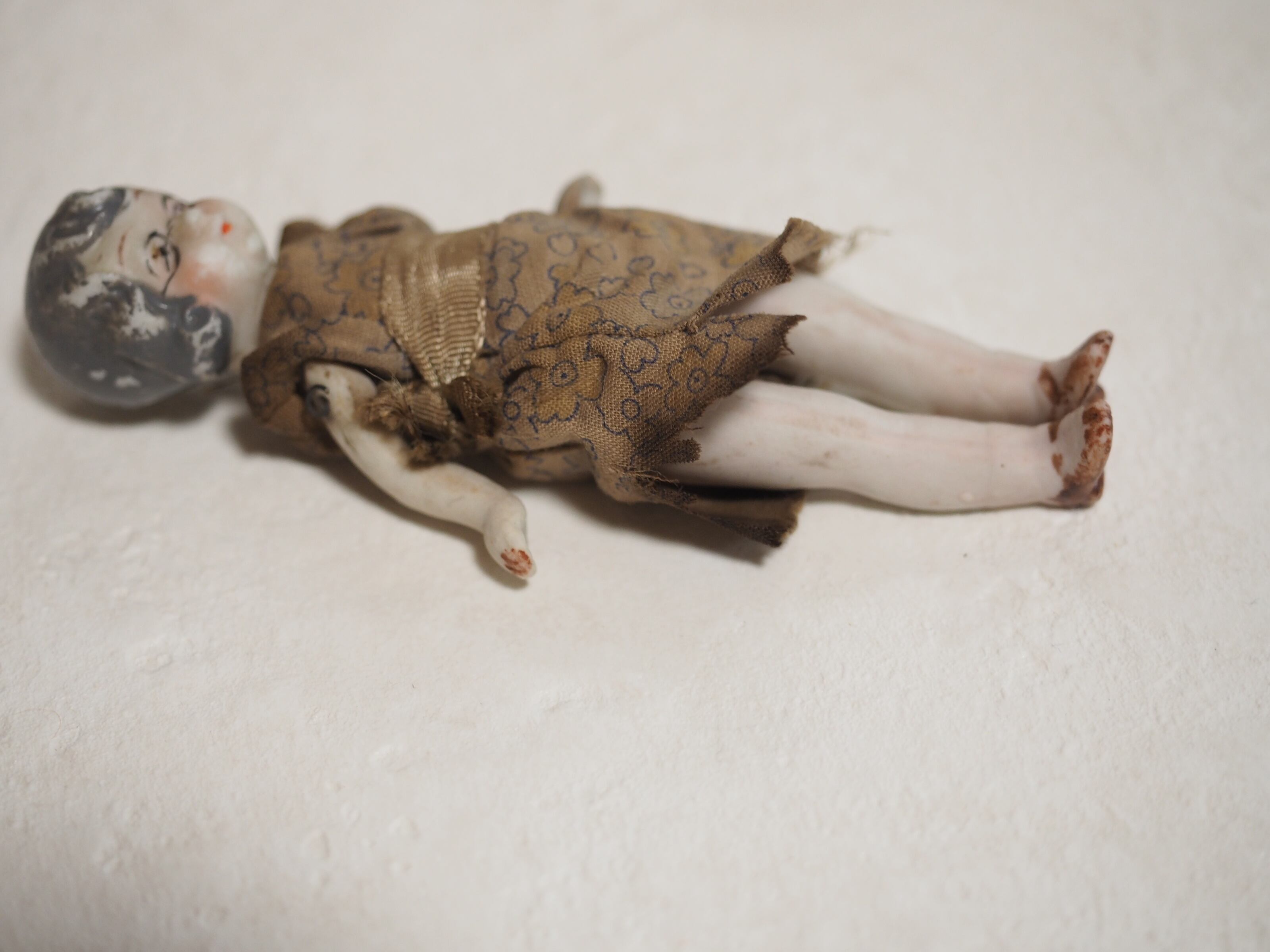 ・おばあちゃんビスクは花柄ワンピースにストラップシューズがおしゃれですが、ワンピースは焼けたように変色、ほつれがあります。