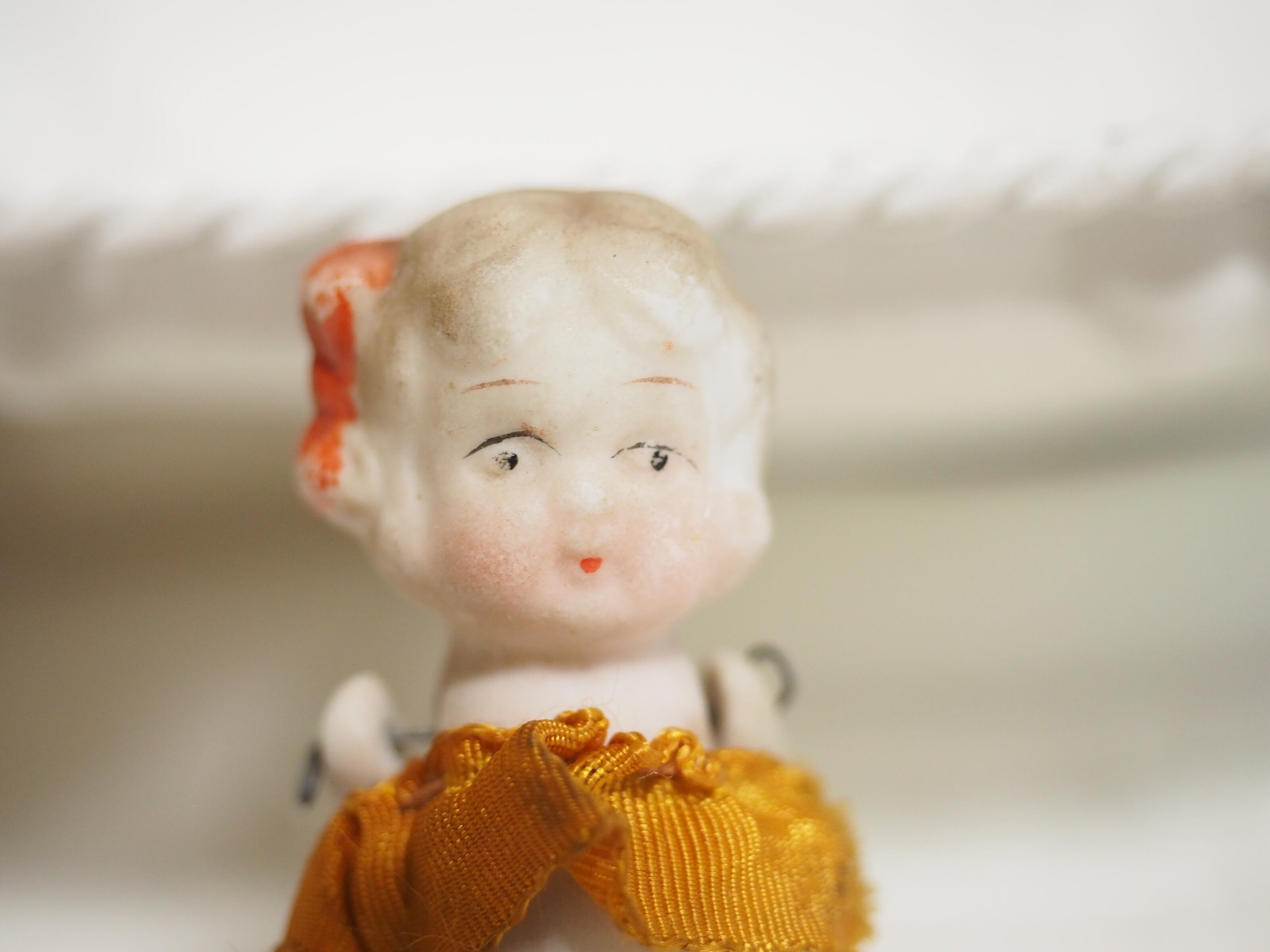 リボンはやや濃いお色で、しわも細やかに成型されています。ベージュカラーの淡いヘアで優しい雰囲気。