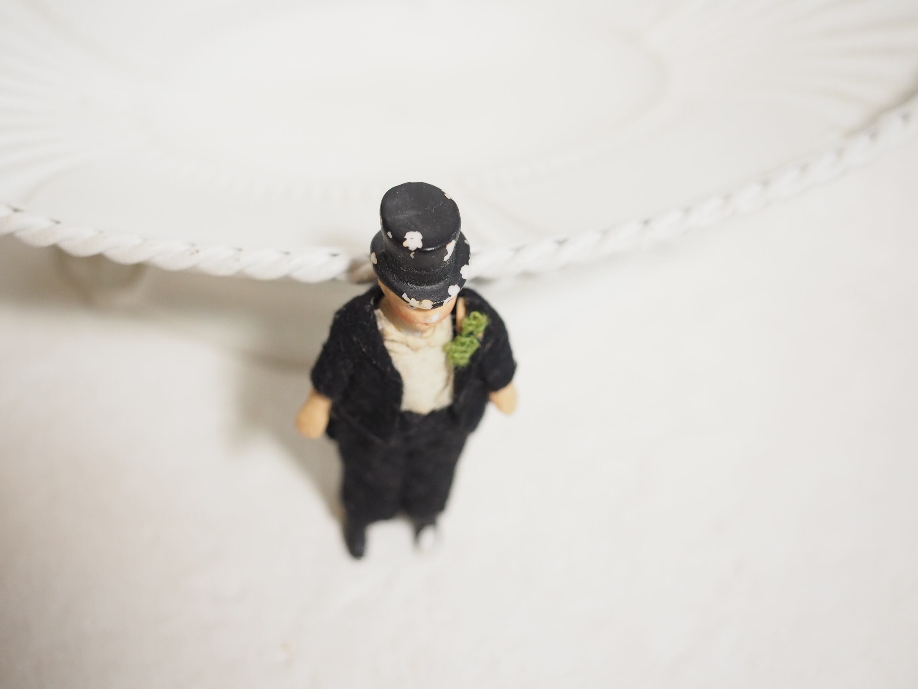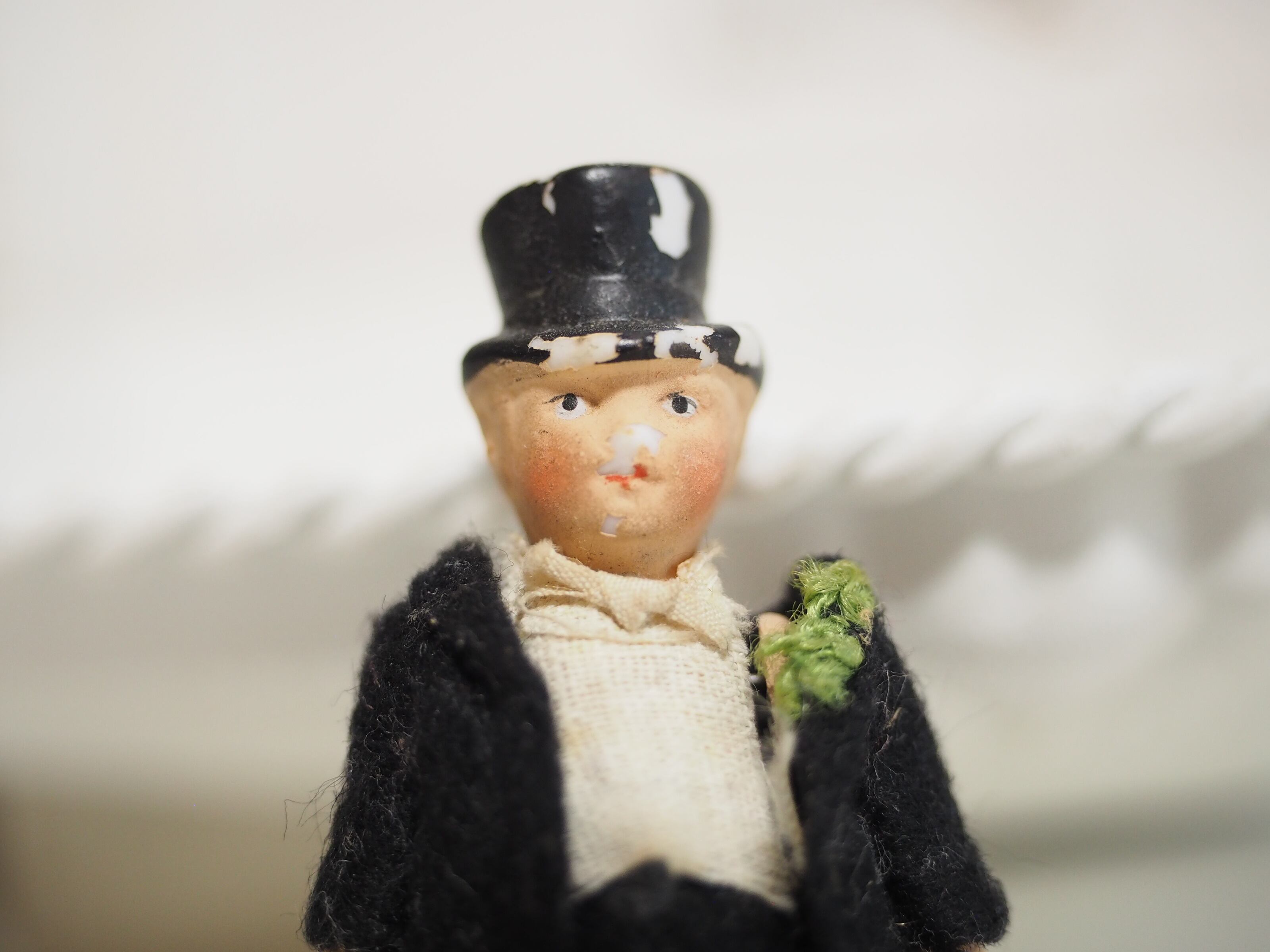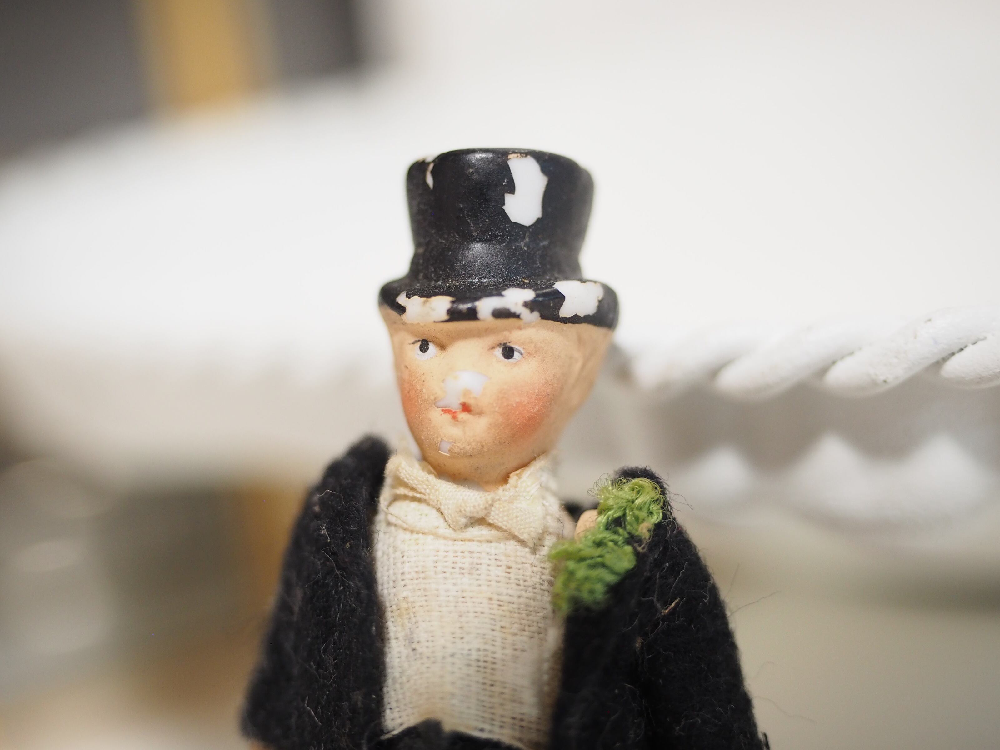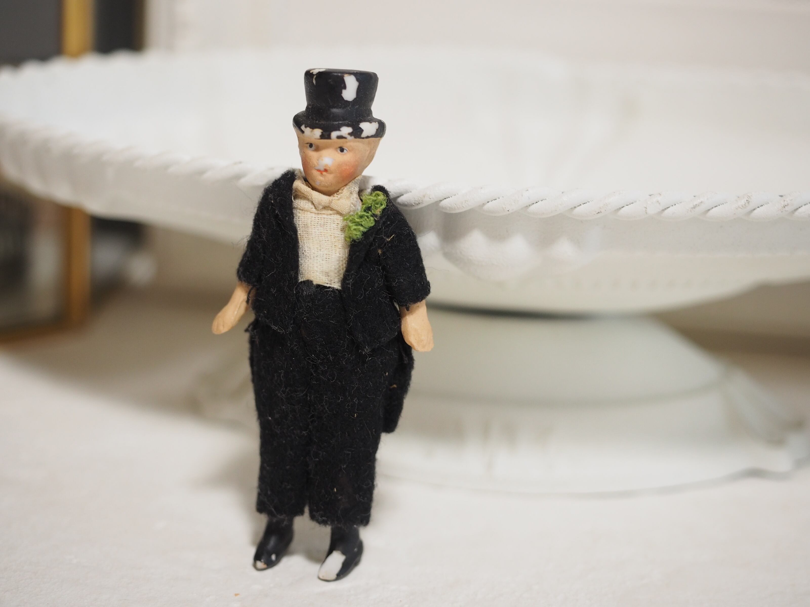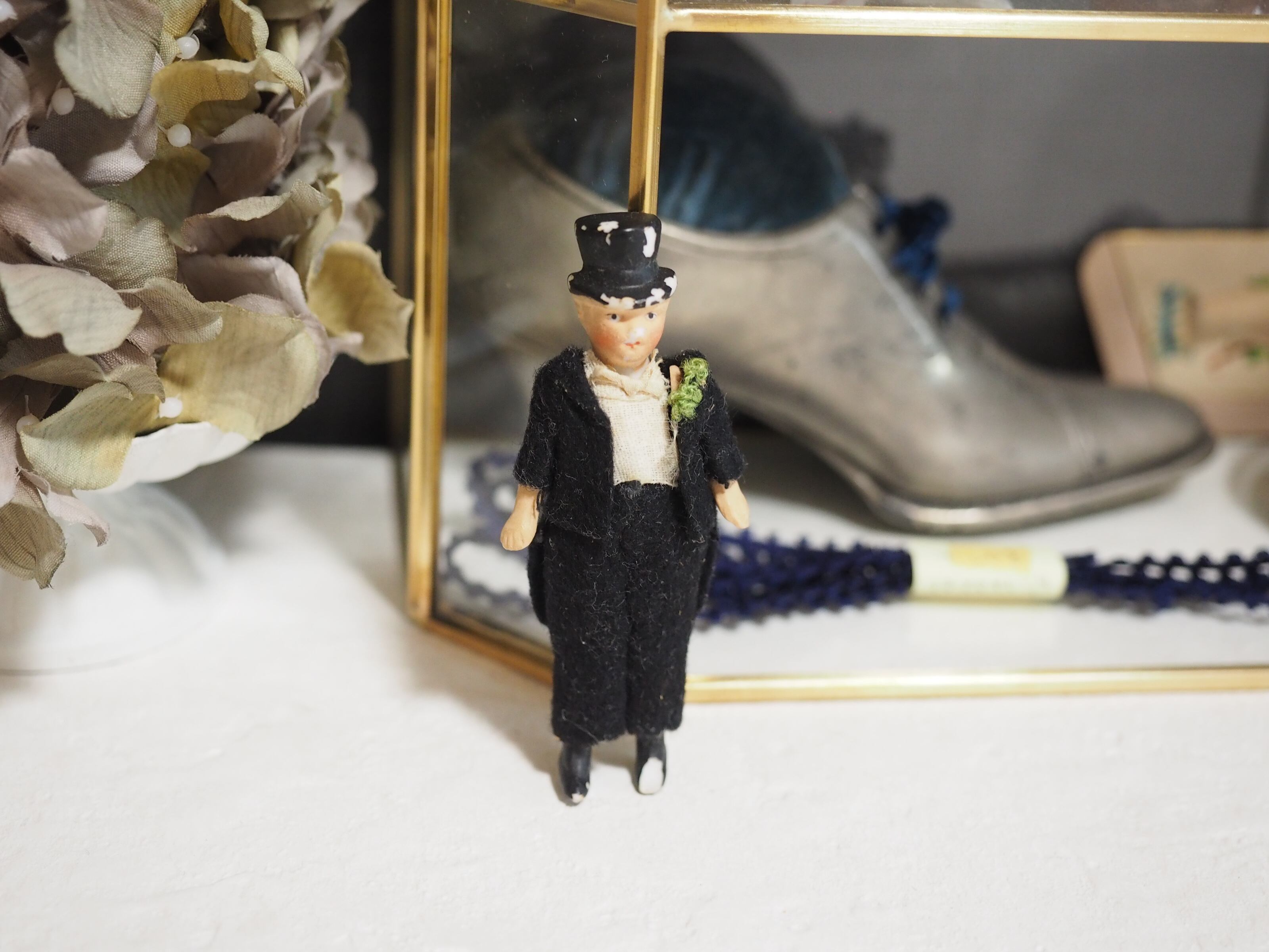 シルクハットと胸にはタイ、タキシード姿の小さなビスクドール