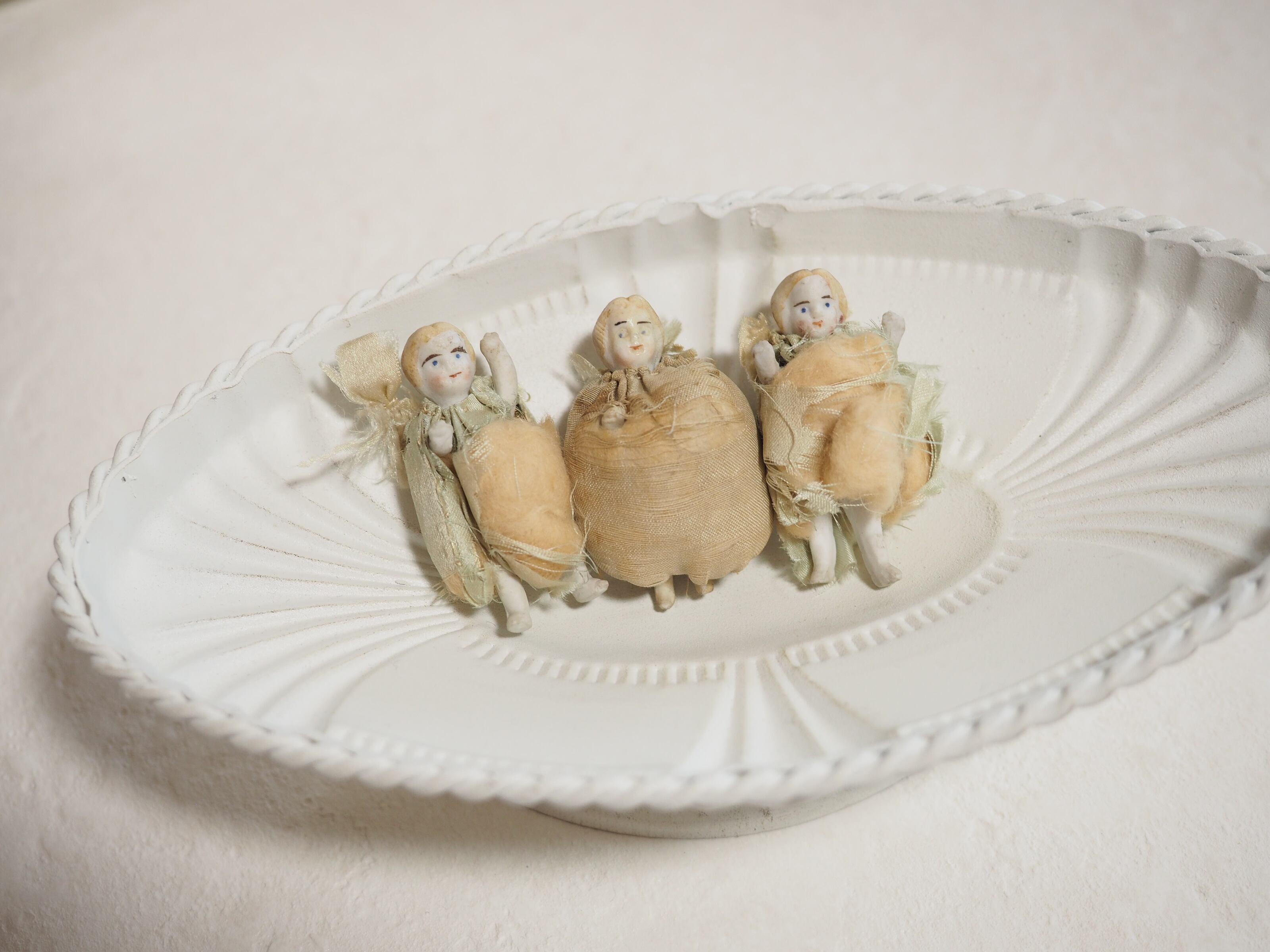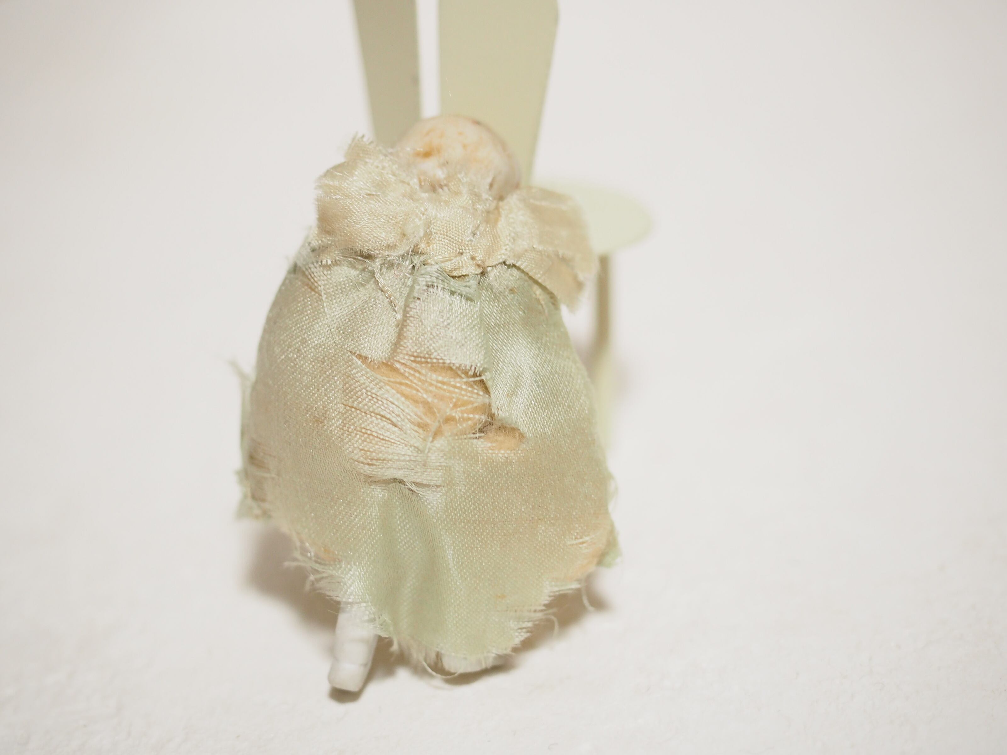 ピンクッションドールのようにシルククッションに詰められ足が出ていたと思われますが、シルク生地が裂け、羊毛が出ています。
