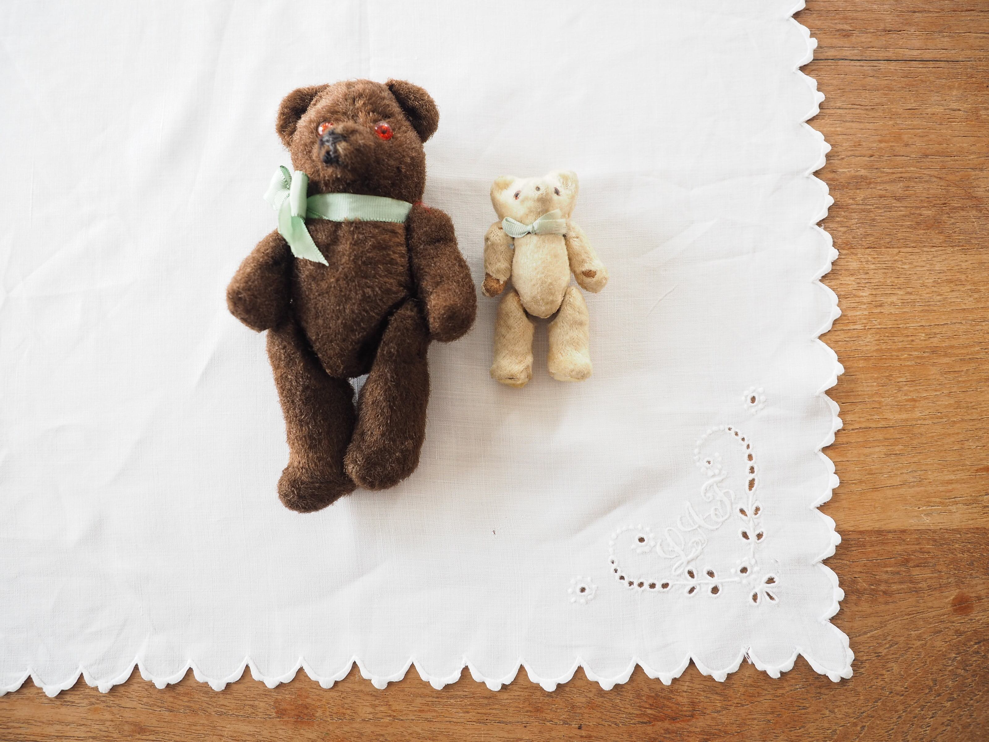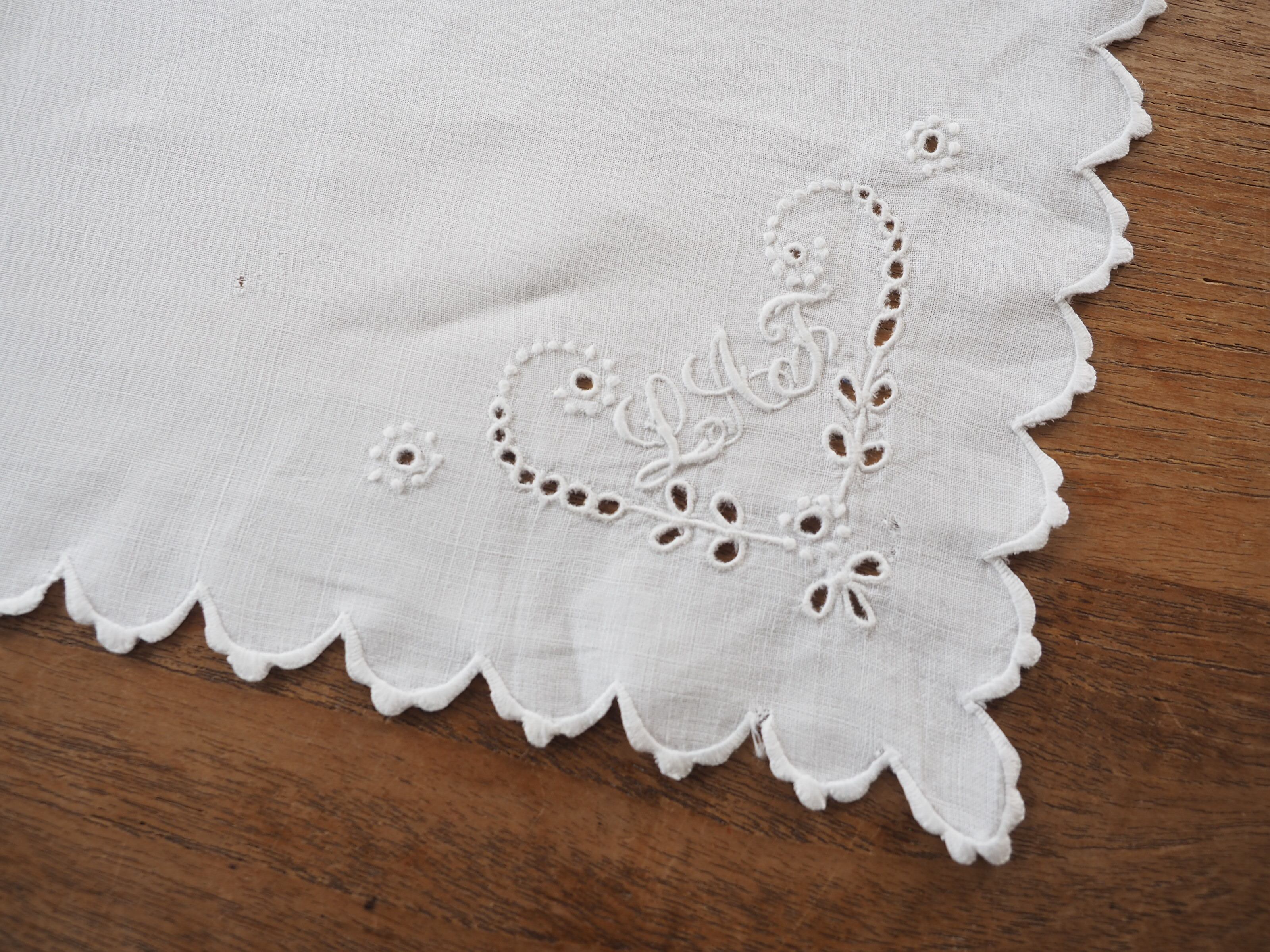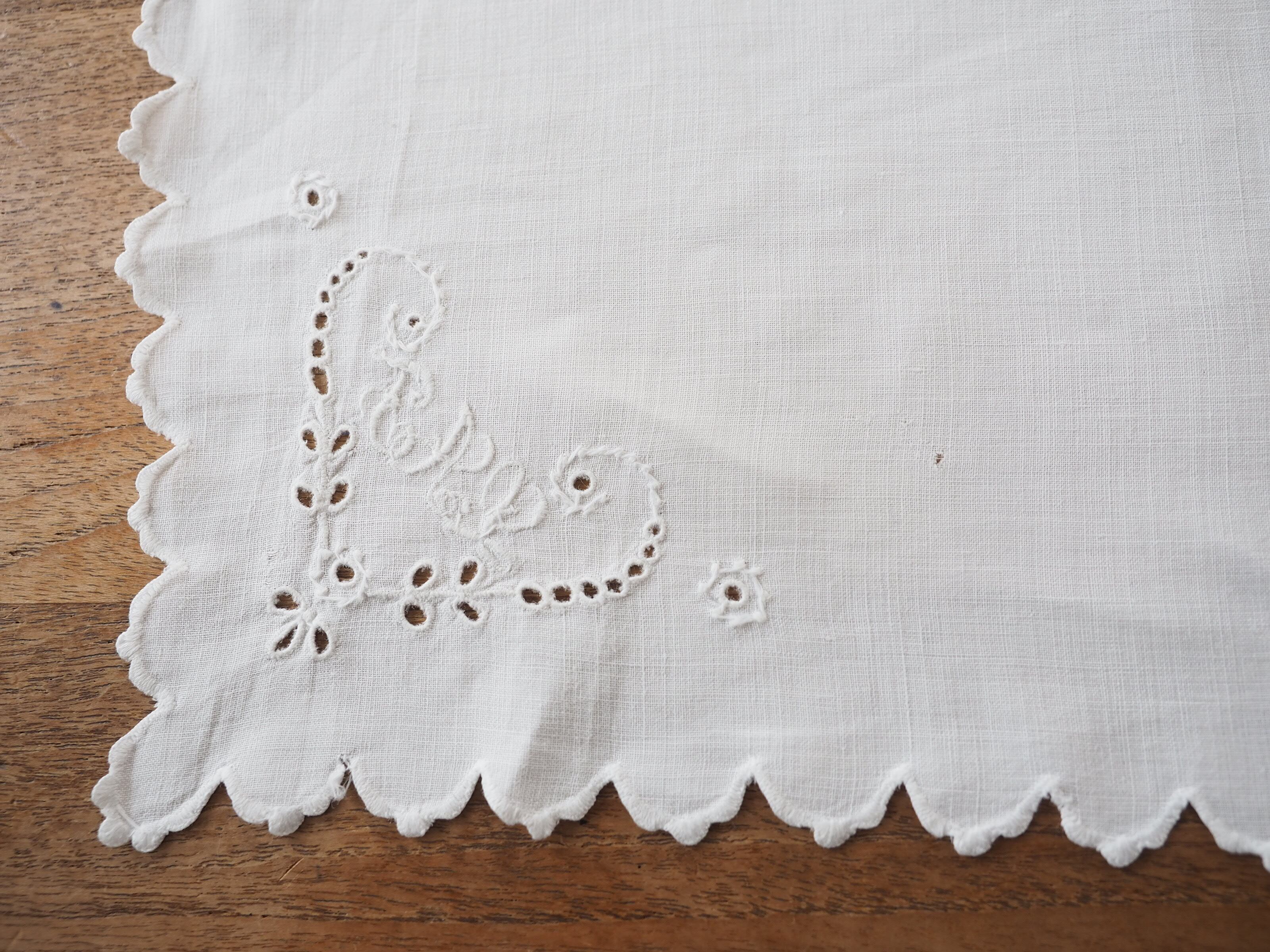 コーナーは素敵なイニシャルと、小さな穴をステッチでかがったアイレット刺繍で植物をハートにかたどったモチーフです。
