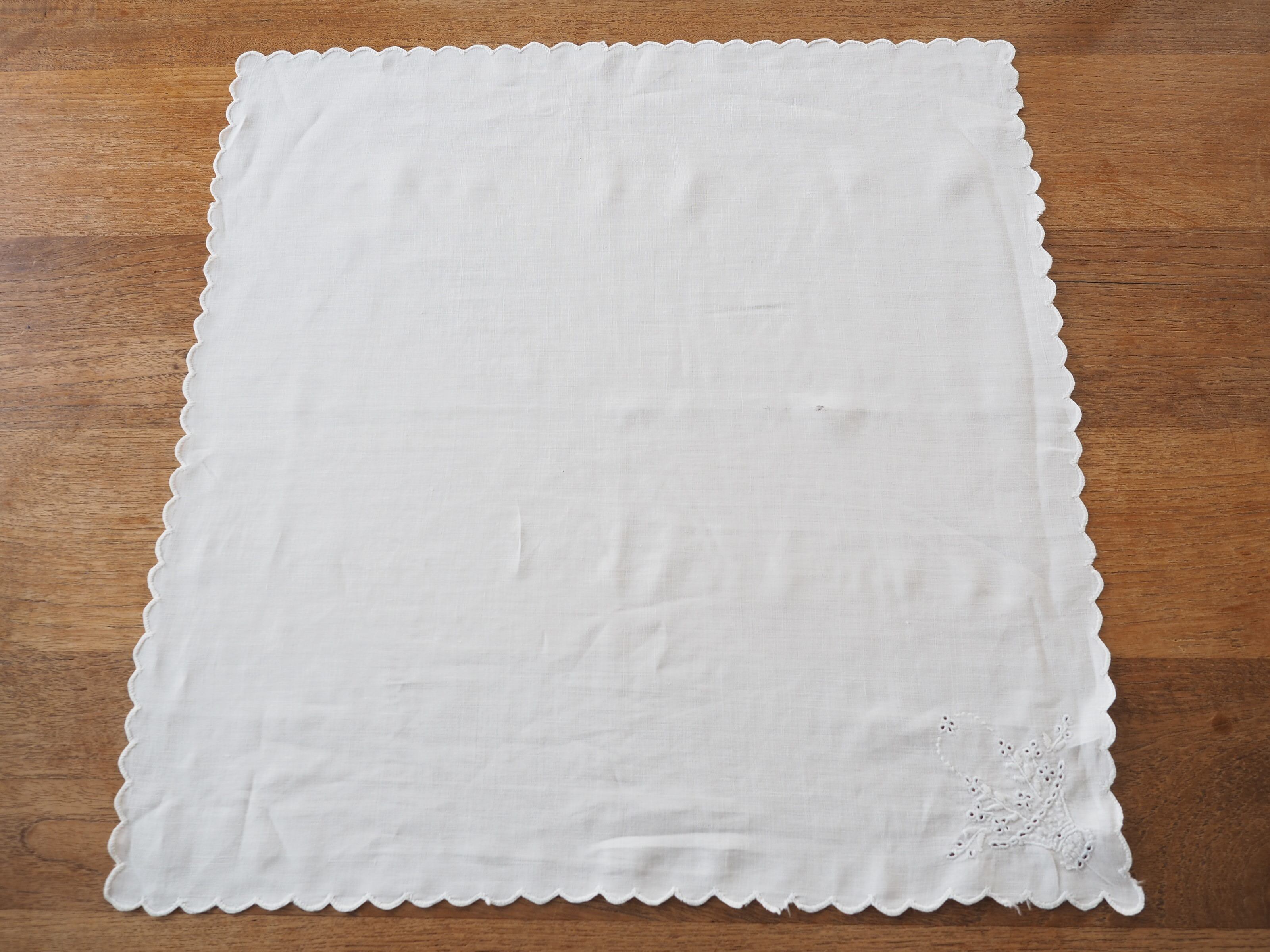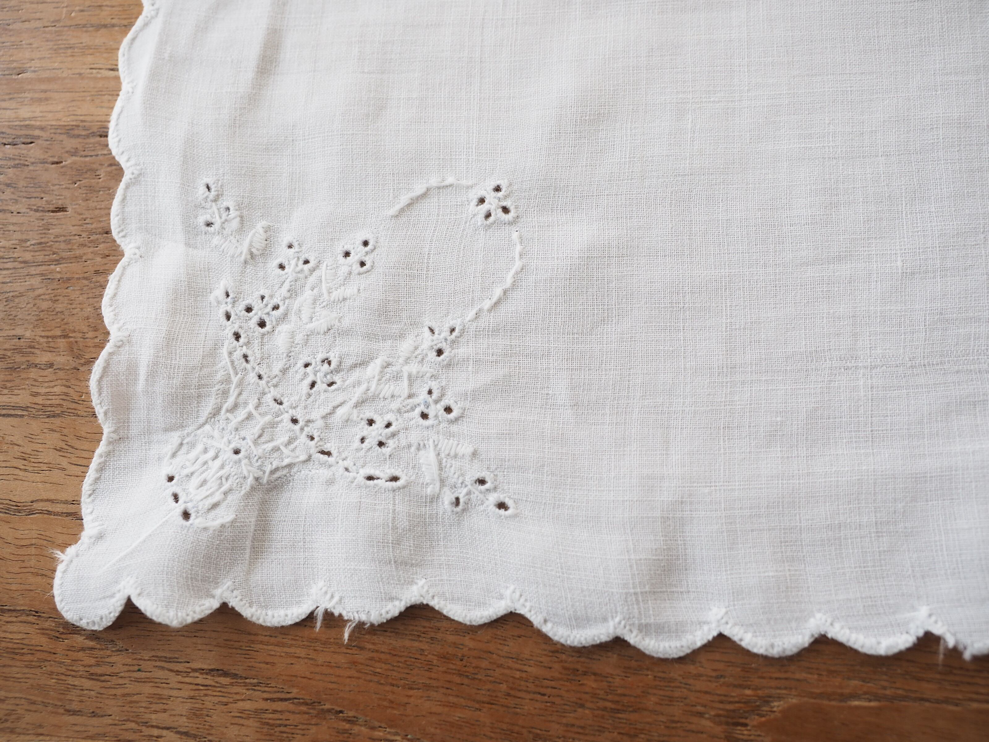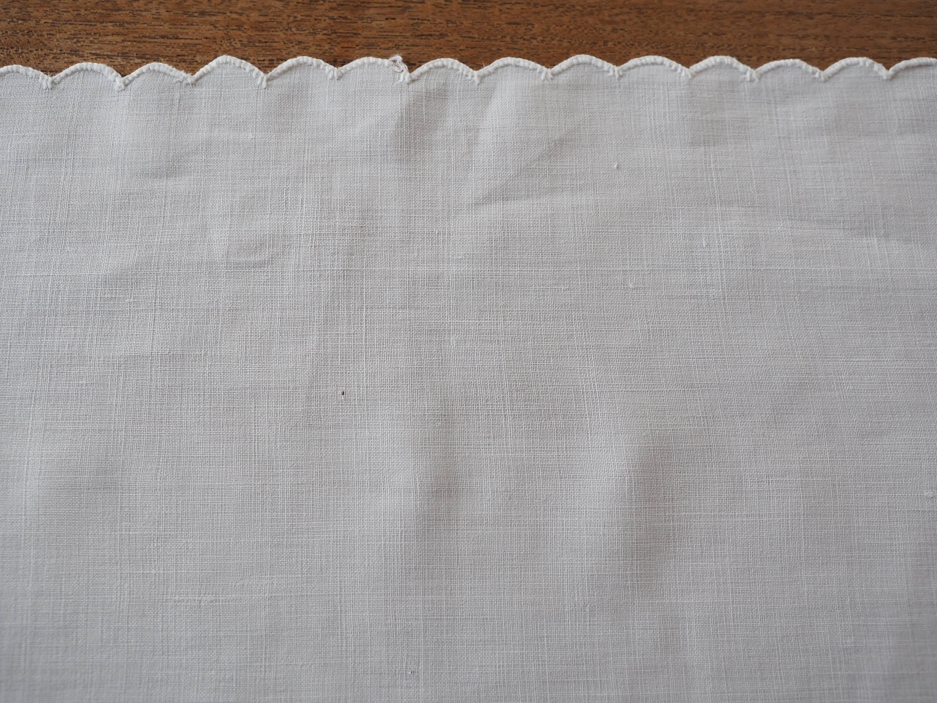 シンプルなコーナー刺繍のナプキンですが、ぐるっと縁に施されたスカラップもとても素敵です。