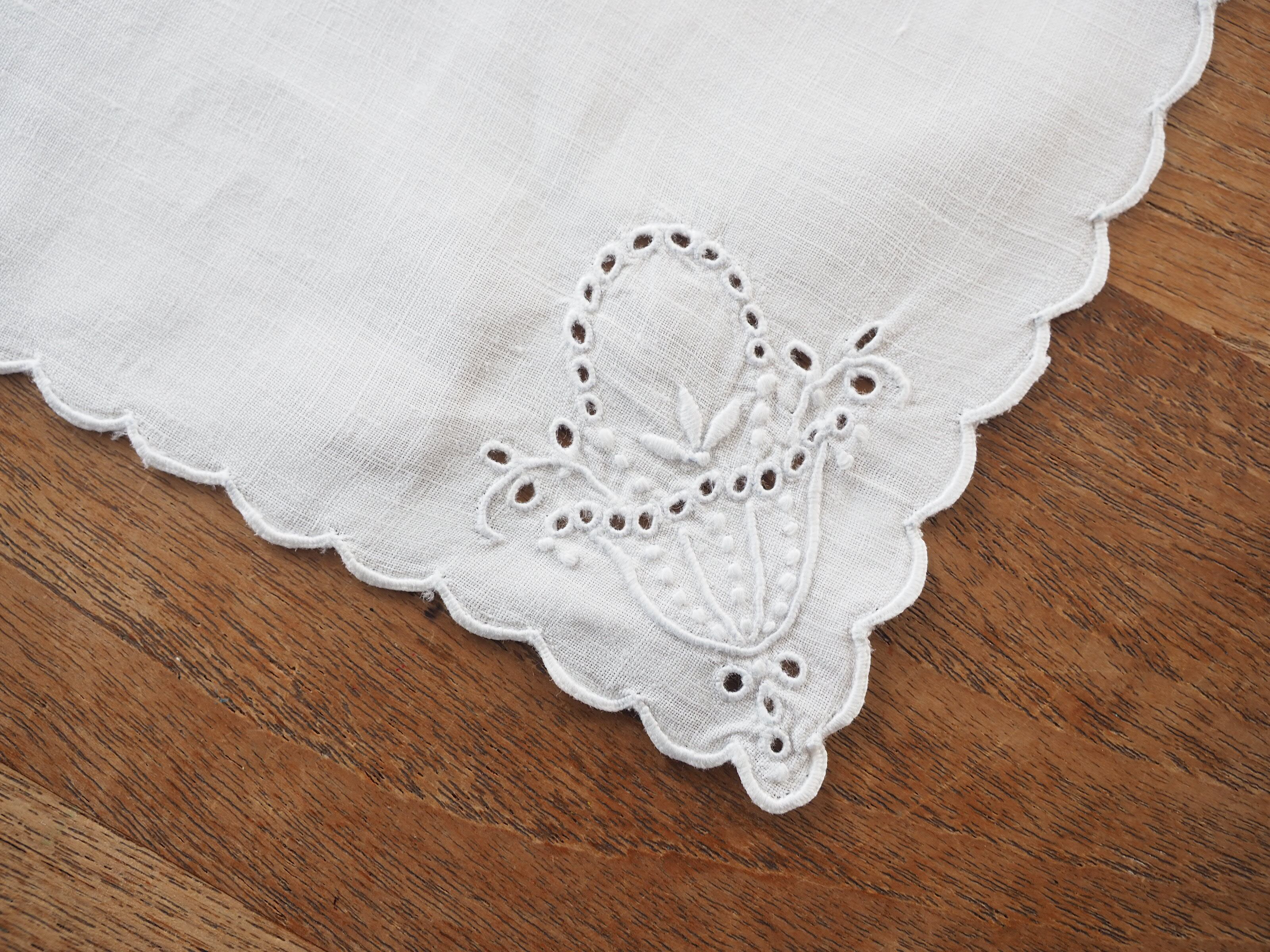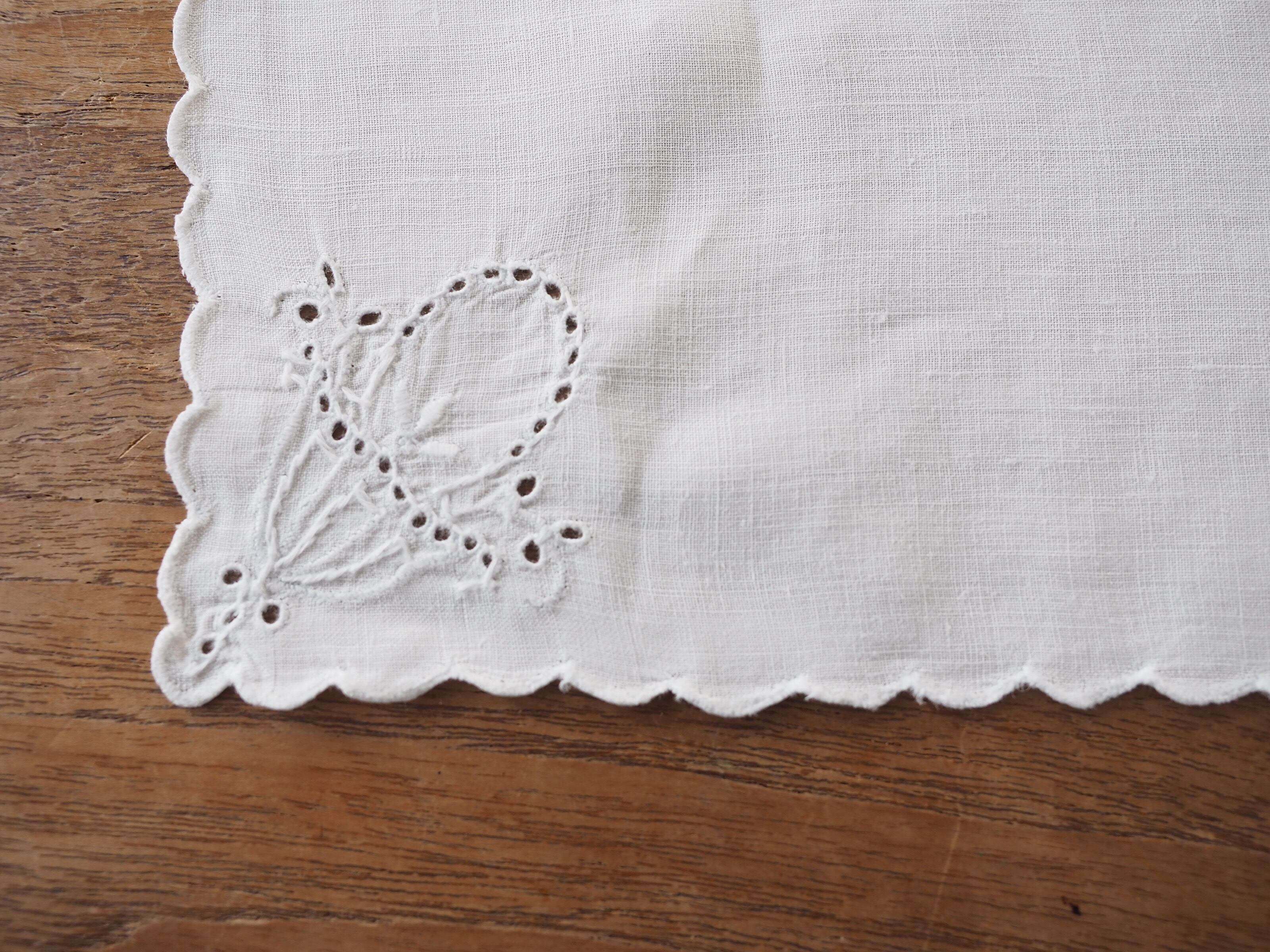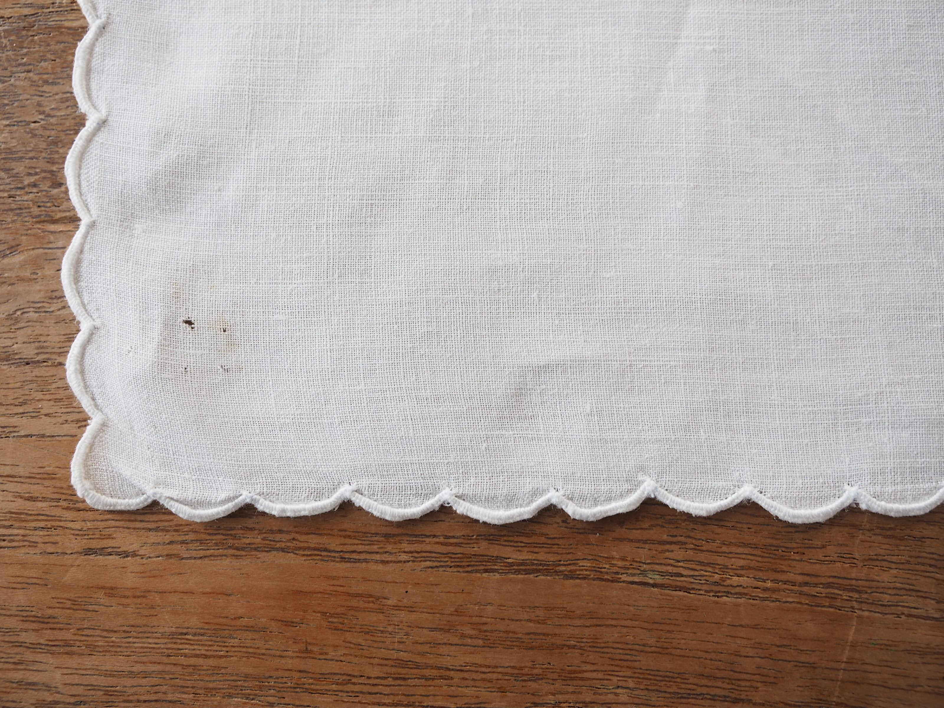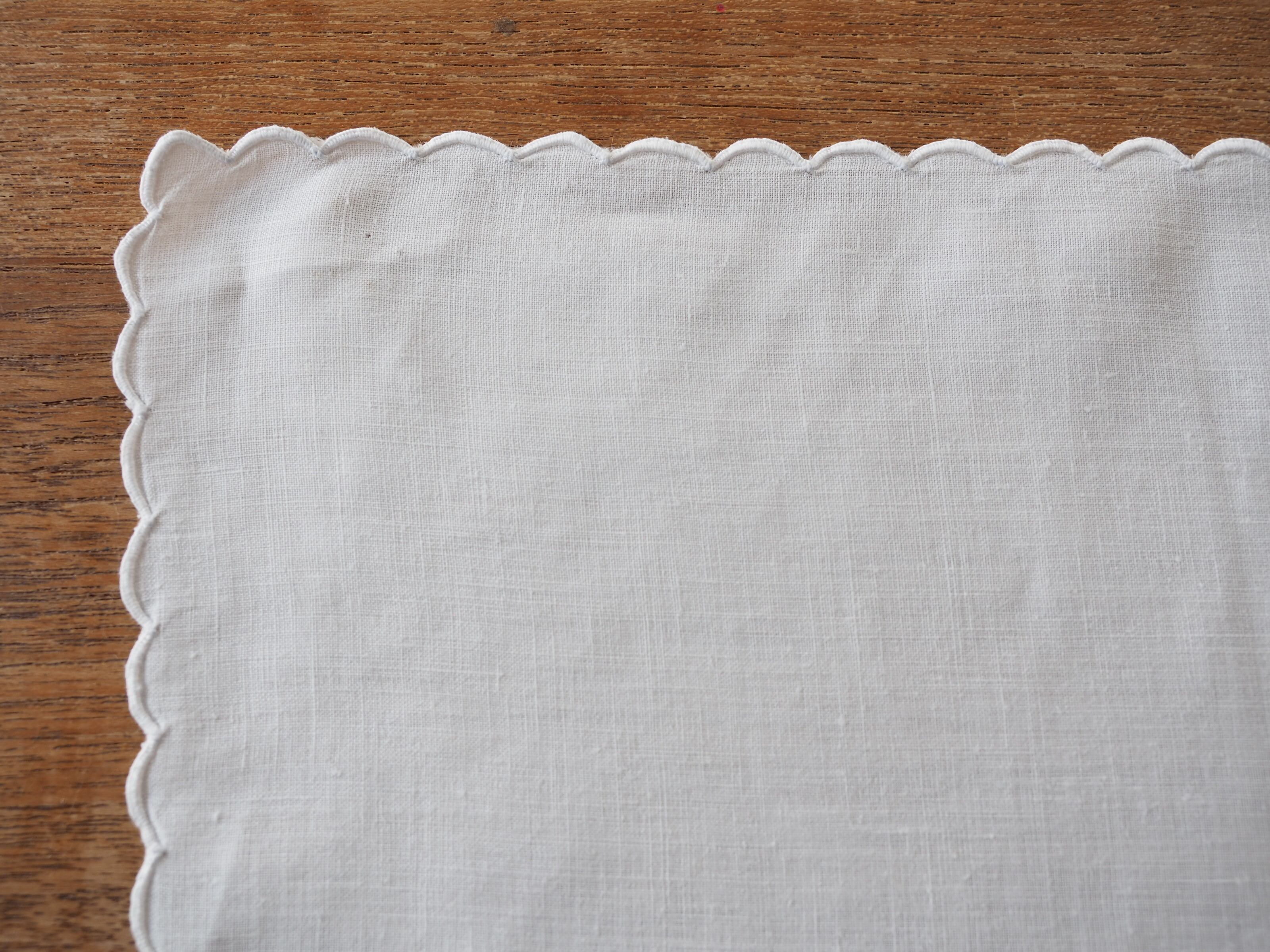 シンプルなコーナー刺繍のナプキンですが、ぐるっと縁に施されたスカラップもとても素敵です。