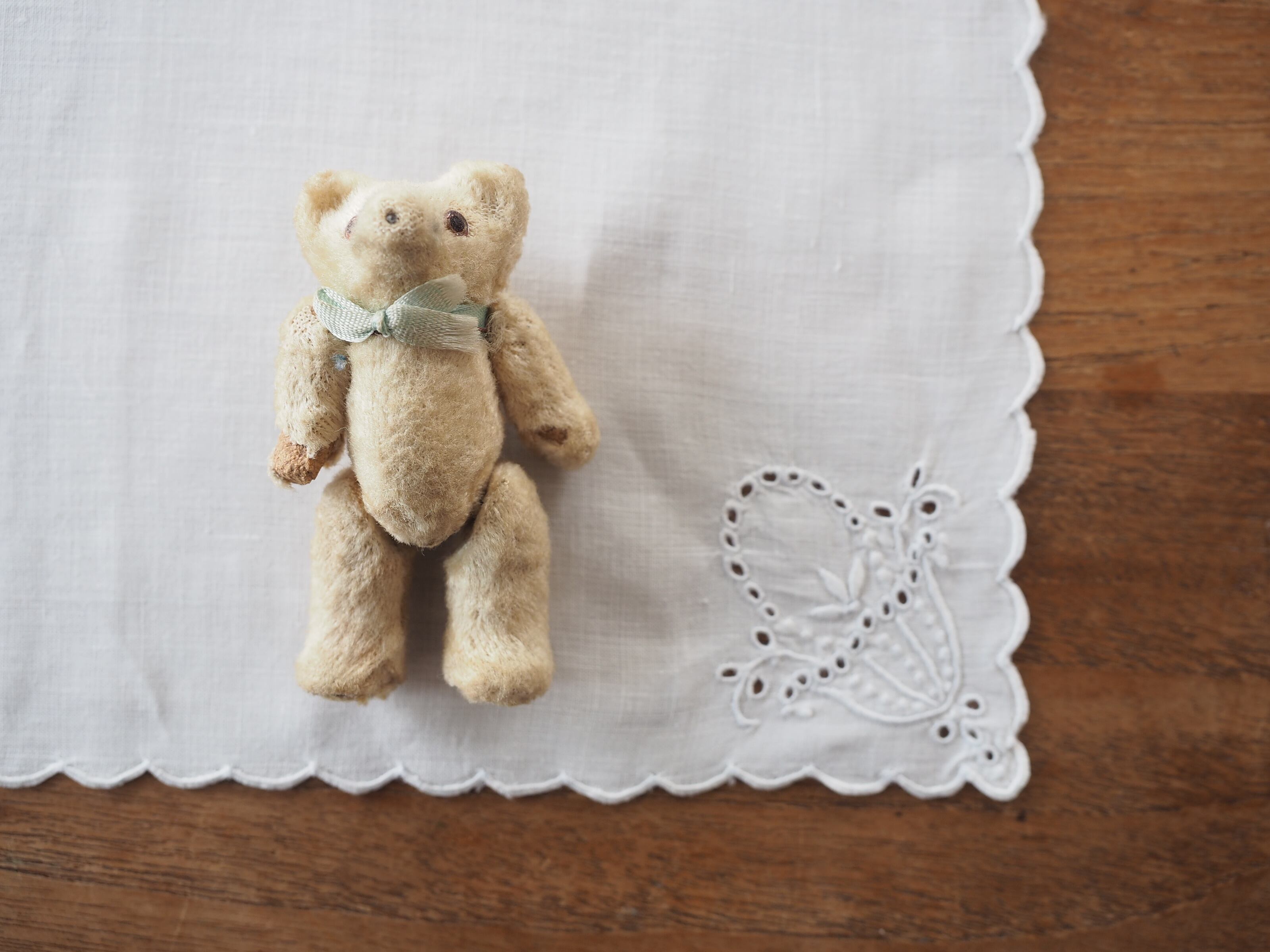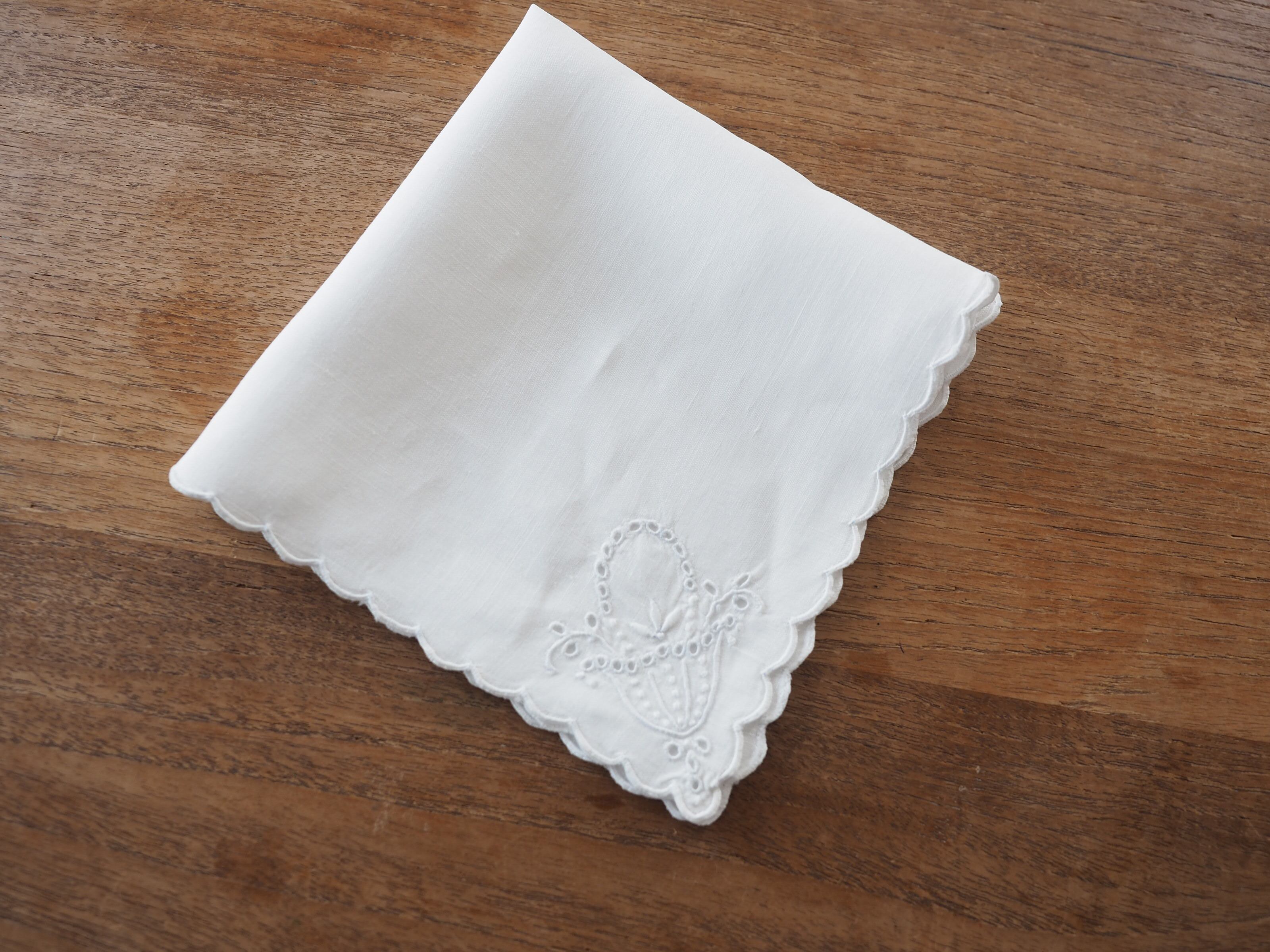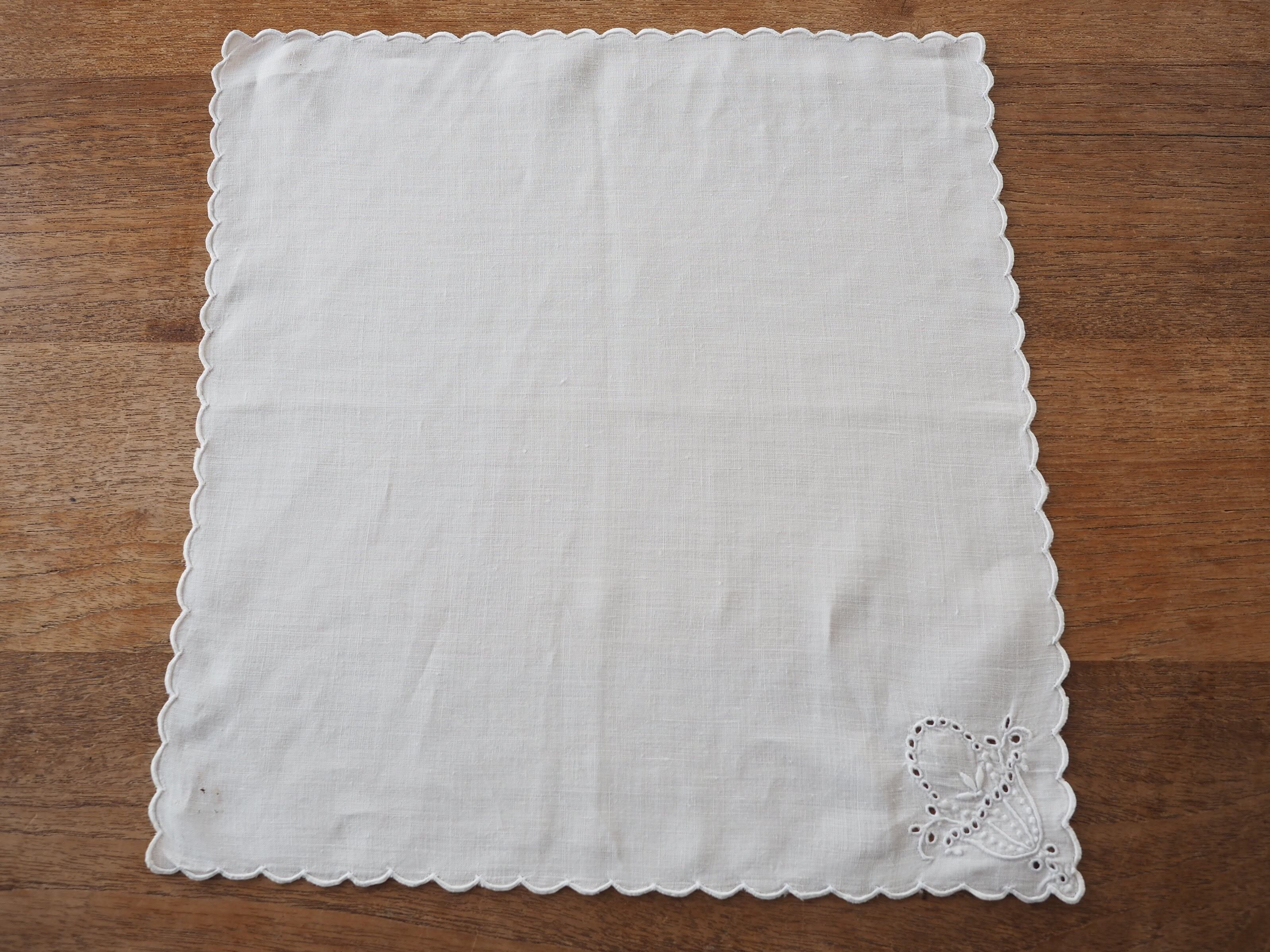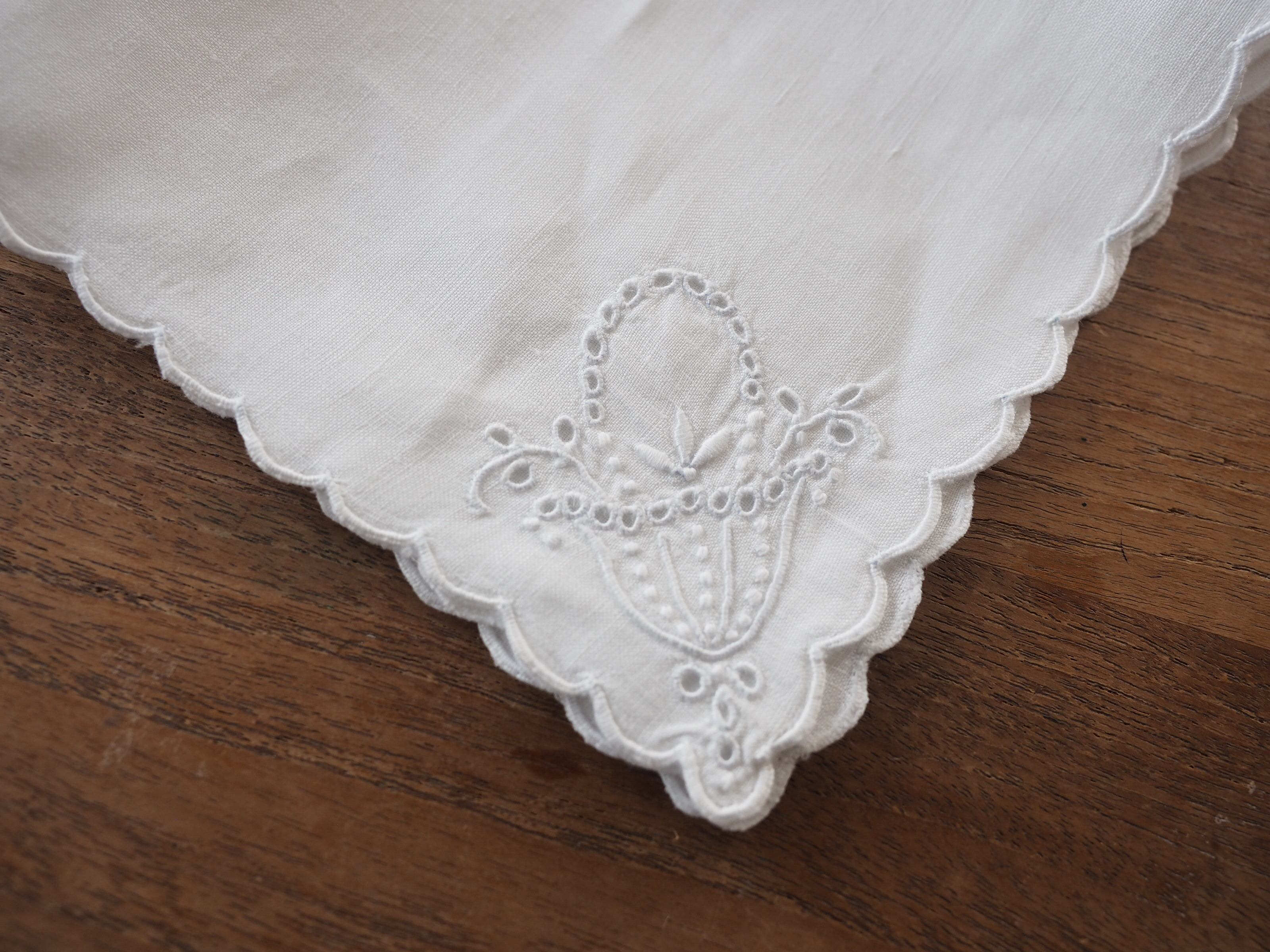 シンプルなコーナー刺繍のナプキンですが、ぐるっと縁に施されたスカラップもとても素敵です。