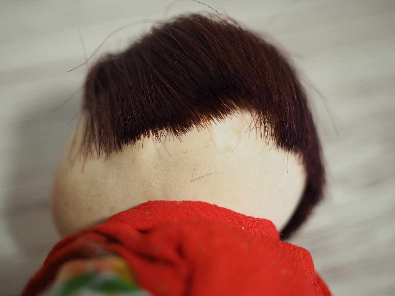 おかっぱヘアは頭頂部が黒く、全体的に赤紫がかっていて後ろ側は黒っぽいお色です。やや乱れあり。