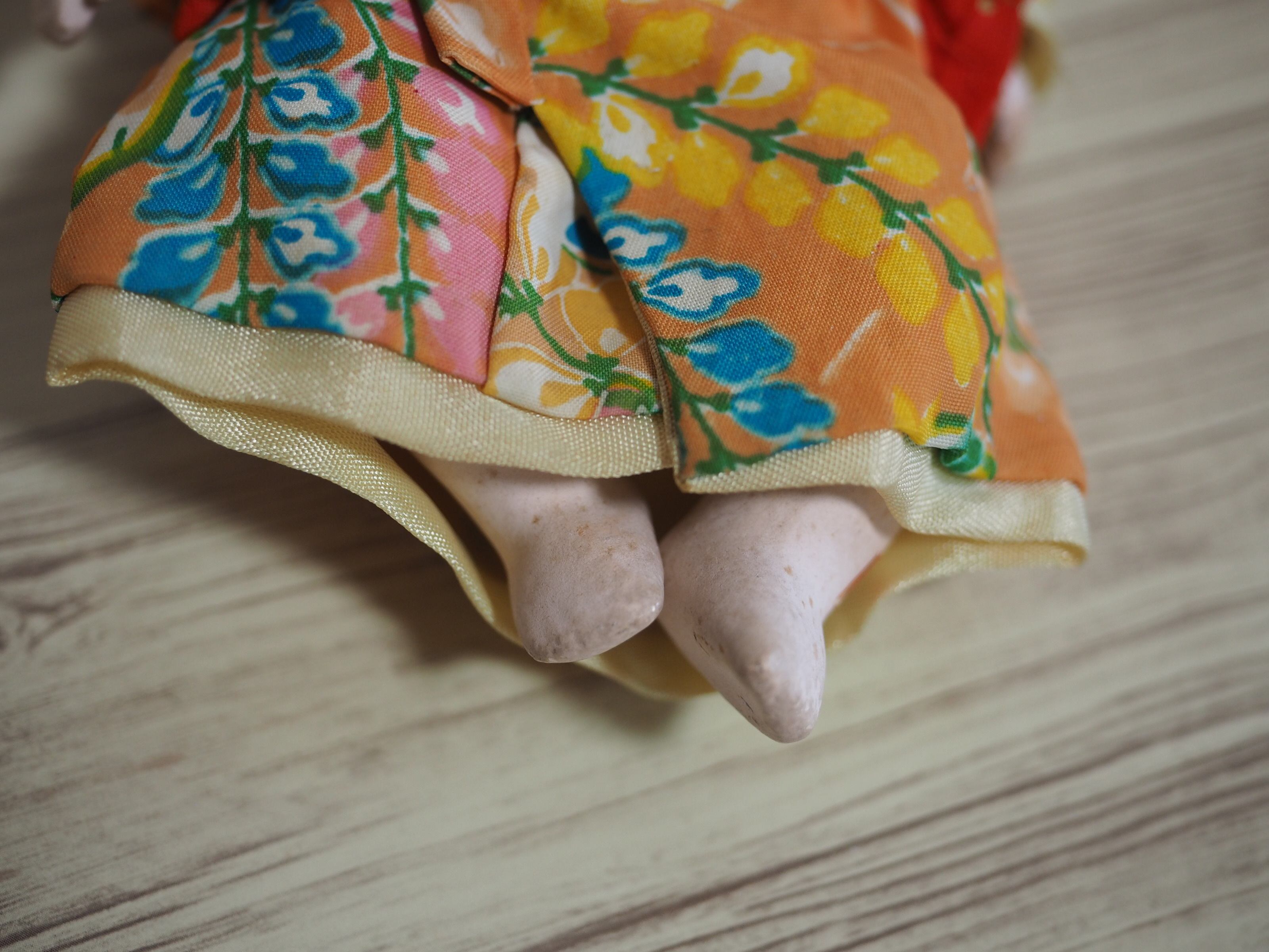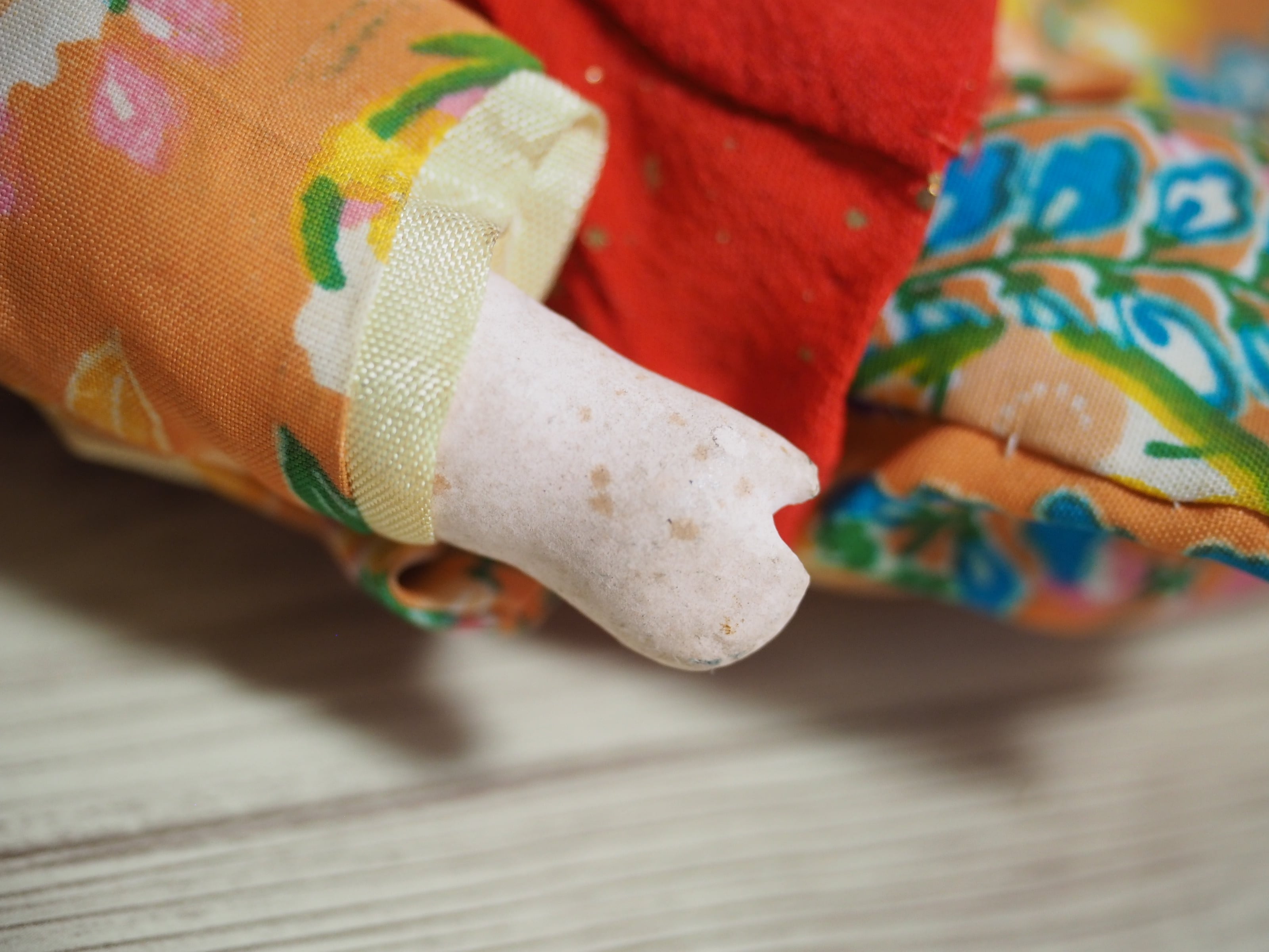 胡粉と言われるお人形ですが、手足に点々とシミがあり、お顔は黄色みがかっています。