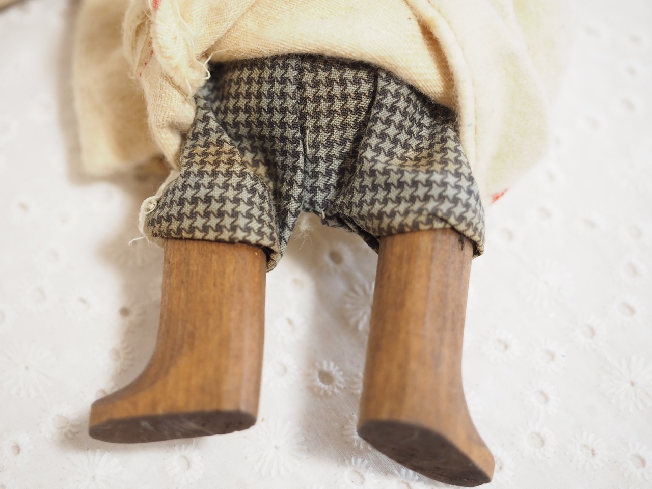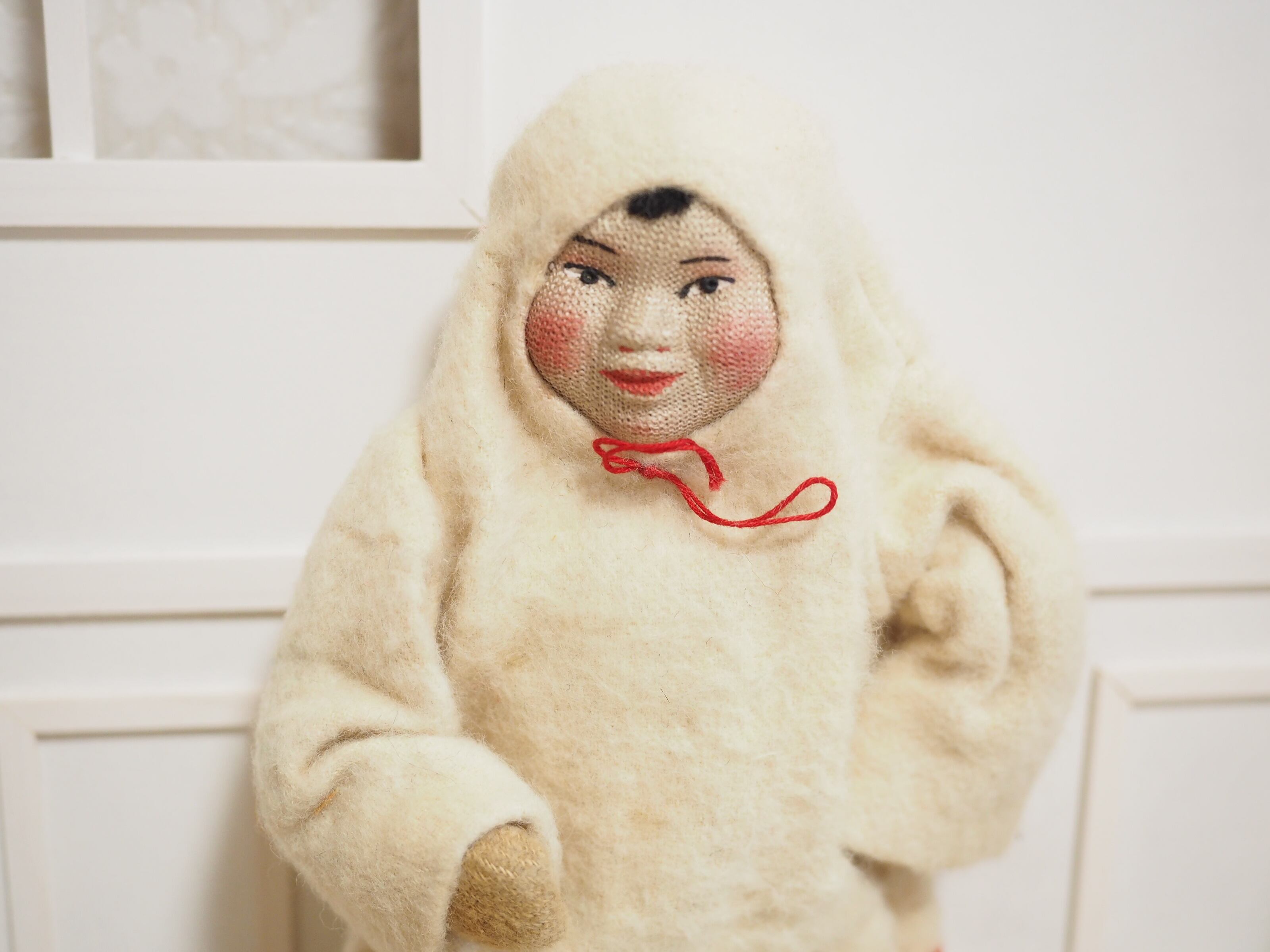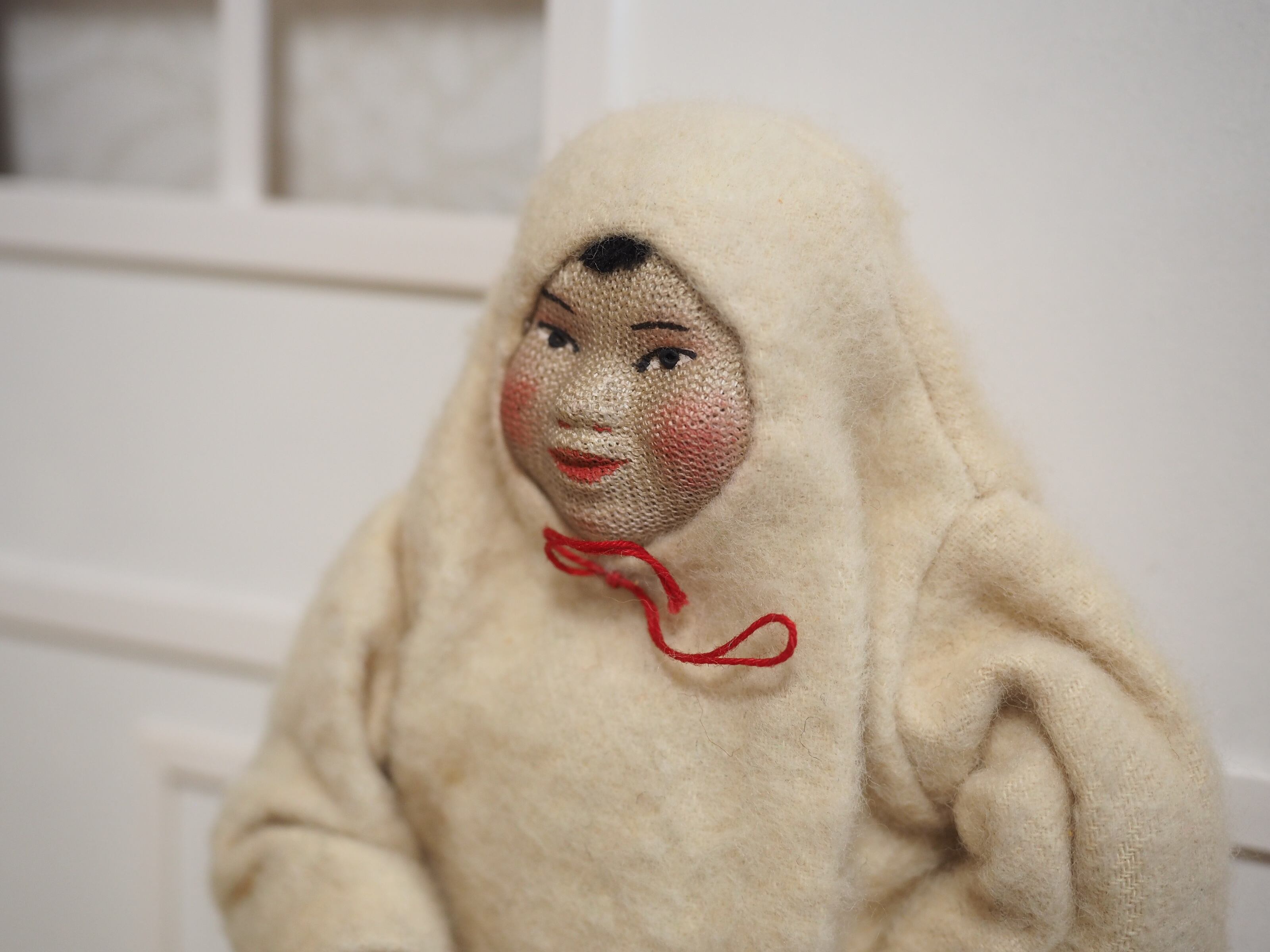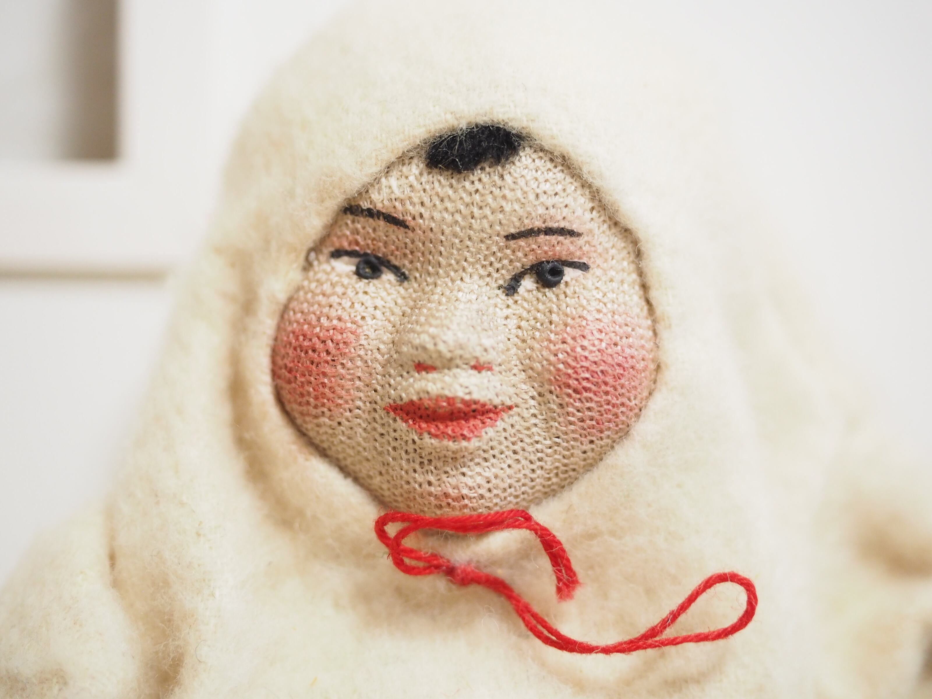 腕脚はおそらくワイヤー入り、Stockinette と言われるメリヤス編みを糊で固めたようなお顔です。