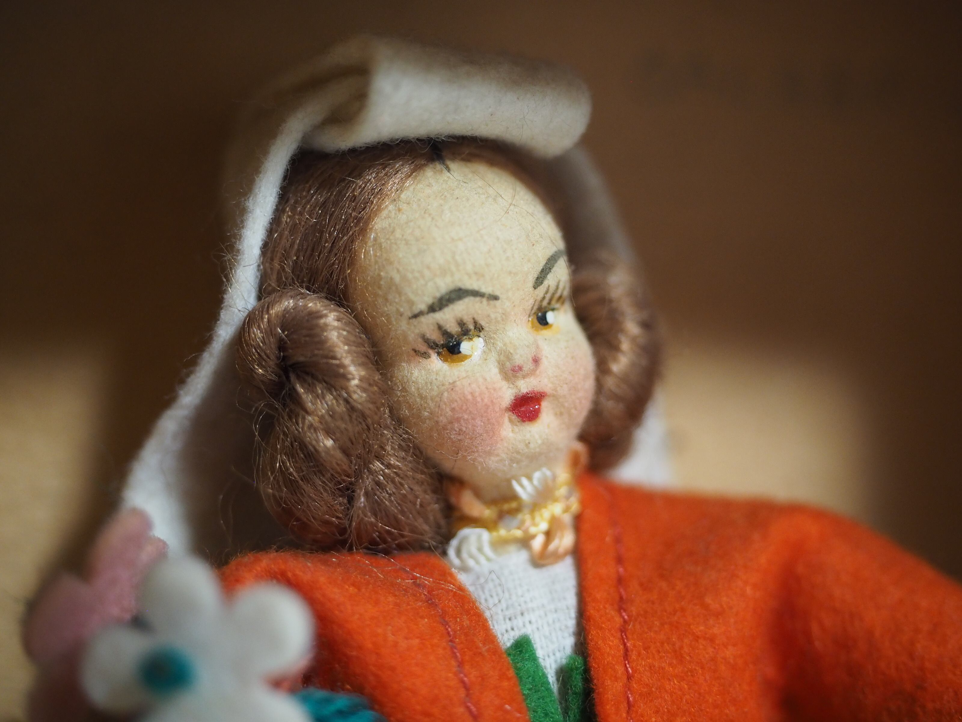 お顔は1.5×2.5㎝くらいの小ささですが、美しいペイントにふっくらした成形、くるくると巻かれたヘアもきれいです。