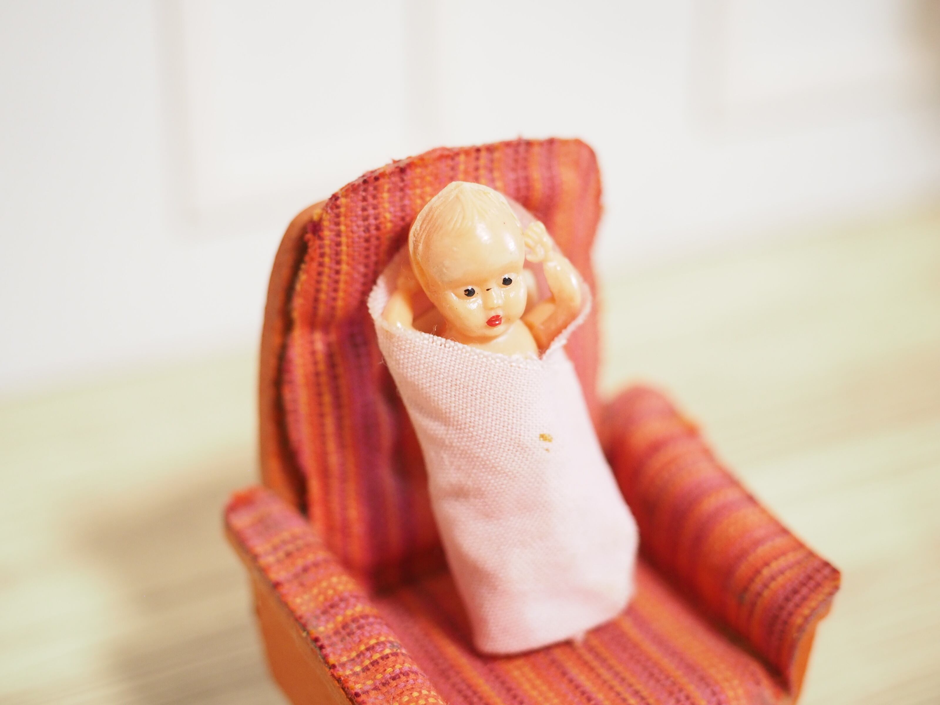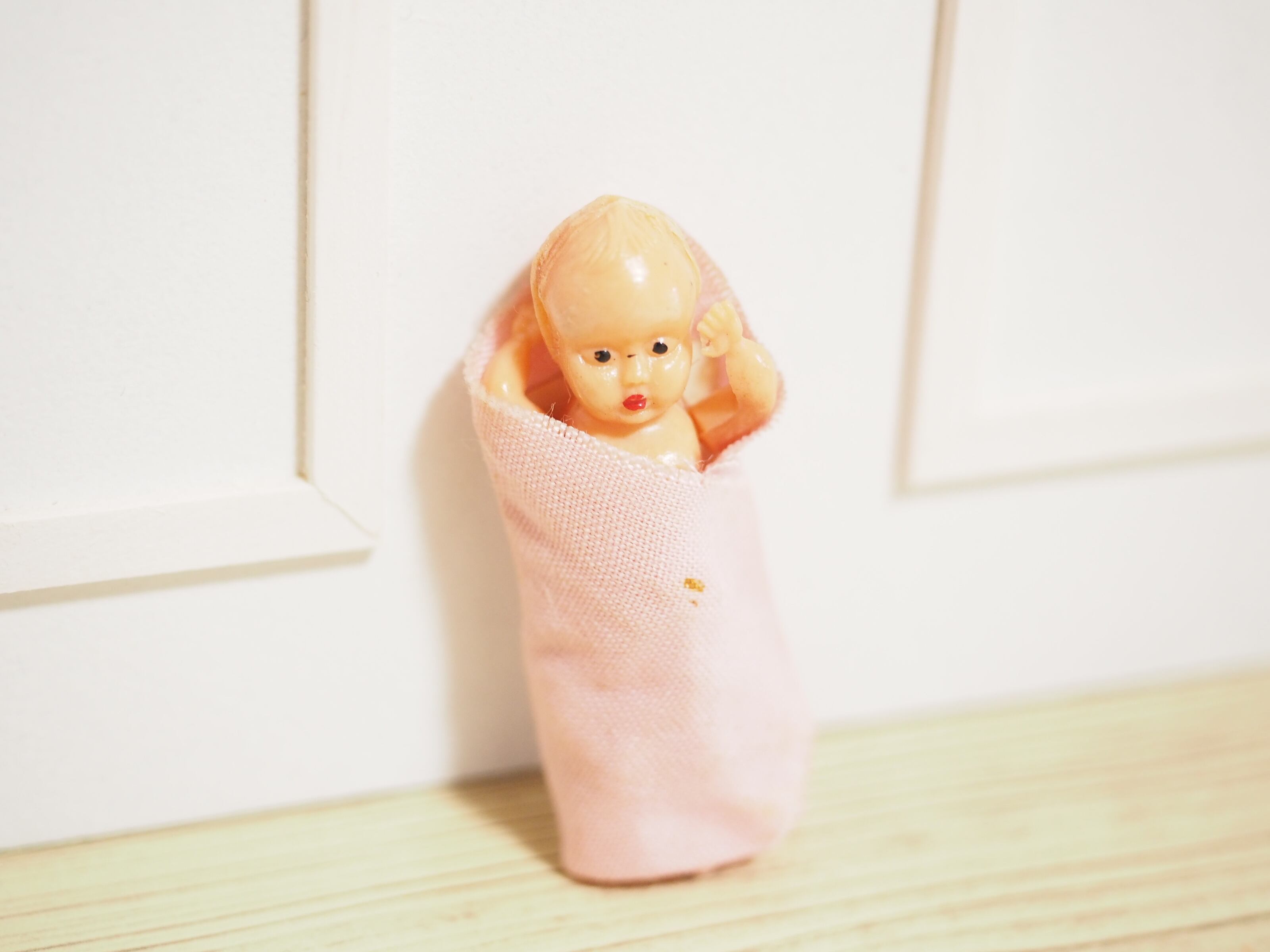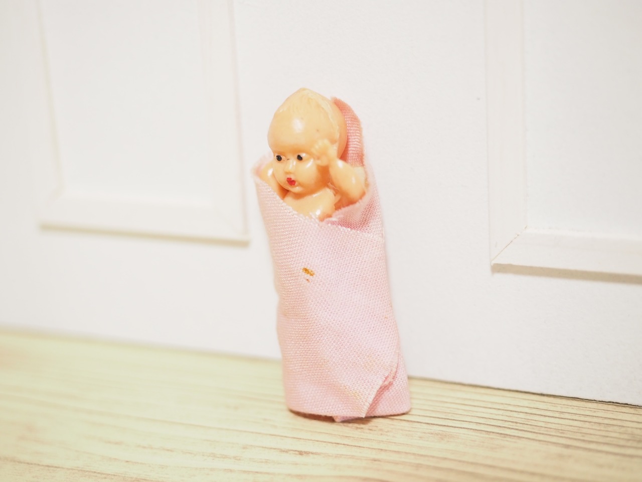 つぶらな黒い瞳に赤いリップ、鼻の人中もしっかりあります。目と目の間に黒くペイント飛び線あり。