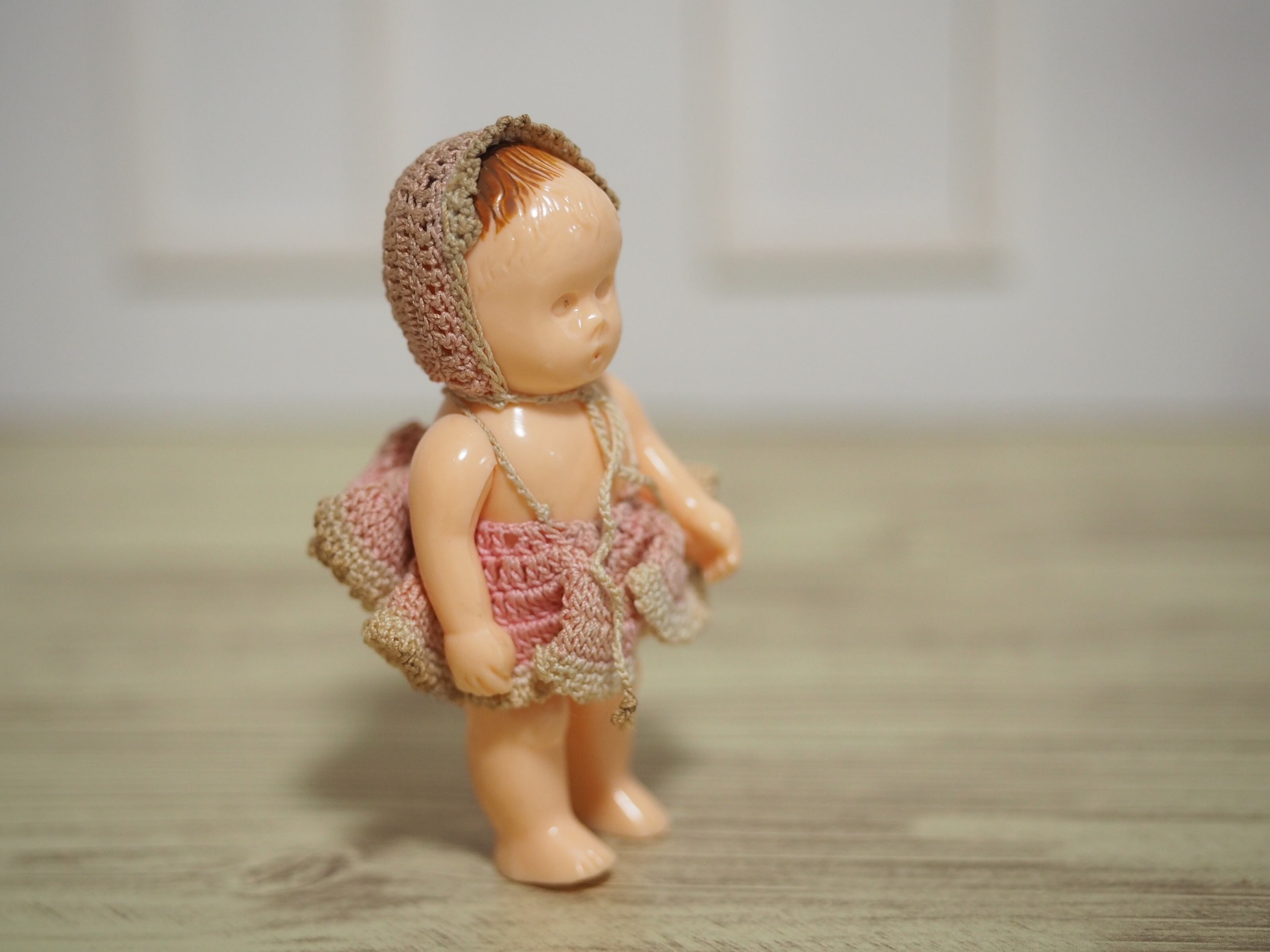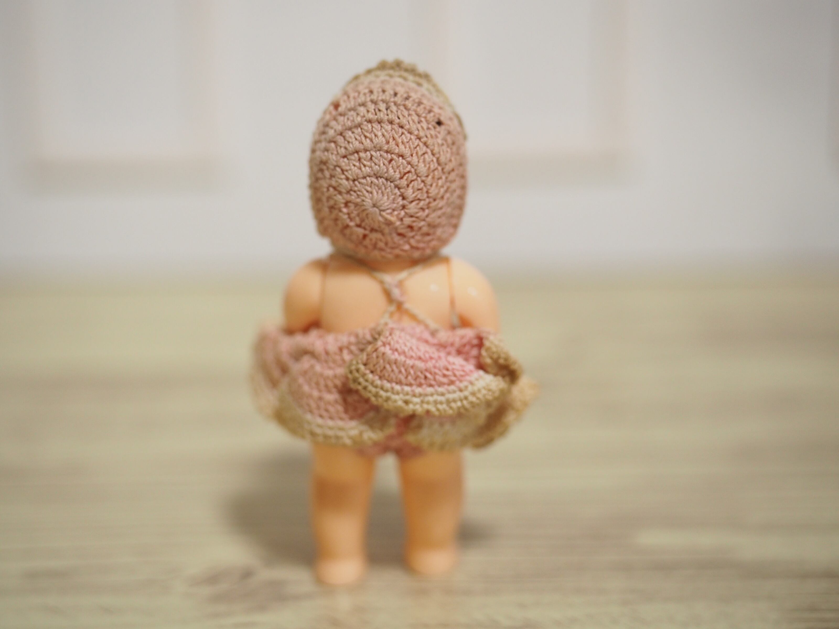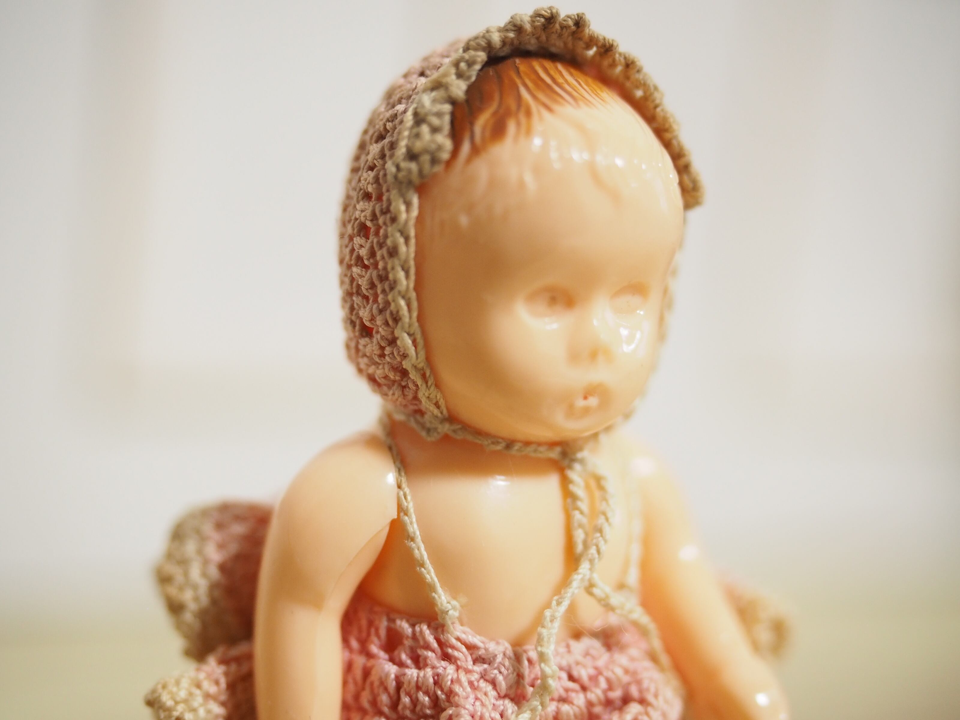 細い針で編まれたお洋服は素晴らしく、スイム帽のようなぴったりした帽子にひらひらしたスカートがおしゃれ。