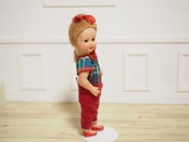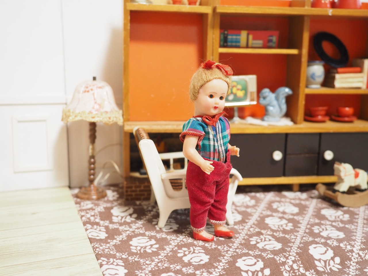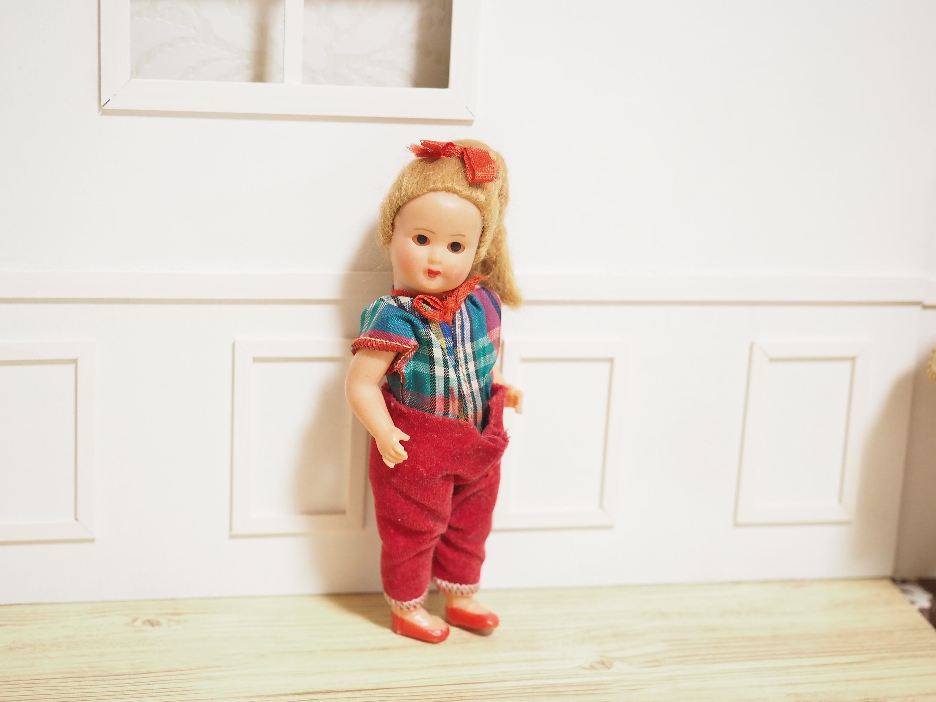 チェックのシャツとベルベットの褪せたズボン、ズボンはウエスト部分が取れてしまったようで前は破れています。お好みでリボンなどを着けてもかわいいと思います。